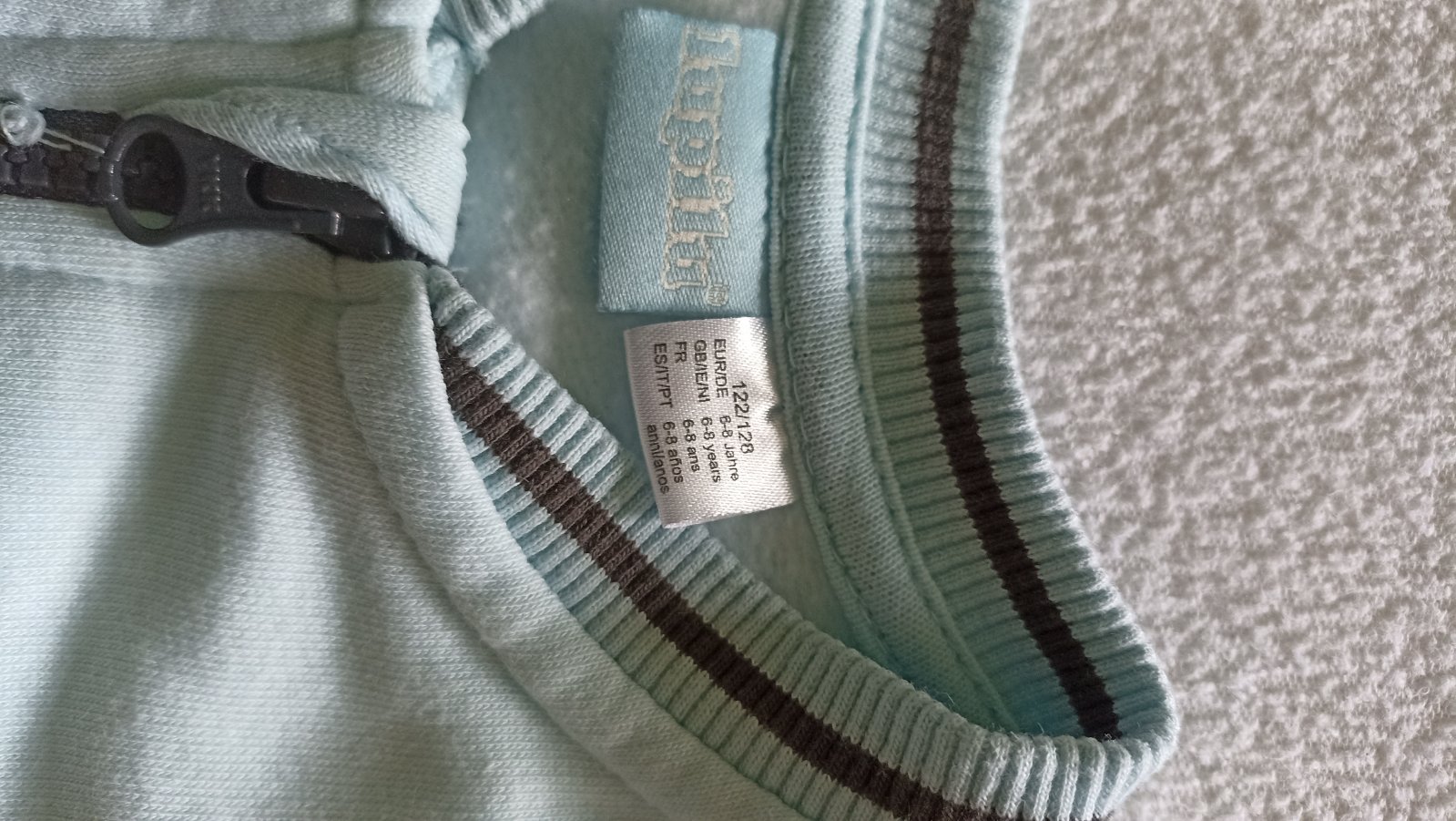 Veľkosť 122/128 - aj sedí. Veľmi dobrý nosený stav. Chĺpky sú miestami zľahnuté a na bežci (na zipse) sa niekde odlupuje farba. Na funkčnosti nič nemení. Naďalej vhodné aj do školy.