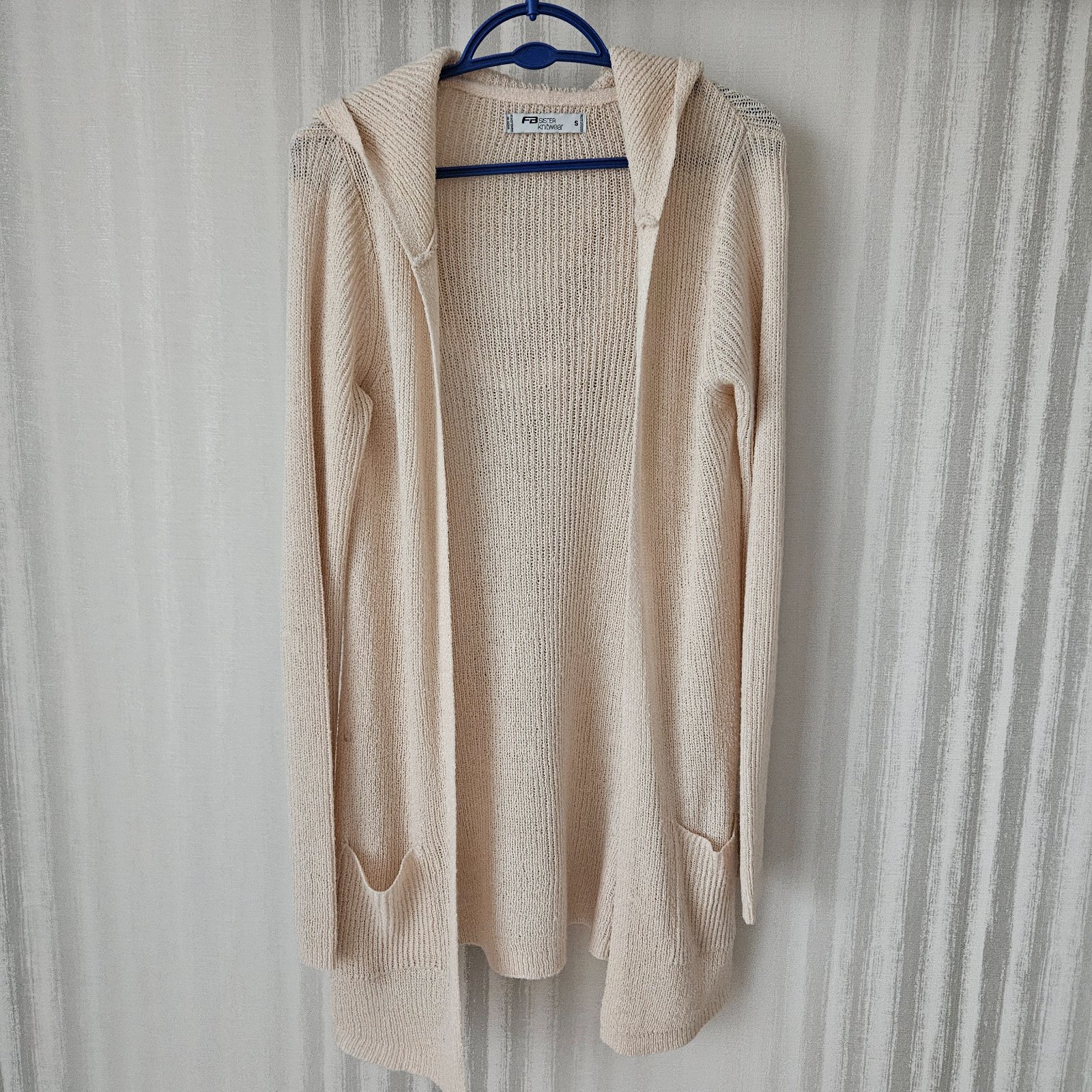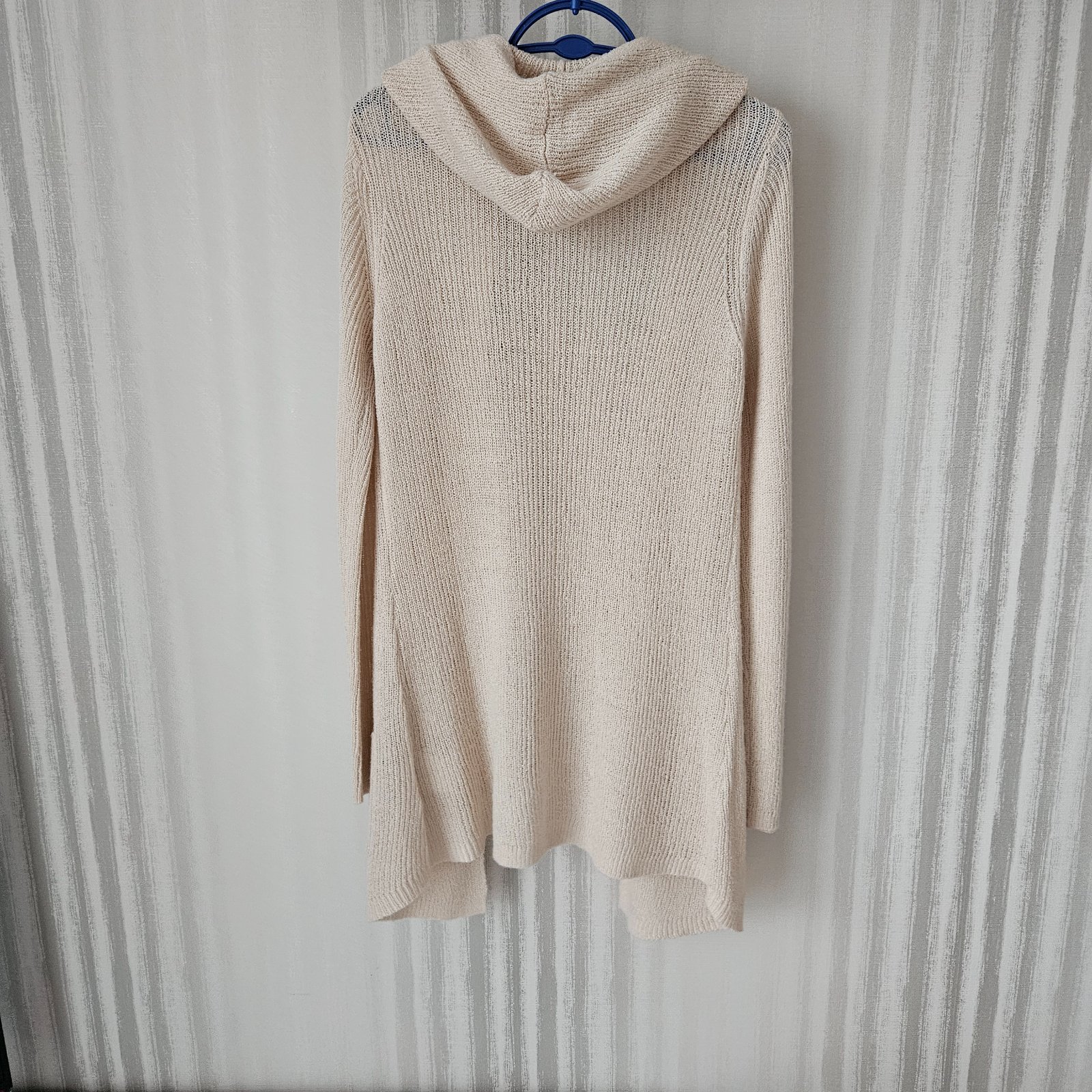 Dlhý kardigán bez zapínania s kapucňou, celková dĺžja 97cm.