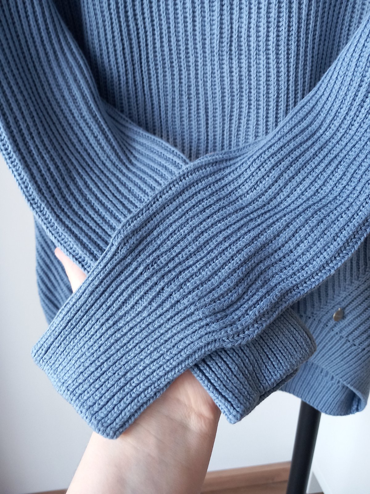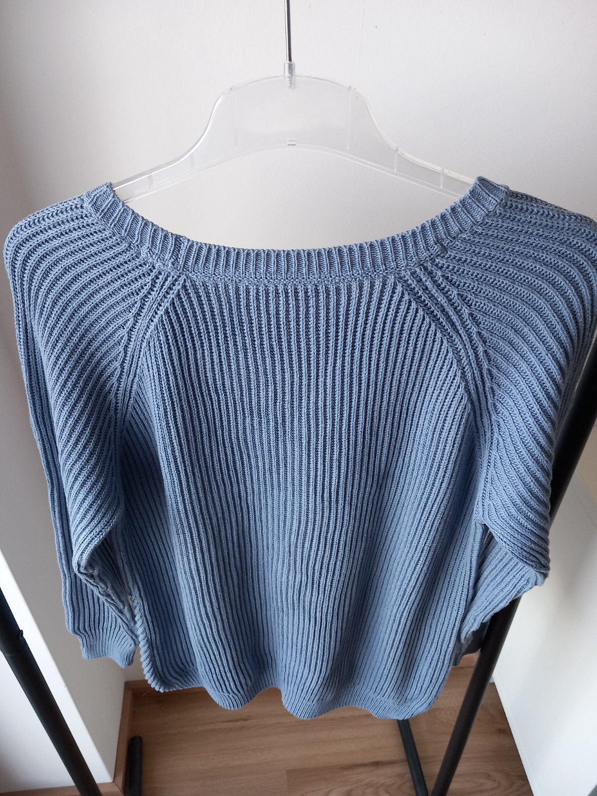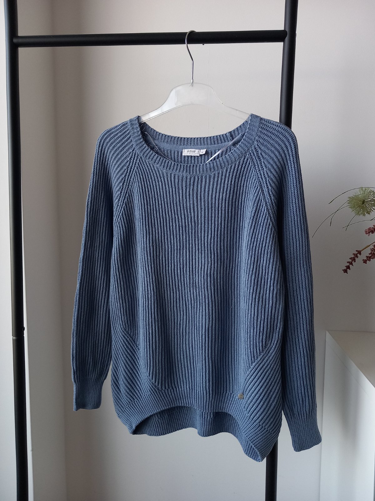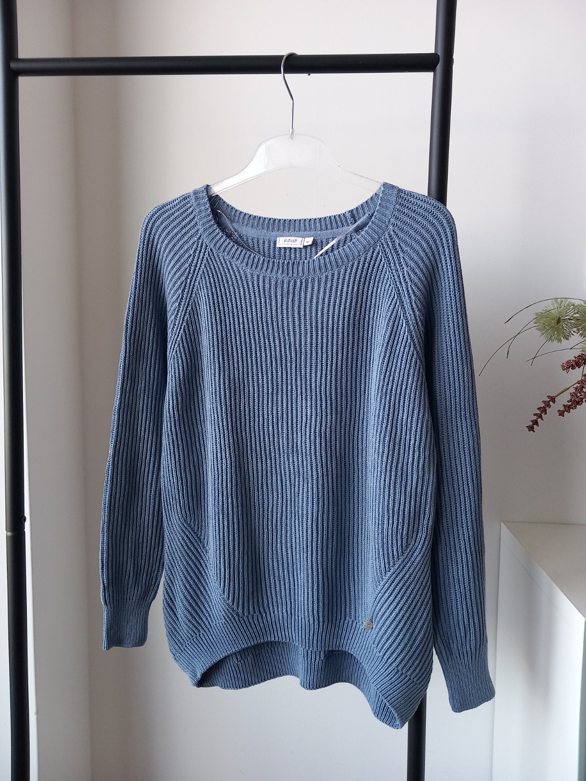 Tento preloved kúsok má okrúhly golier, ležérne raglánové rukávy, pružne pletený vzor a predĺžený zadný diel. Sveter je vyrobený z bavlny, je starostlivo pletený, mäkký na dotyk a veľmi príjemný na pokožke.