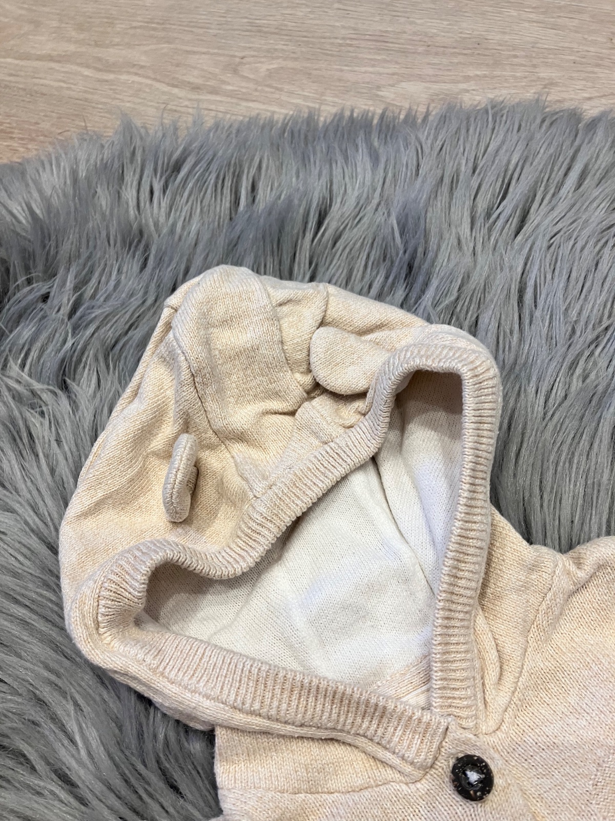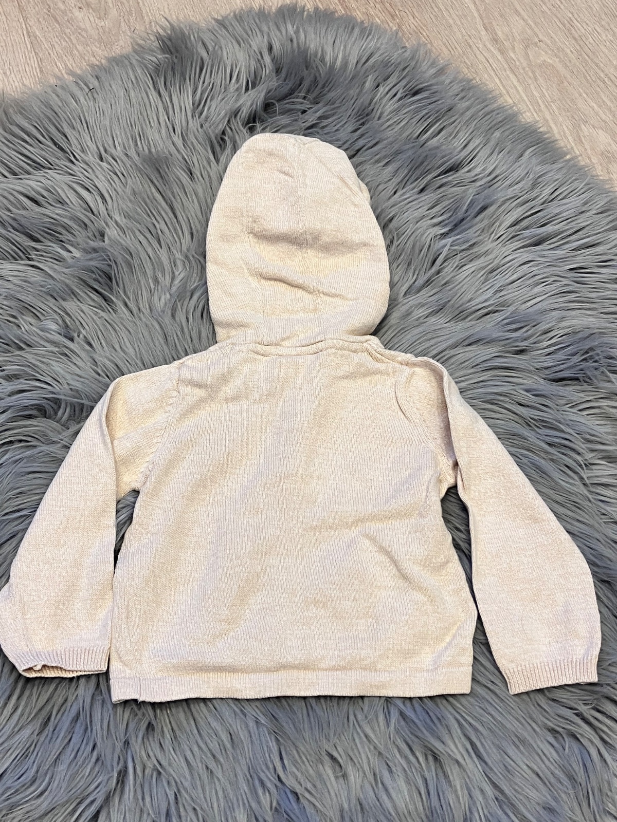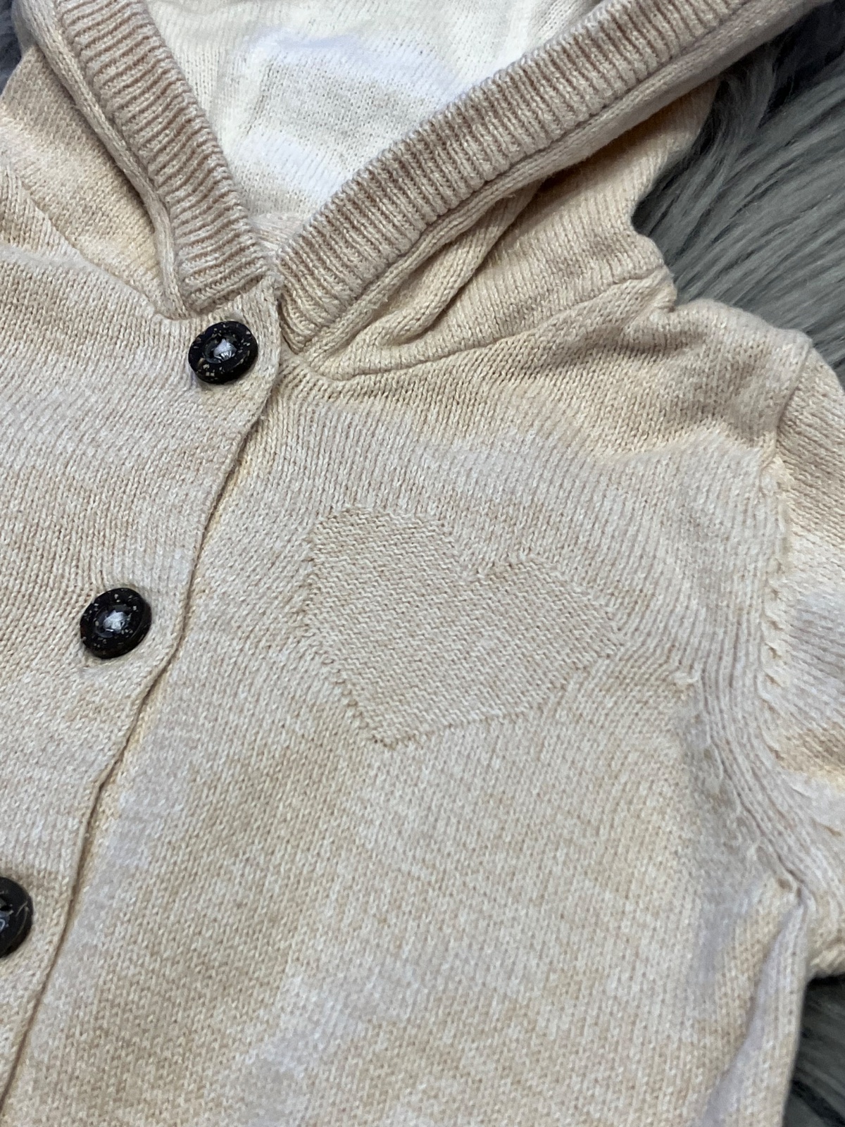 Dievčenský béžový sveter s kapucňou, motív srdiečko, zapínanie na gombíky, elastický, tenký, kapucňa s uškami.