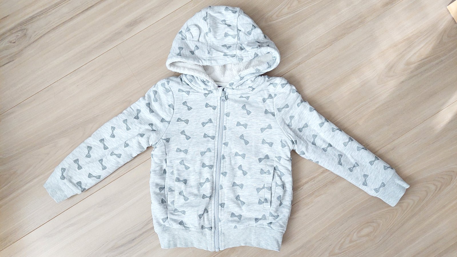 Predám dievčenskú mikinu číslo 110/116 (4-6 rokov). Je s kapucňou a vreckami. Je hrubá a zateplená. Nie je poškodená, nemá fľaky. Celková dĺžka je 43 cm aj s patentom, vnútorná dĺžka rukávov je 29 ...