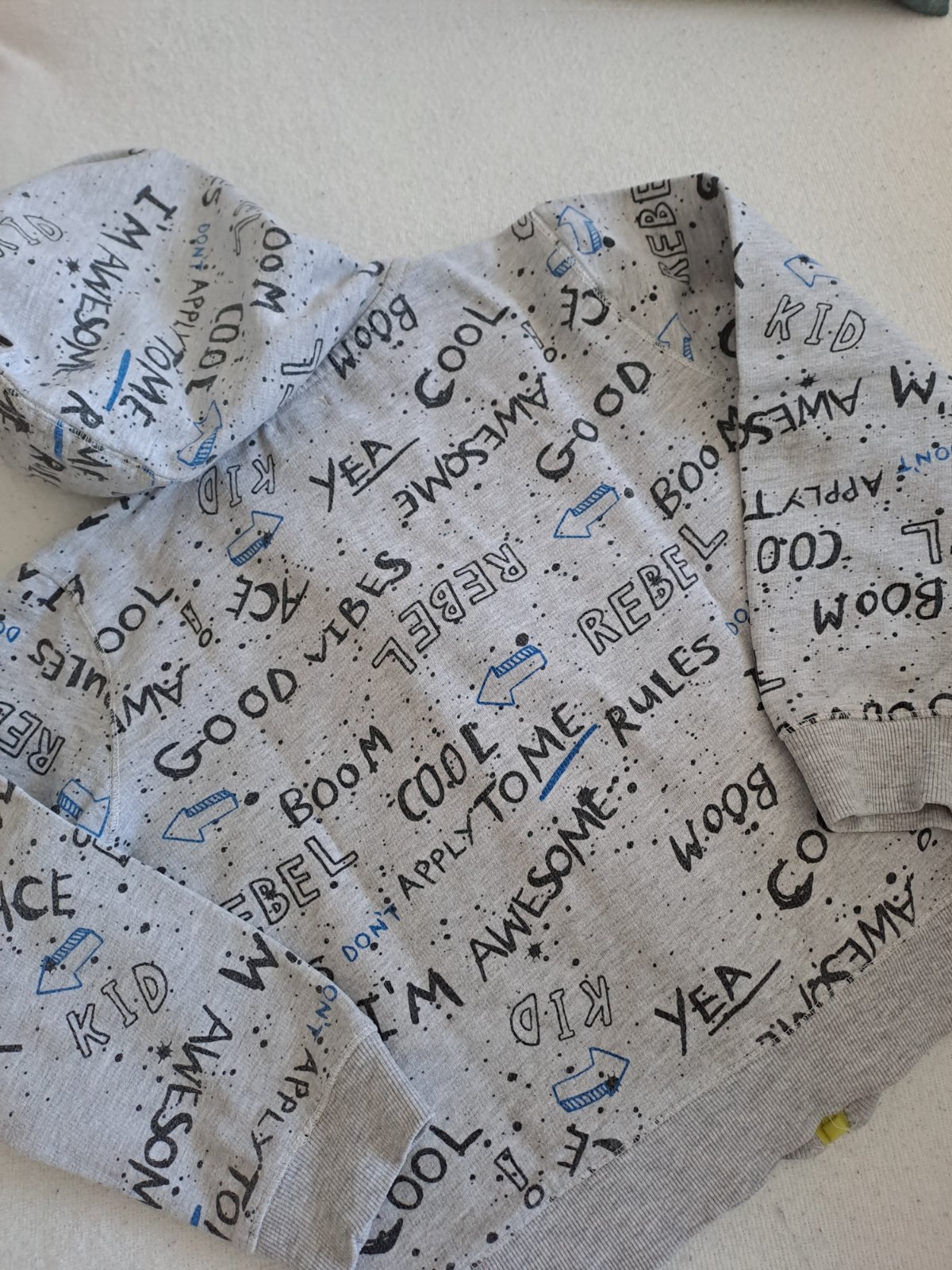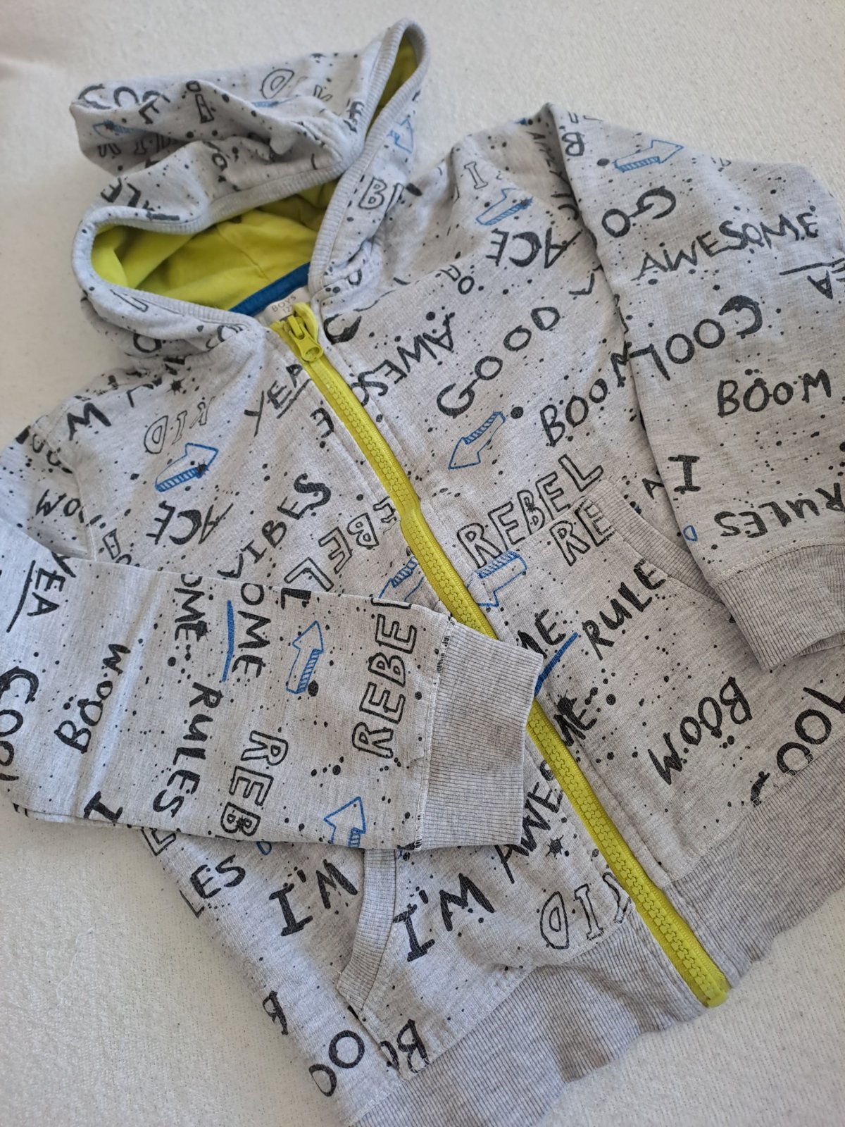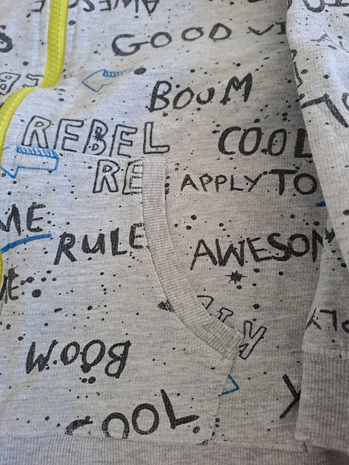 Chlapčenská mikina s nápismi a kriklavym zipsom, pre chlapca, možno aj pre dievča.