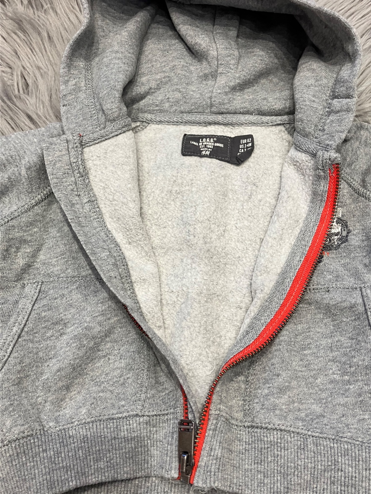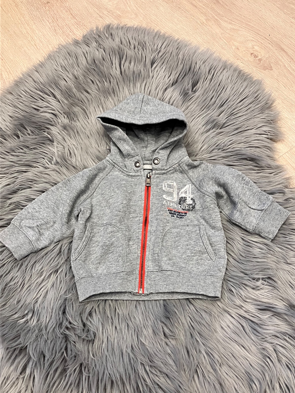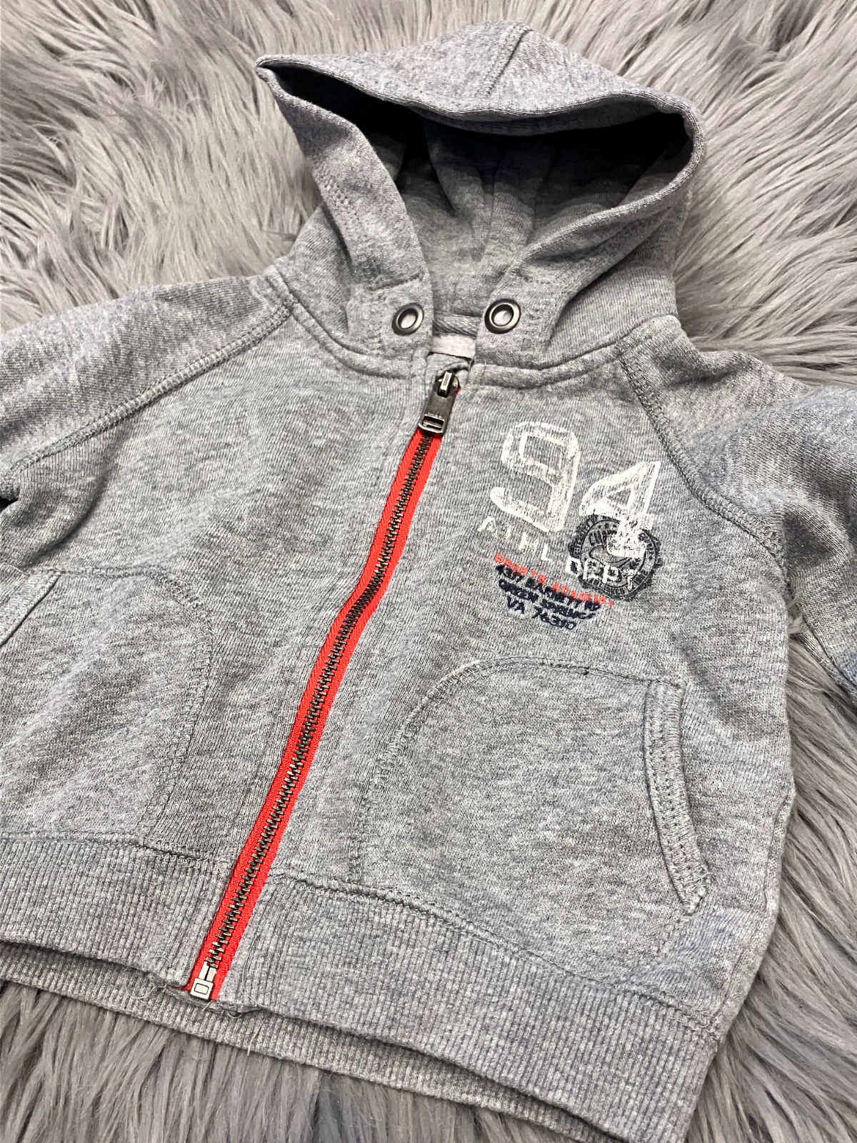Chlapčenská sivá mikina s kapucňou, zapínanie na zips, elastická, dve bočné vrecká, vo vnútri jemný flís, materiál 83%bavlna 17%polyester.