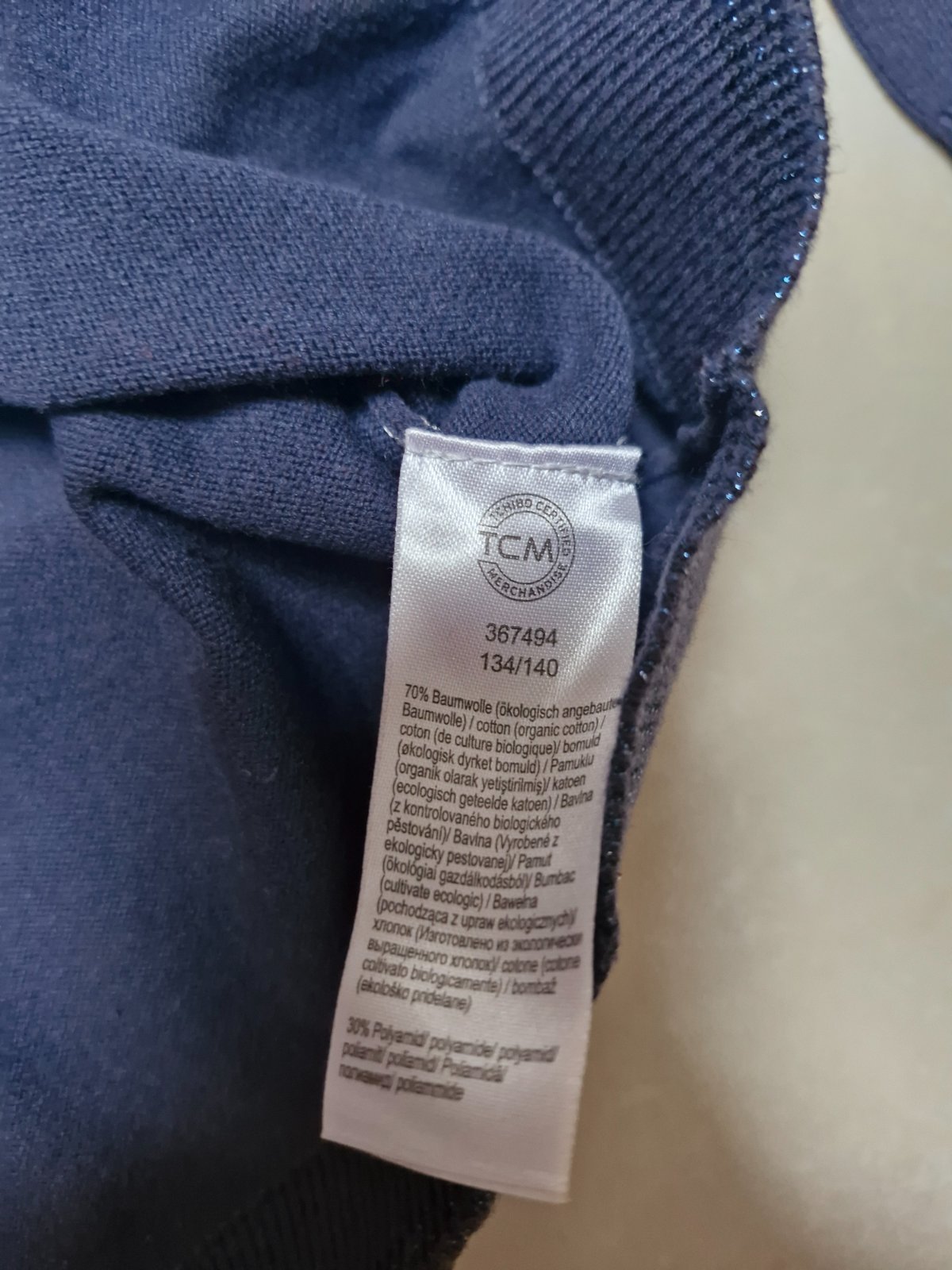 Veľmi pekný nosený stav, bez poškodení, fľakov a dier, nespraný a nenatiahnutý, šírka 40cm, dĺžka 60cm, rukáv od krku 63cm, dvojčíslie 134/140, farba tmavšia ako na foto