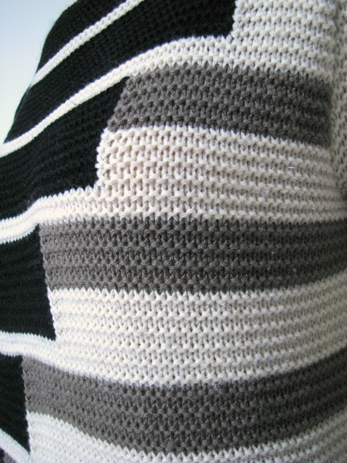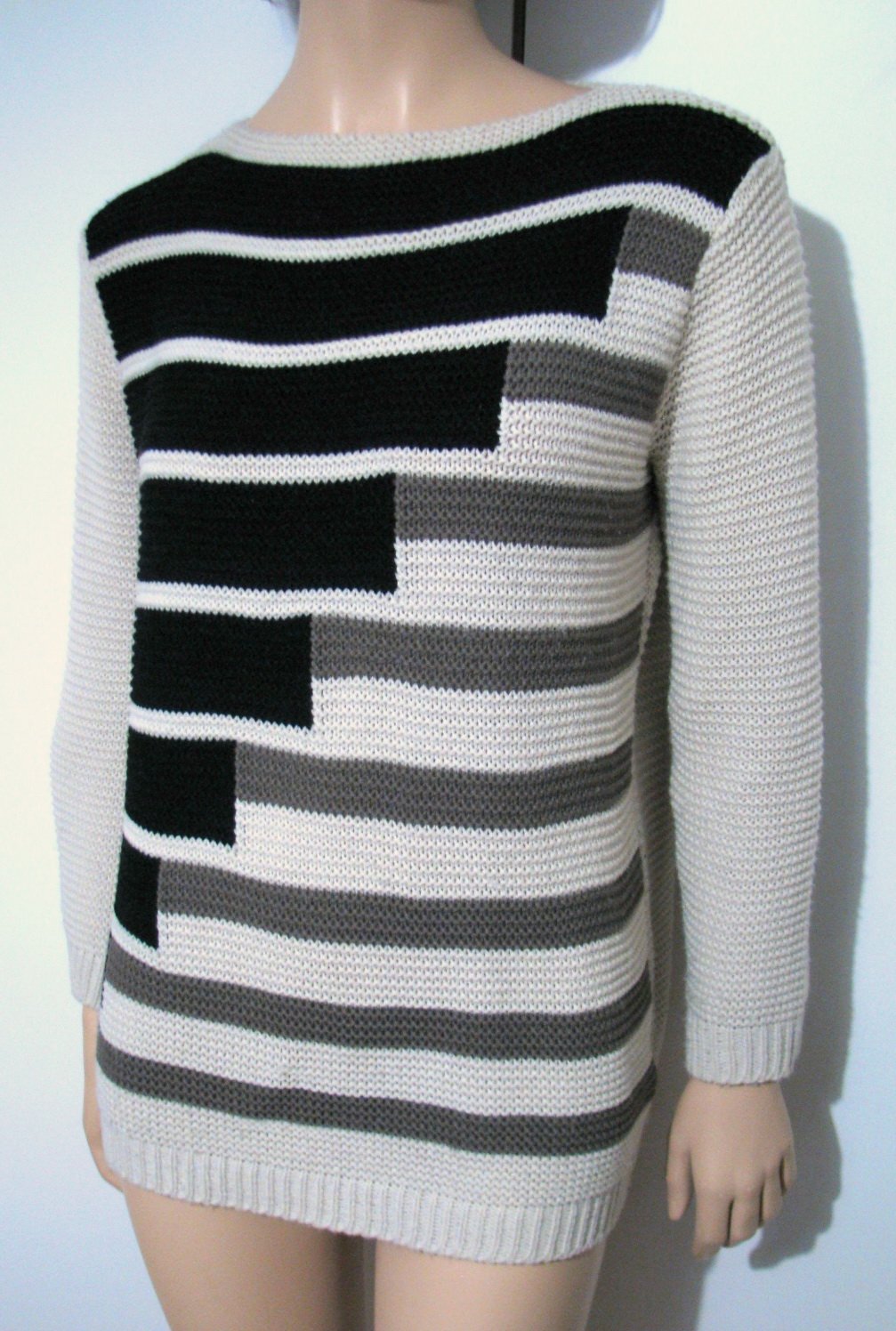 Hrubší pulóver na zimu krémovej farby s geometrickým vzorom - pruhmi čiernej a šedo-hnedej farby. Lodičkový výstrih, príjemný materiál. Výborne zachovalý, bez poškodení. Veľkosť univerzálna, najlepšie asi pre L, ale aj na menšie veľkosti ako oversize. Šírka cez prsia v kľude je 60 cm, natiahne sa cca do 77 cm, dĺžka 75 cm.