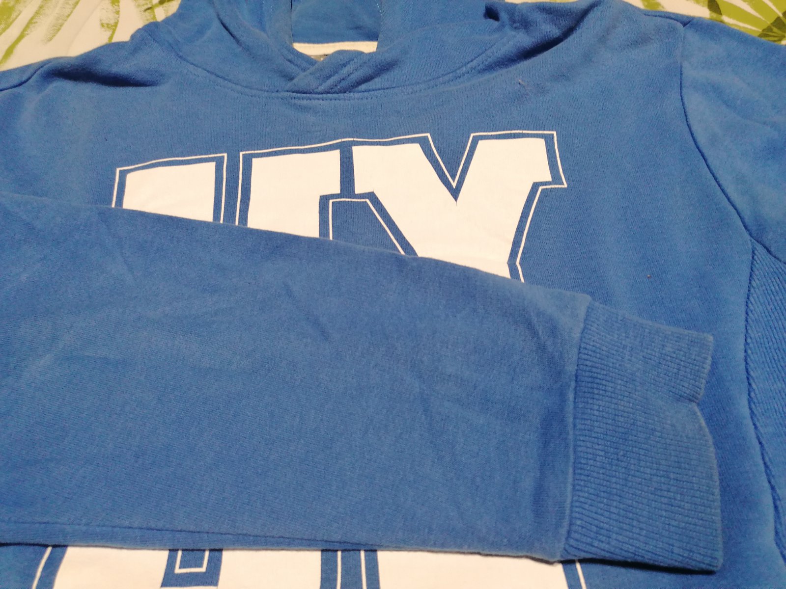 Pekná mikina, poddajná, veľmi príjemná na nosenie. Veľkosť 170, kupovaná v Lindexe. Celková dĺžka od ramena dole je 62cm, rukáv od vrchného zošitia je 61cm, od podpazušia 47 cm. Šírka 2x53 cm v kľude, ale povolí aj o 10 cm. Vpredu aplikácia v poriadku, vpredu vrecká.