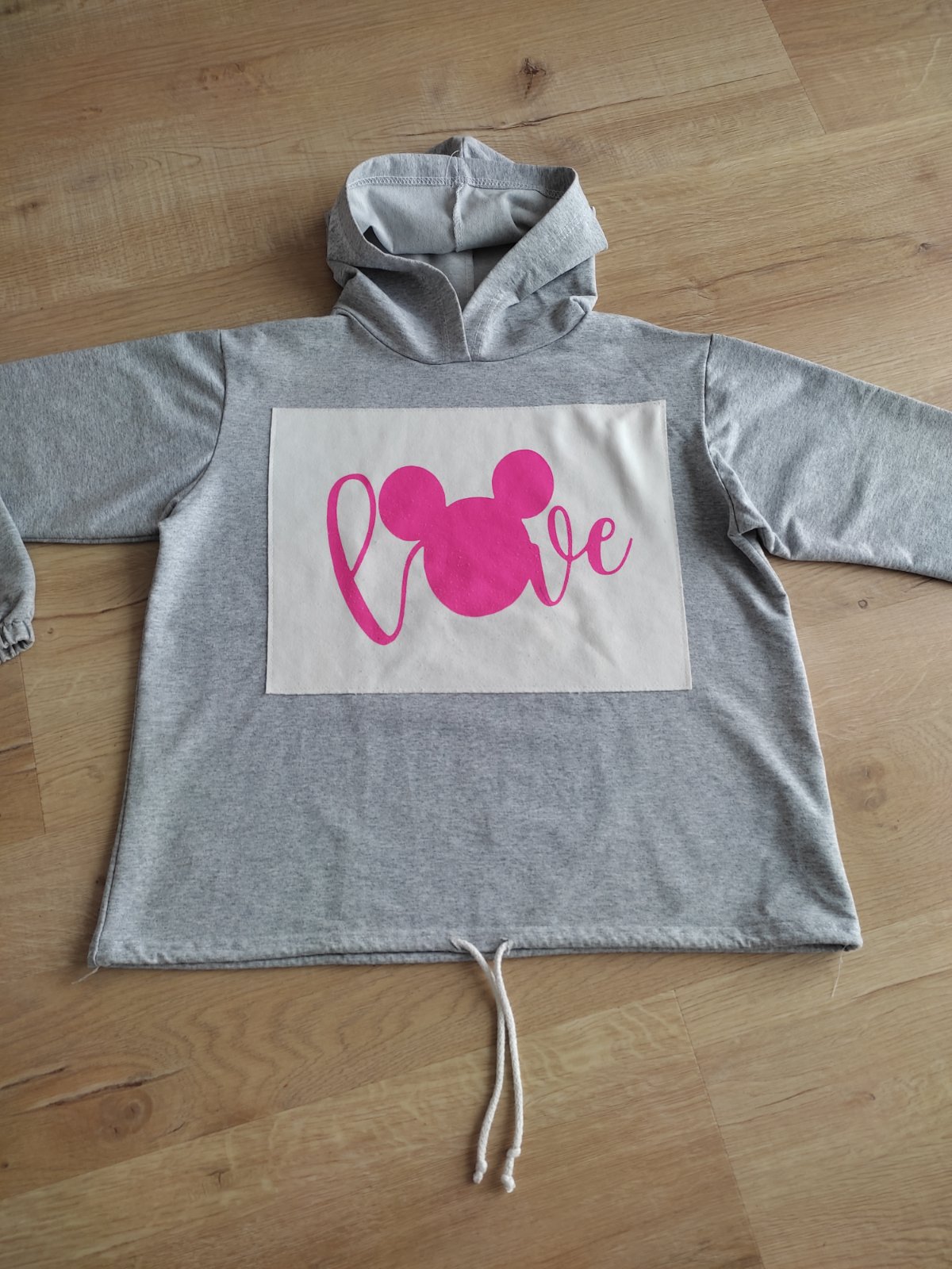 Stav veľmi dobrý,len na látke z Mickey sú jemné zmolky.Mikina je mierne rozšírená kratšieho strihu , super sedí aj k užším rifliam.Celkova dĺžka 52 cm,šírka pod pazuchami 53cm,dĺžka rukáva od krku 63cm.