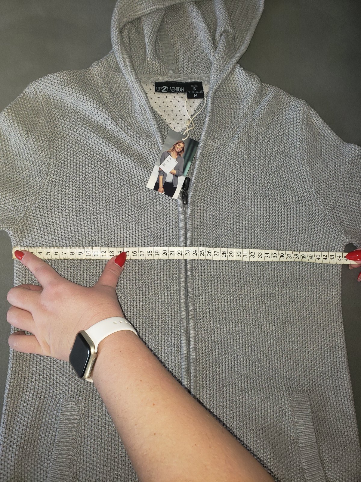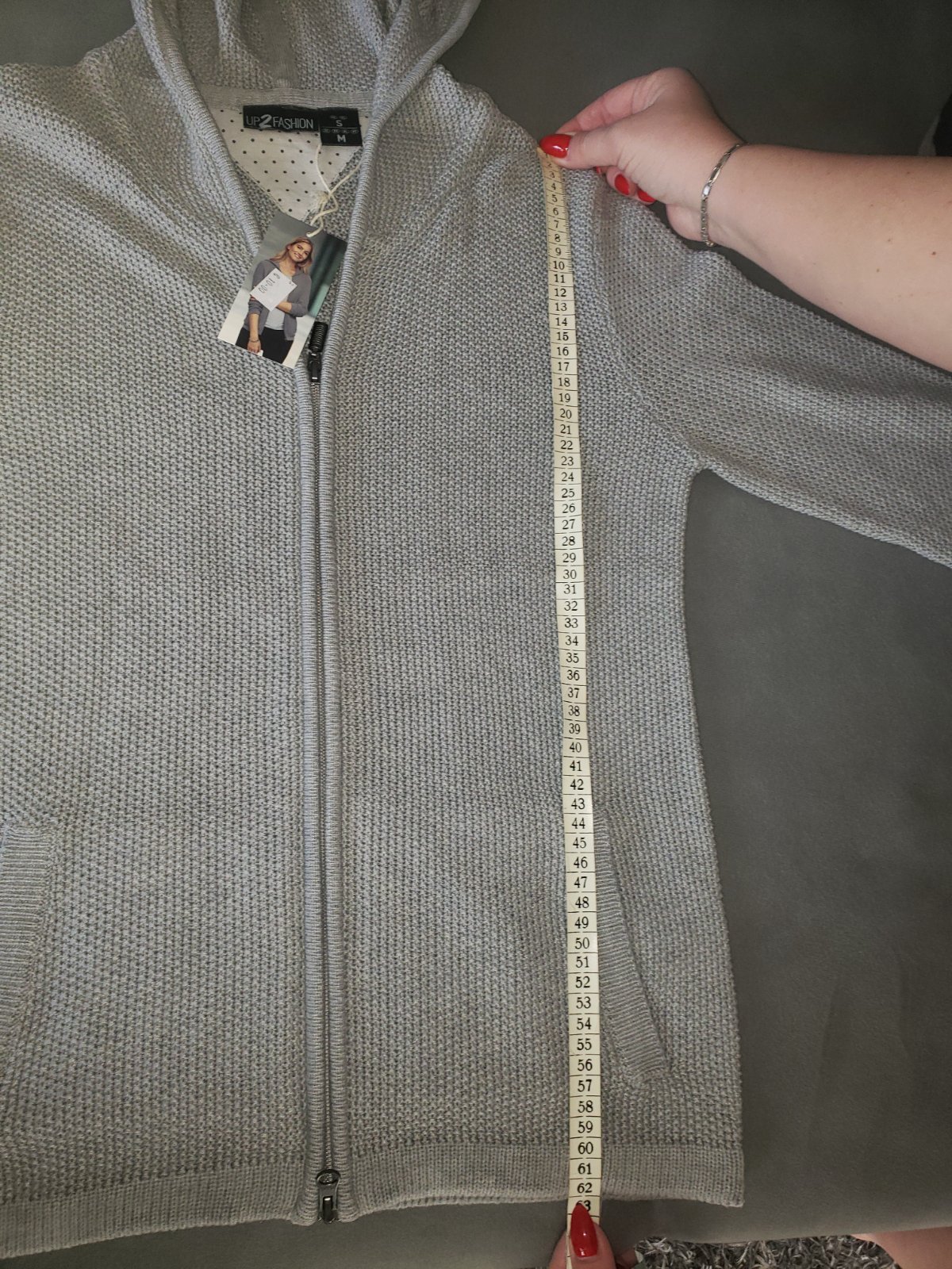 krasny sivy svetrik s dierkovou aplikaciou na zadnej strane, velkost UNI, bez zapinania, sadne na vsetky velkosti