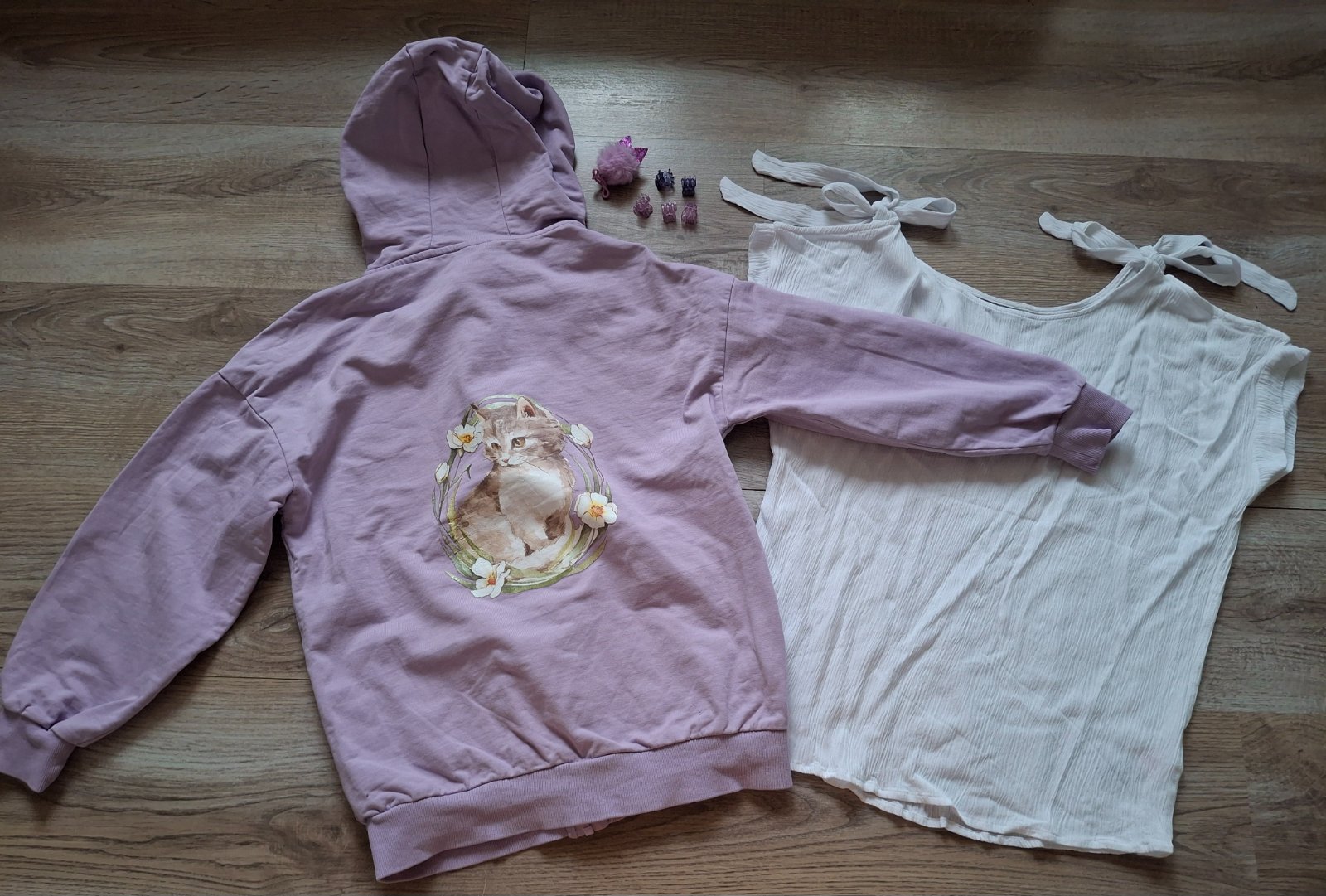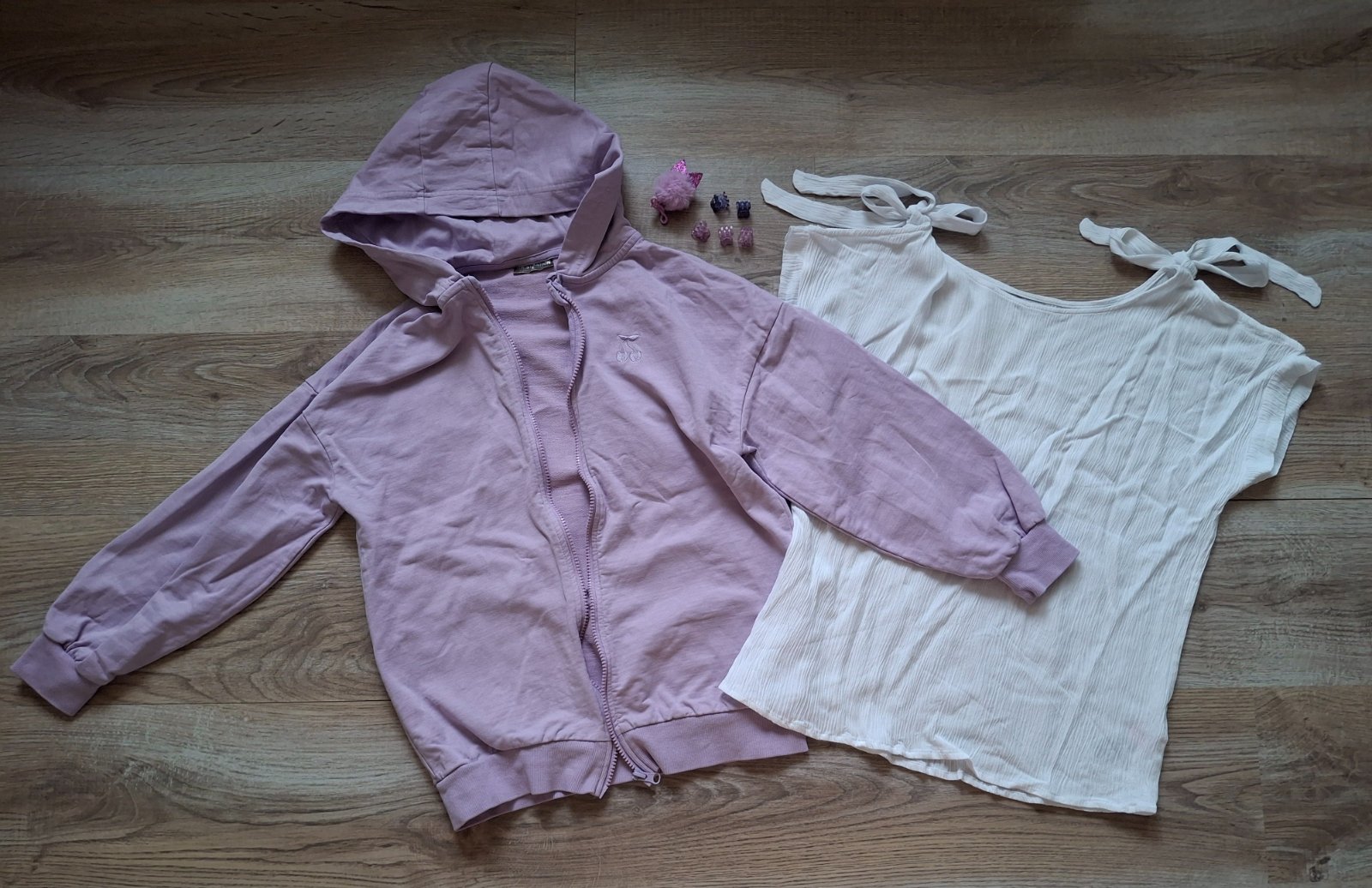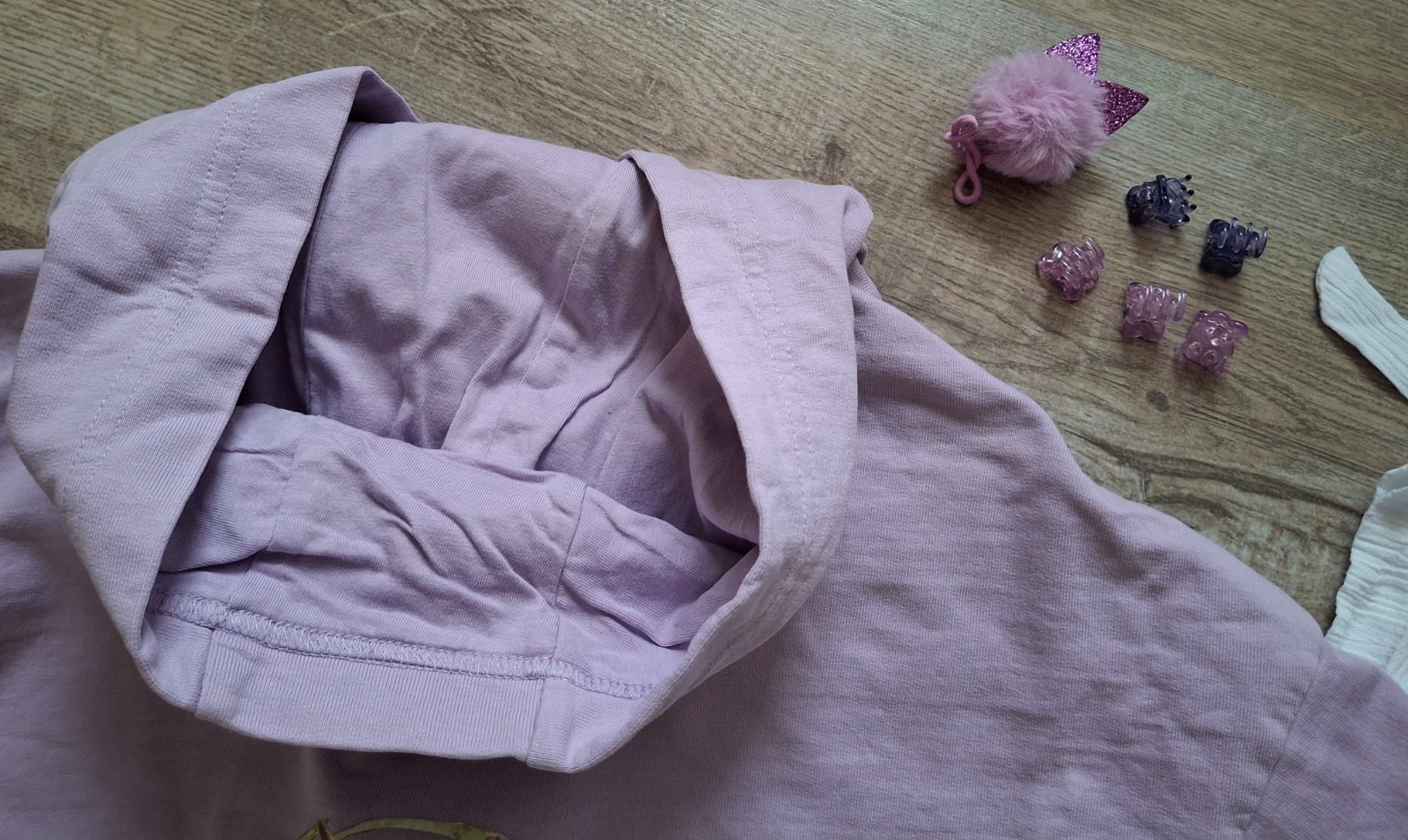 Mikina oblečená len párkrát, bez chybičky, kupovaná v pepco, veľkosť 146/152, šírka 46cm, dĺžka 58cm, rukáv od ramena 40cm, tričko/blúzka nenosené, iba oprané, má odstrihnutý štítok, vzdušný materiál, šírka v podpazuší 51cm, dĺžka 59cm. Cena spolu 4 eur, doplnky do vlasov pridám zdarma.