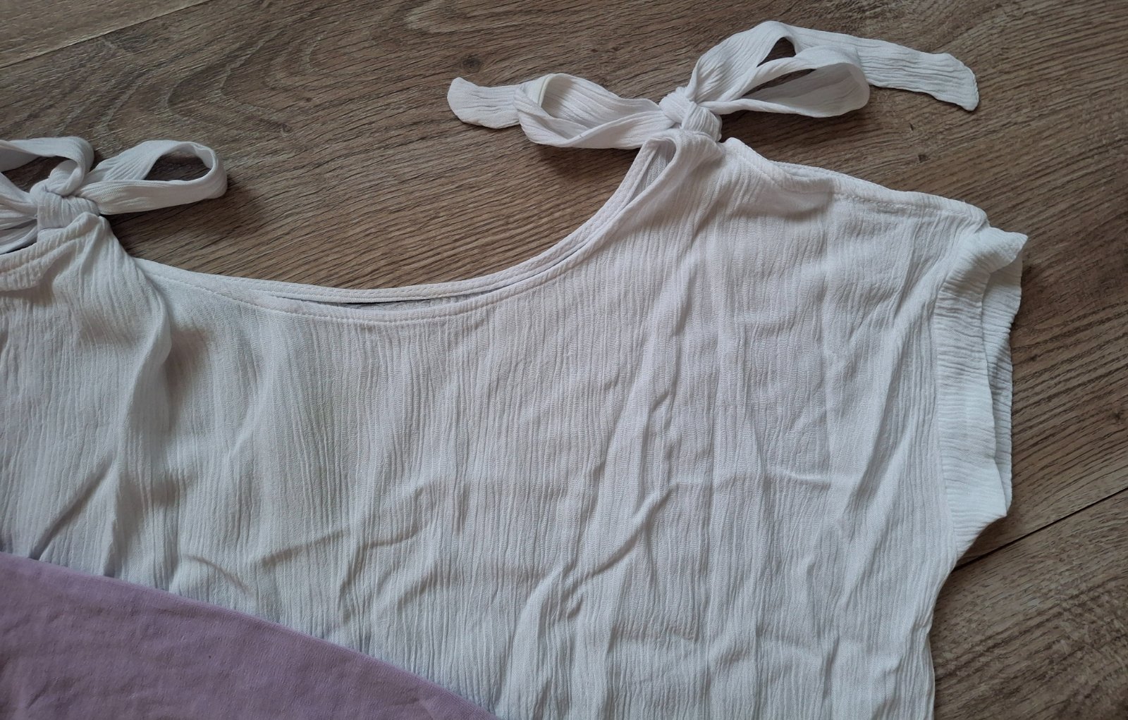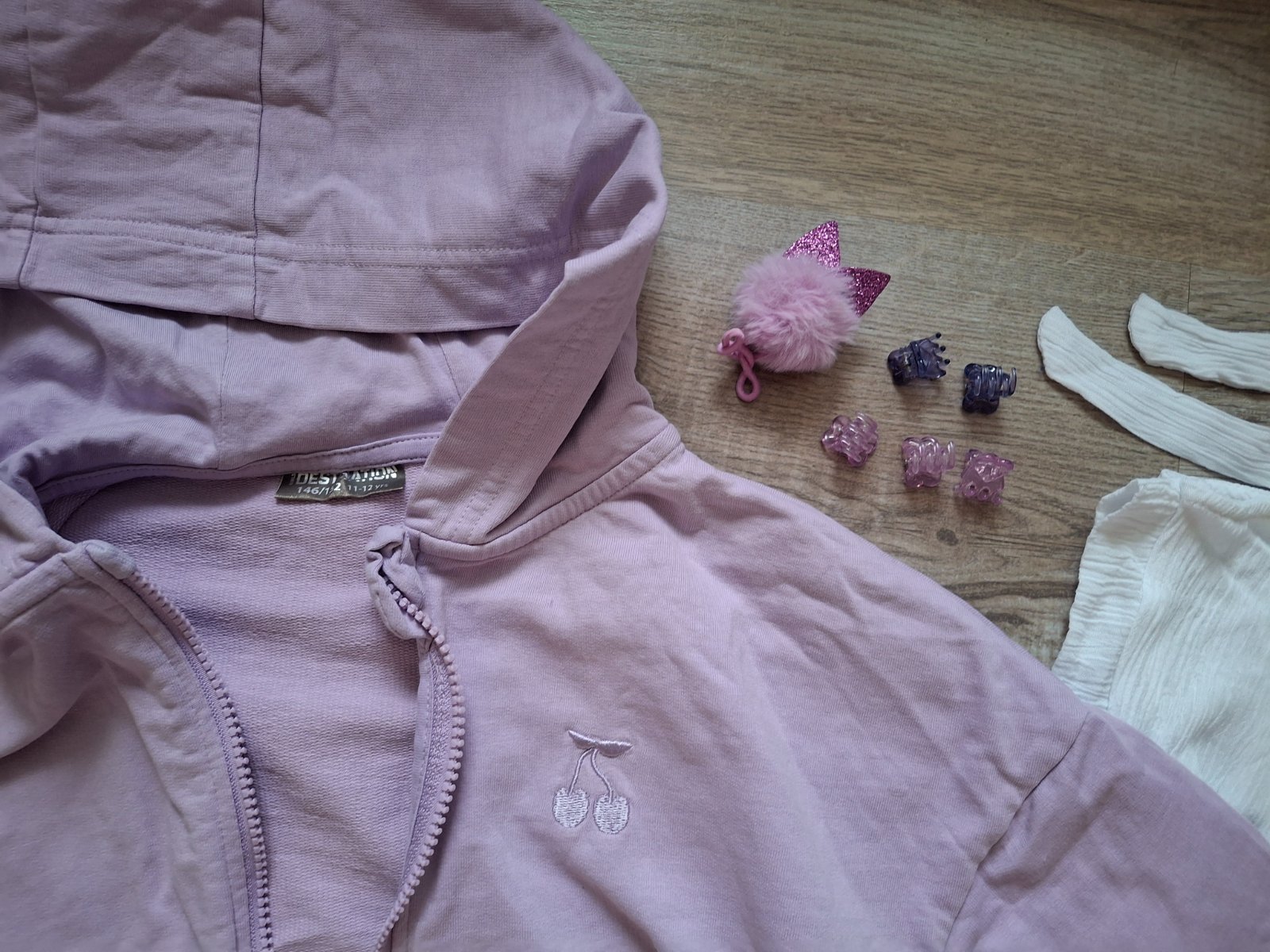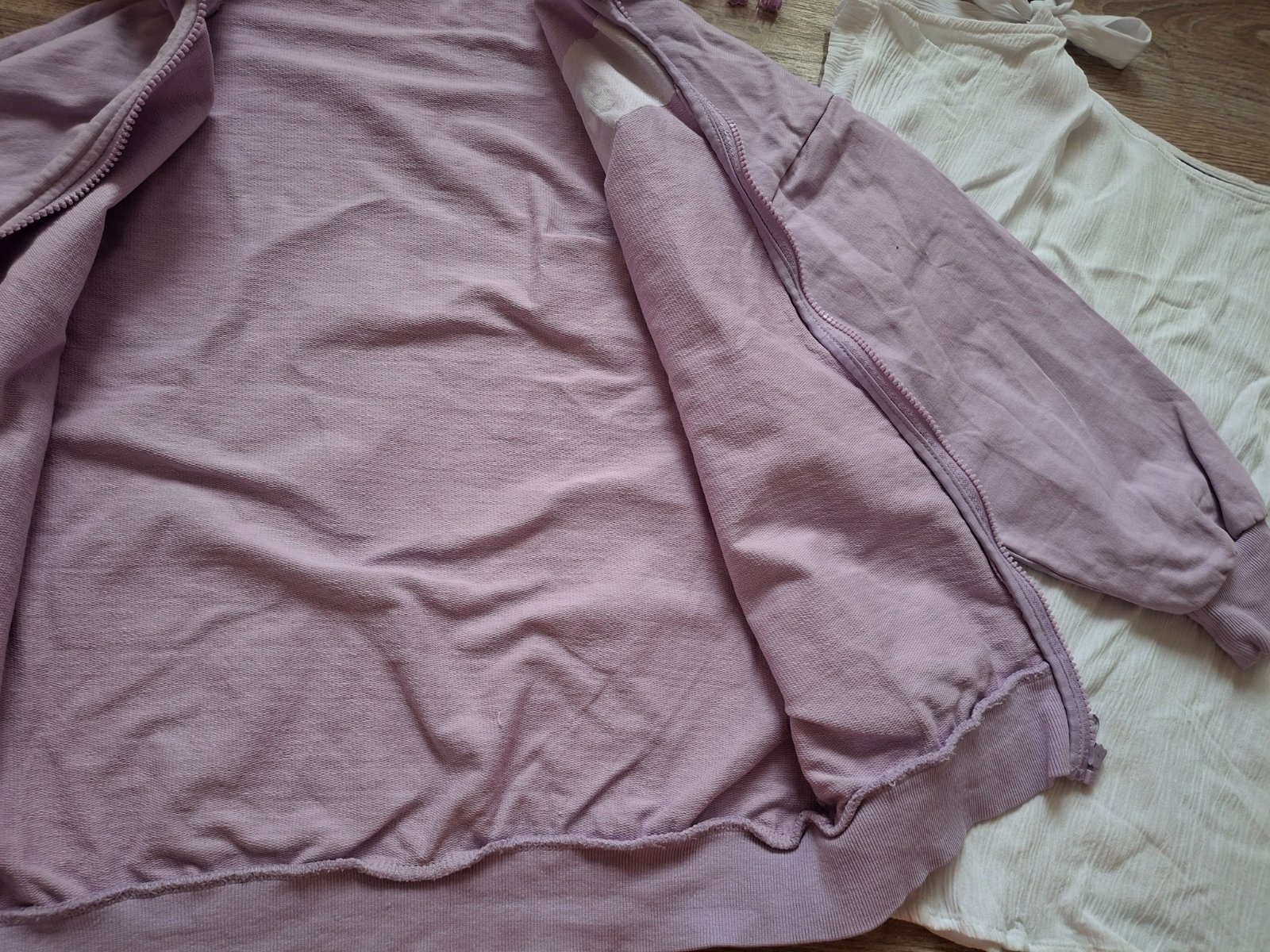 Mikina oblečená len párkrát, bez chybičky, kupovaná v pepco, veľkosť 146/152, šírka 46cm, dĺžka 58cm, rukáv od ramena 40cm, tričko/blúzka nenosené, iba oprané, má odstrihnutý štítok, vzdušný materiál, šírka v podpazuší 51cm, dĺžka 59cm. Cena spolu 4 eur, doplnky do vlasov pridám zdarma.