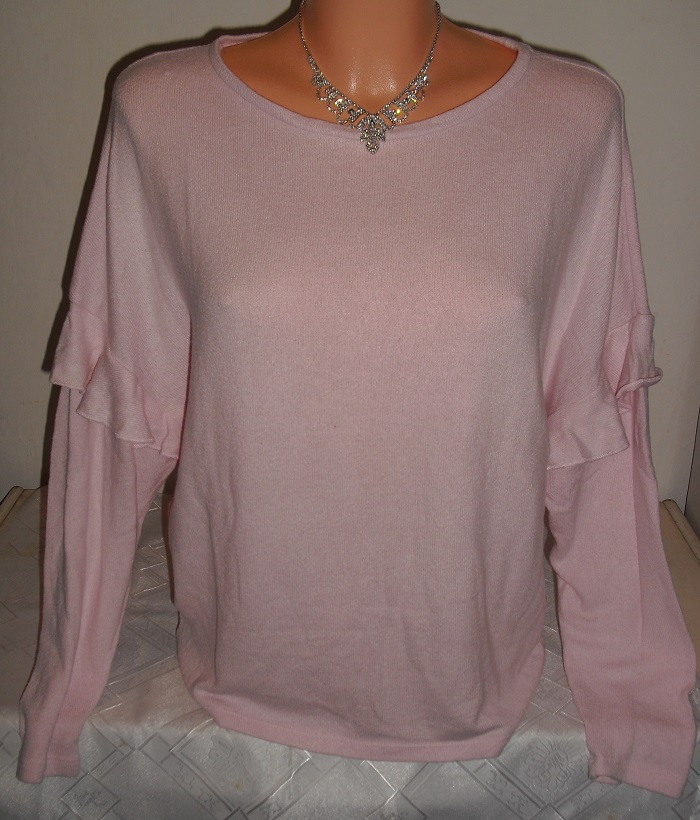 predam nadherny pulovrik jemucky material, nepichlavy, velmi prijemny na telo, znackovy, vybornom stave, bleducko ruzovej farby. rukavy ma motylie, elasticky a pruzny. velkost uvedena s, nosi sa navolno padavo na tele ale aj obtiahnuto kedy sirka je 64 cm x 2, dzka 60 cm.