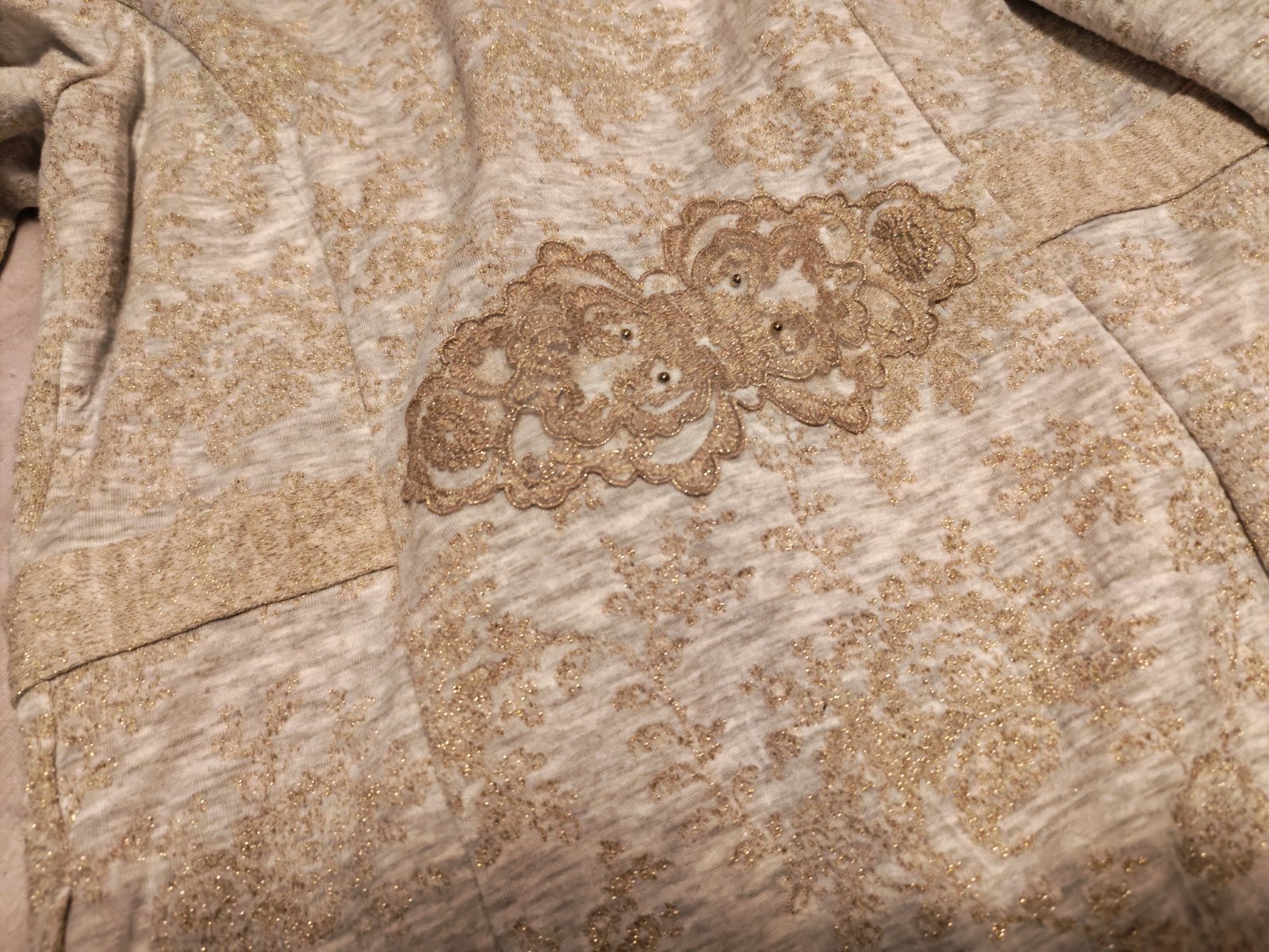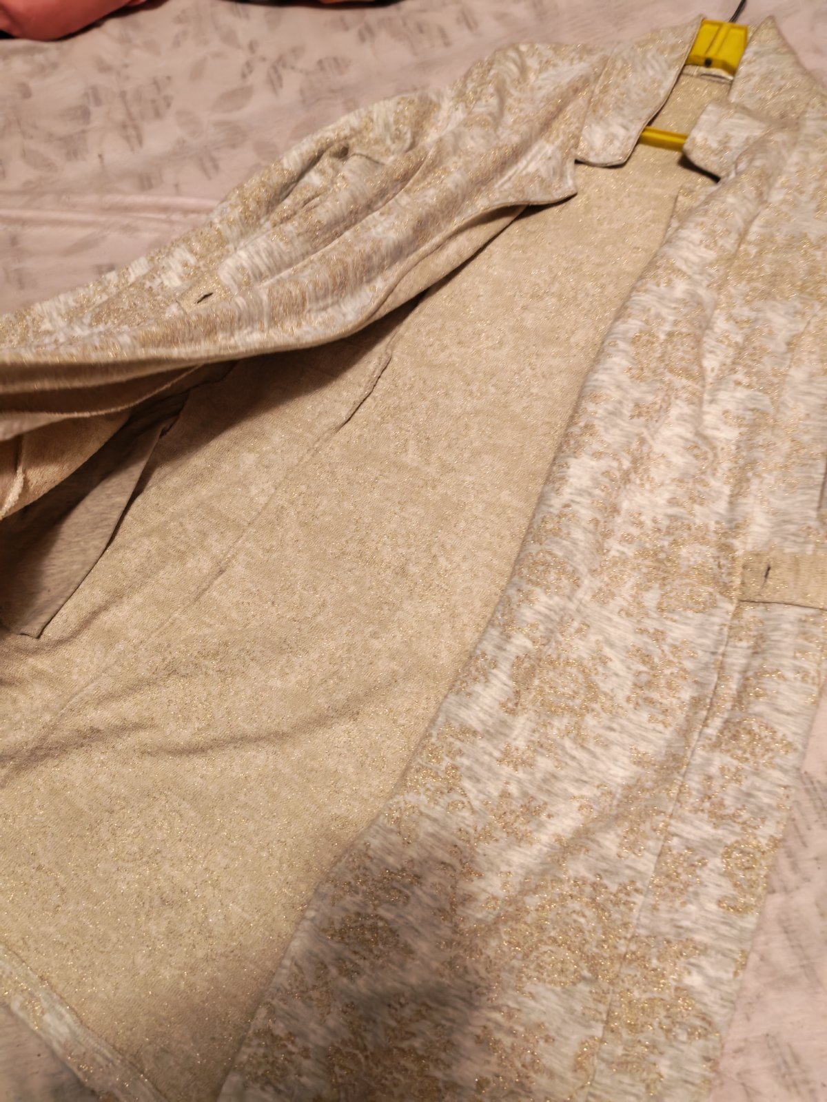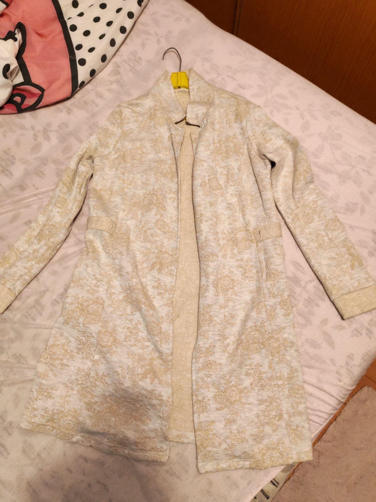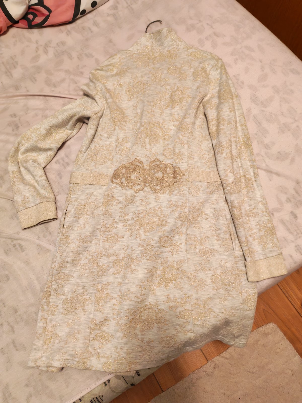 Ornamenty vysité zlatou nitkou, dlzka 89cm, sirka chrbtovej casti cez pás 43cm, cez plecia 40cm, zblízka vidno kus pranie, inak bez poskodenia
