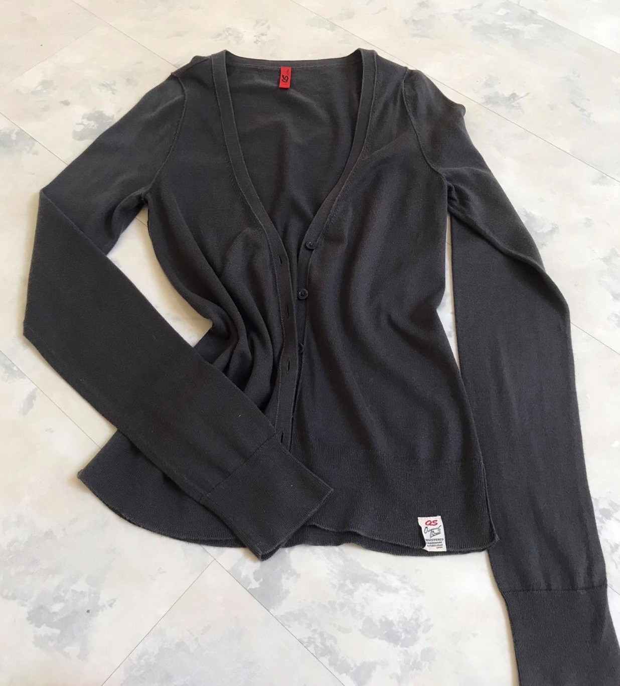 neznosený bavlnený tenký sveter,značky QS Original Brand,ktorá je súčasťou kolekcie značky s.Oliver - na prehodenie na tričko/blúzku/šaty v lete,krásne vypracovaný,značka vyfotená,materiál - tenký cvernová bavlna,farba studená tmavohnedo-šedá &