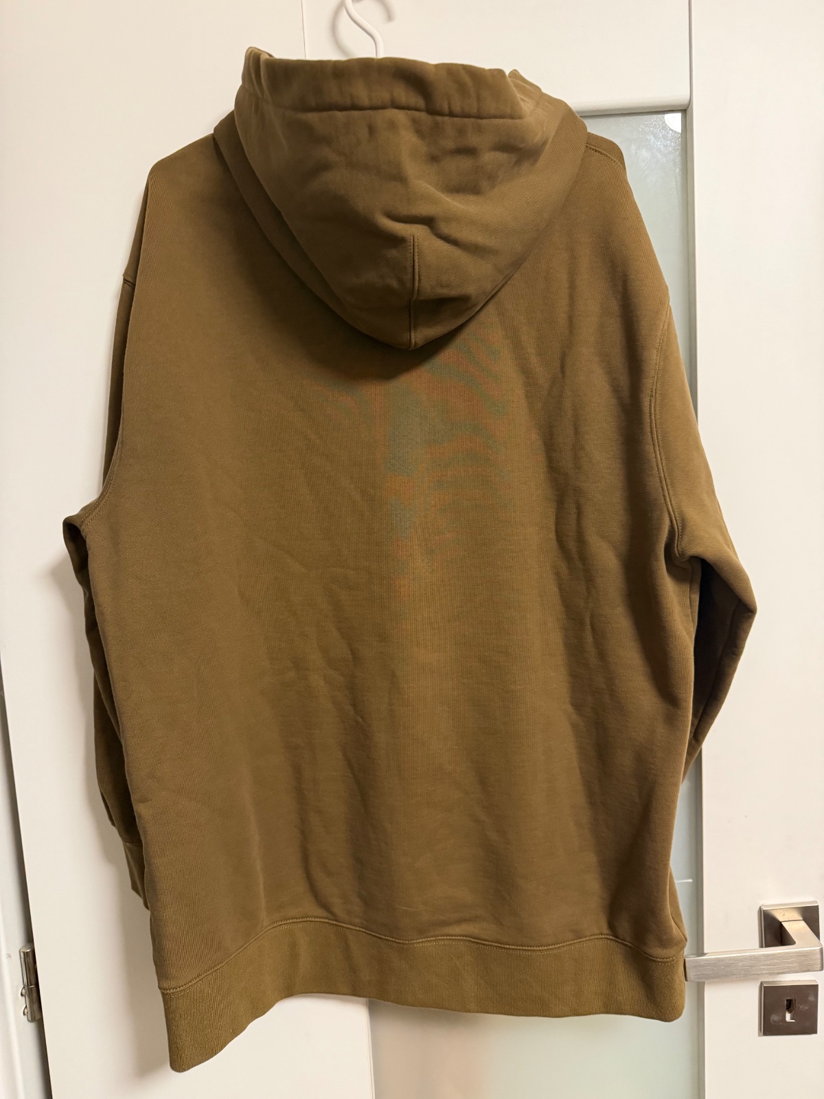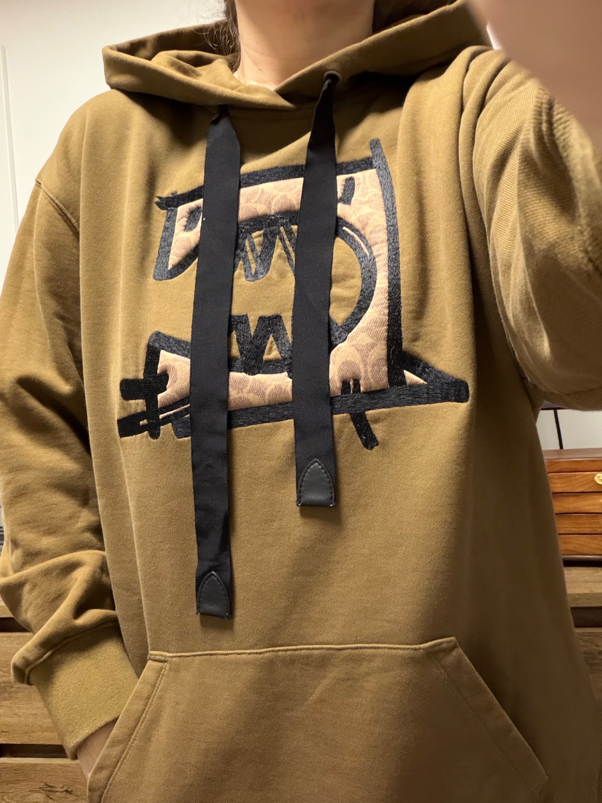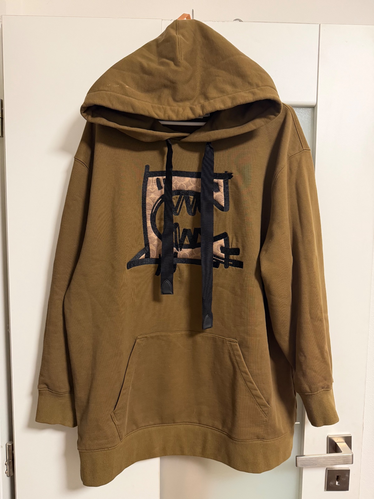 Originálna mikina Coach x Guang Yu v krásnej sýtej šskoricovej hnedej farbe (hlavná fotka), ide o limitovanú kolaboráciu značky Coach s umelcom Guang Yu, hrubší kvalitný materiáll, výrazná aplikácia loga (nie je to obyčajná potlač, veľmi pohodlná, oversize predĺžený strih, stav veľmi dobrý, má len malý svetlejší fliačik na kapucni (viditeľný na fotke), inak bez poškodení, dl.76, š.60, rukáv 18+63