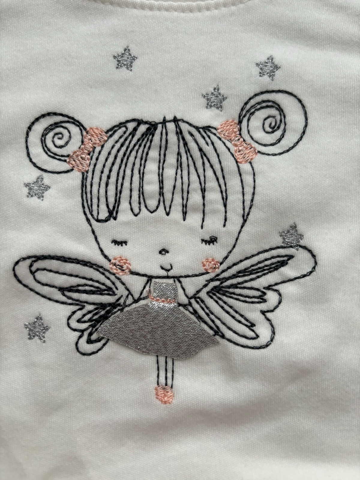 Malo nosena mikina Primigi. Farba je niečo medzi bielou a sivou, latka je pretkavana striebornou niťou