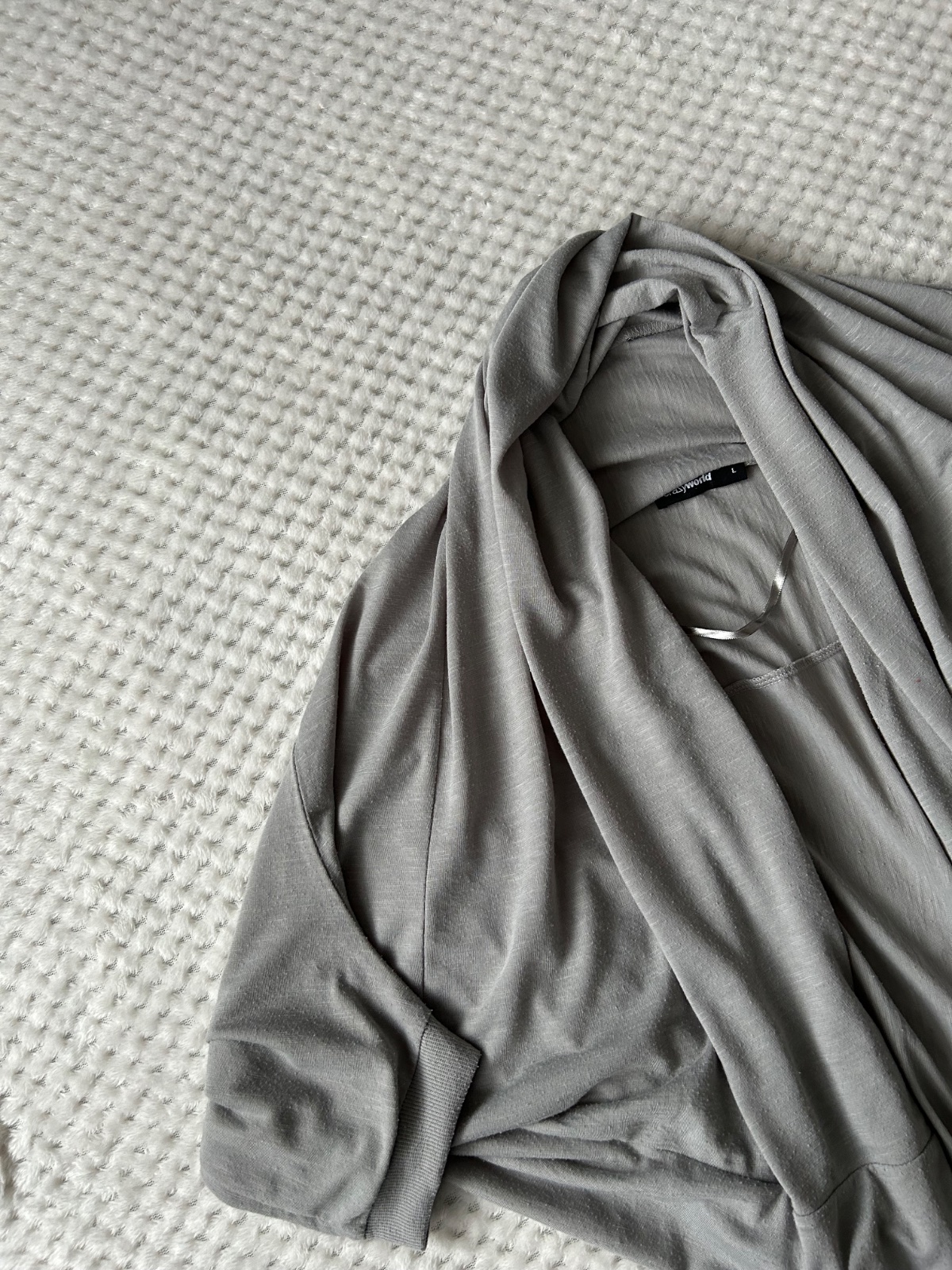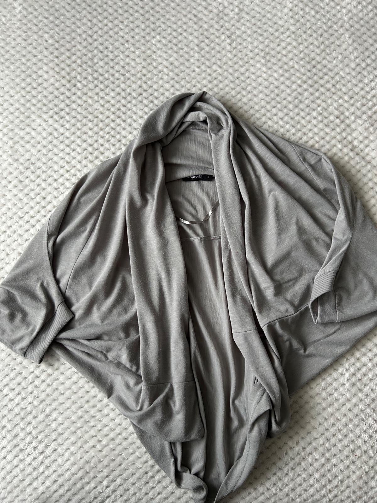 Predám málo nosené šedé bolerko z príjemného teplákového materiálu. Veľkosť písaná M/L, sadne aj na S.