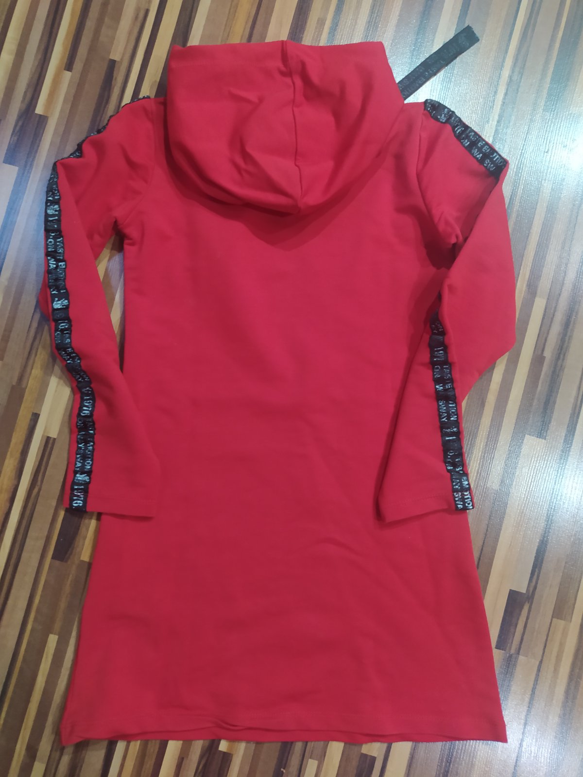 Posuvame peknu mikinu predĺženú alebo ako šaty k legínam nosené ale stále dobrý stav ,vidno pranie na nápise na rukávoch inak nemá žiadne poškodenia