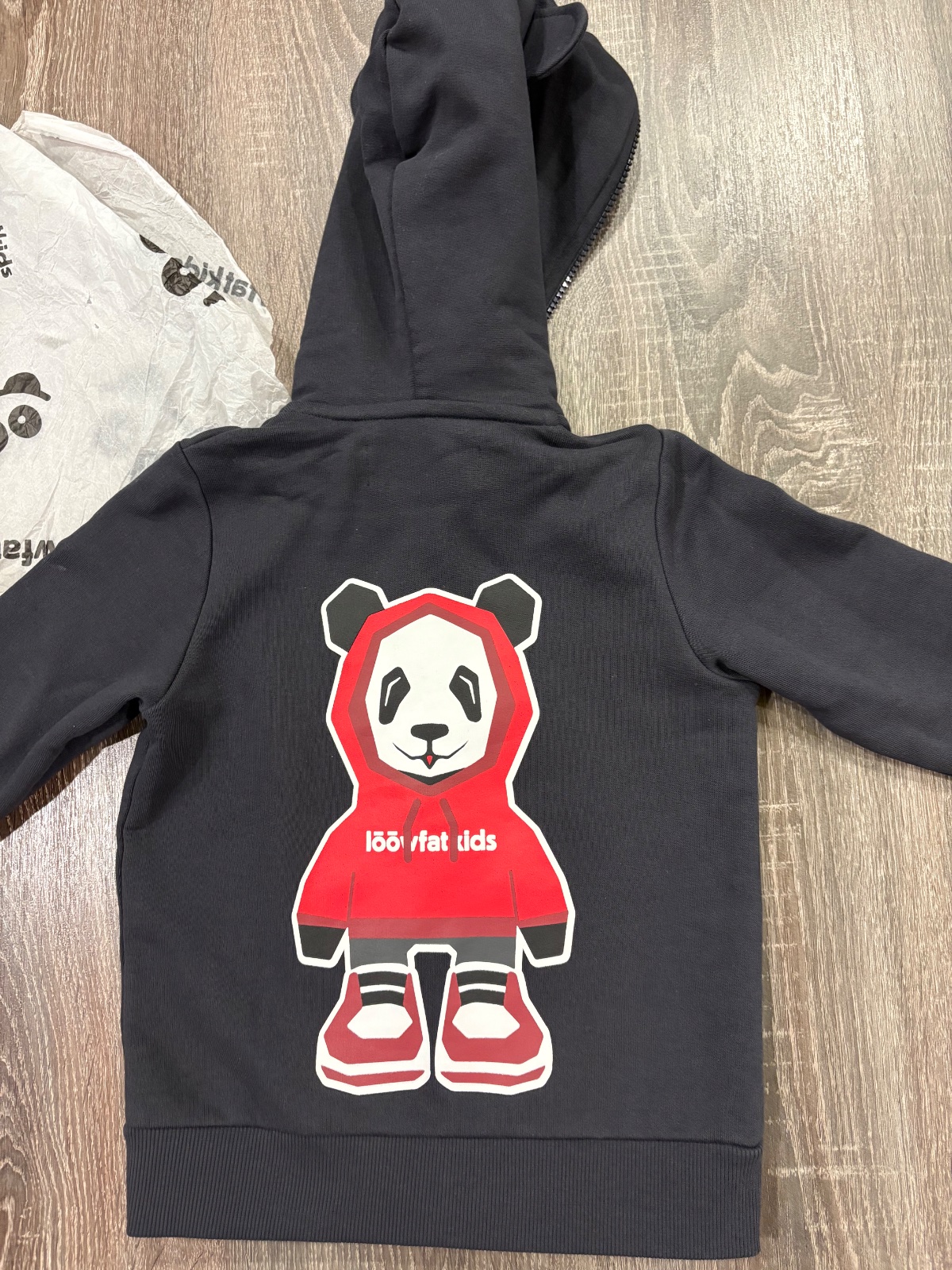 95.Loowfat štylova detska mikina s pandou a s uškami na kapucni,velkost 3-4 roky,super stav,dlzka je 44cm,dlzka rukava od krku je 45cm a sirka v podpazusi je od 35x2cm do 39x2cm
