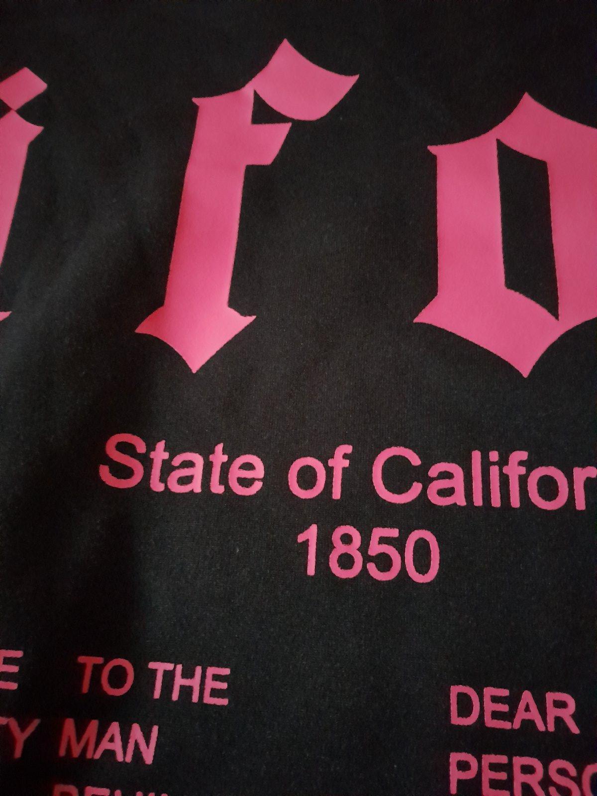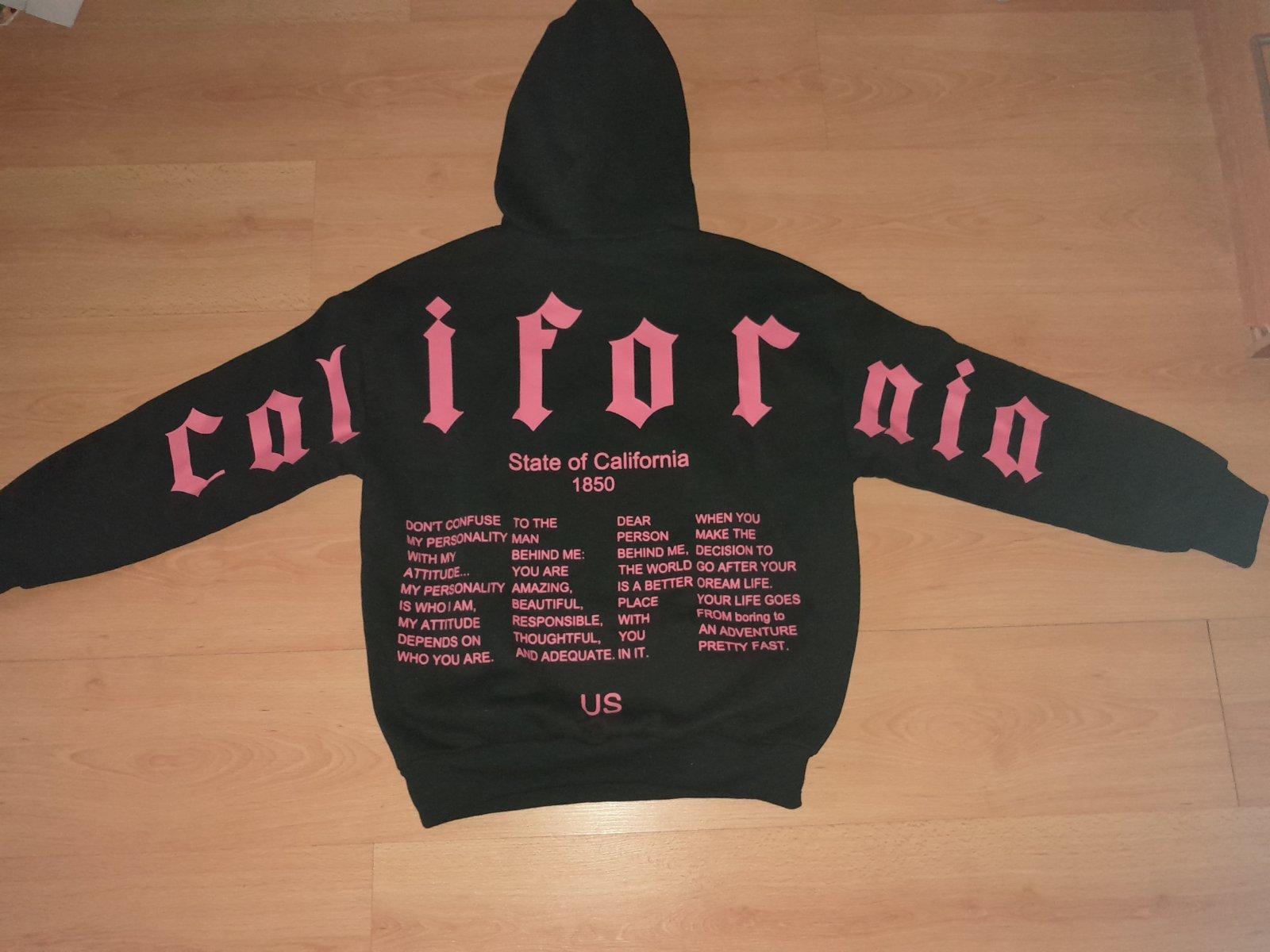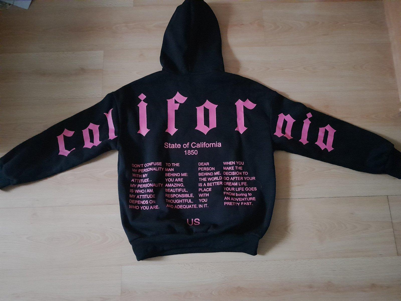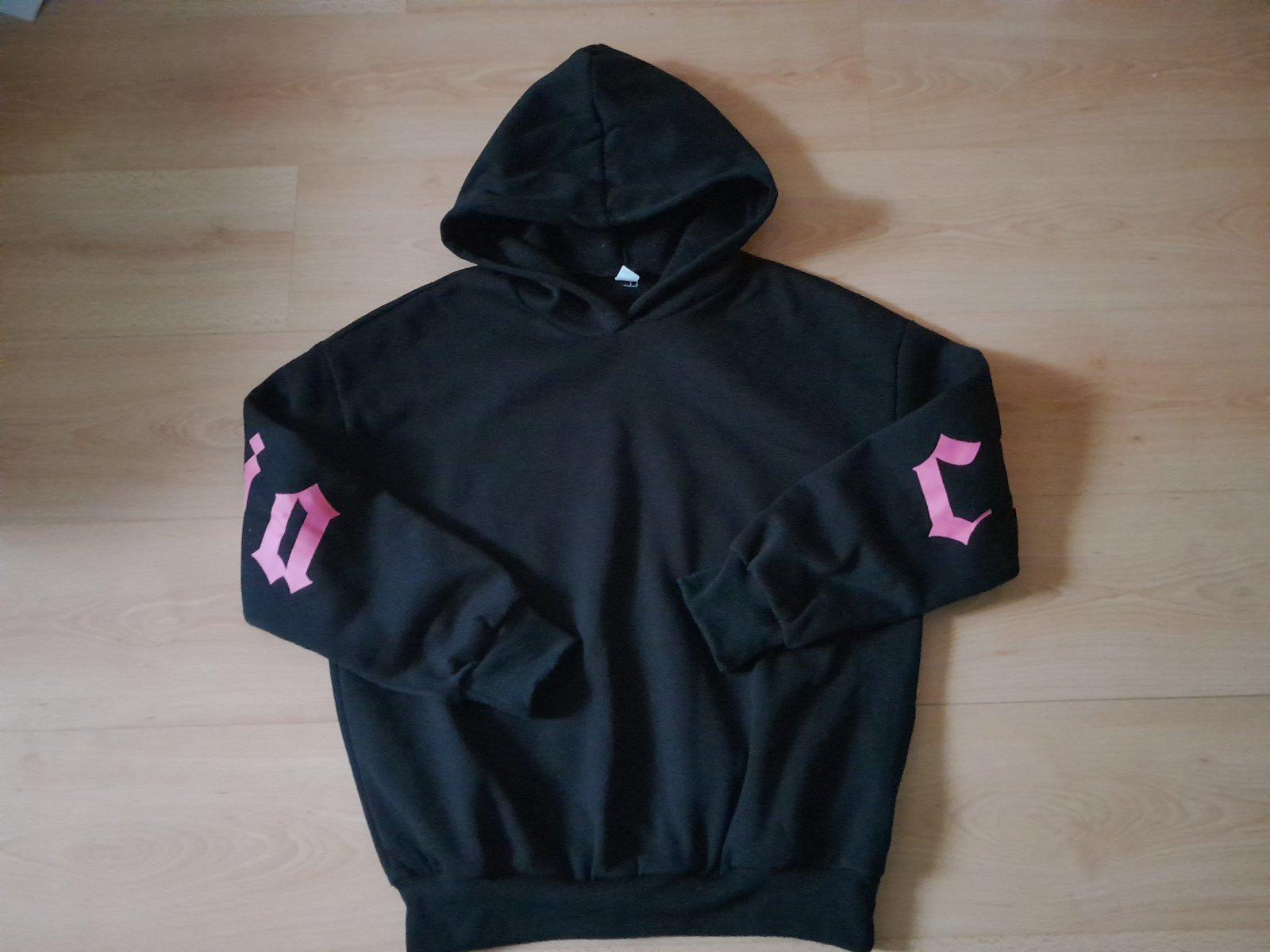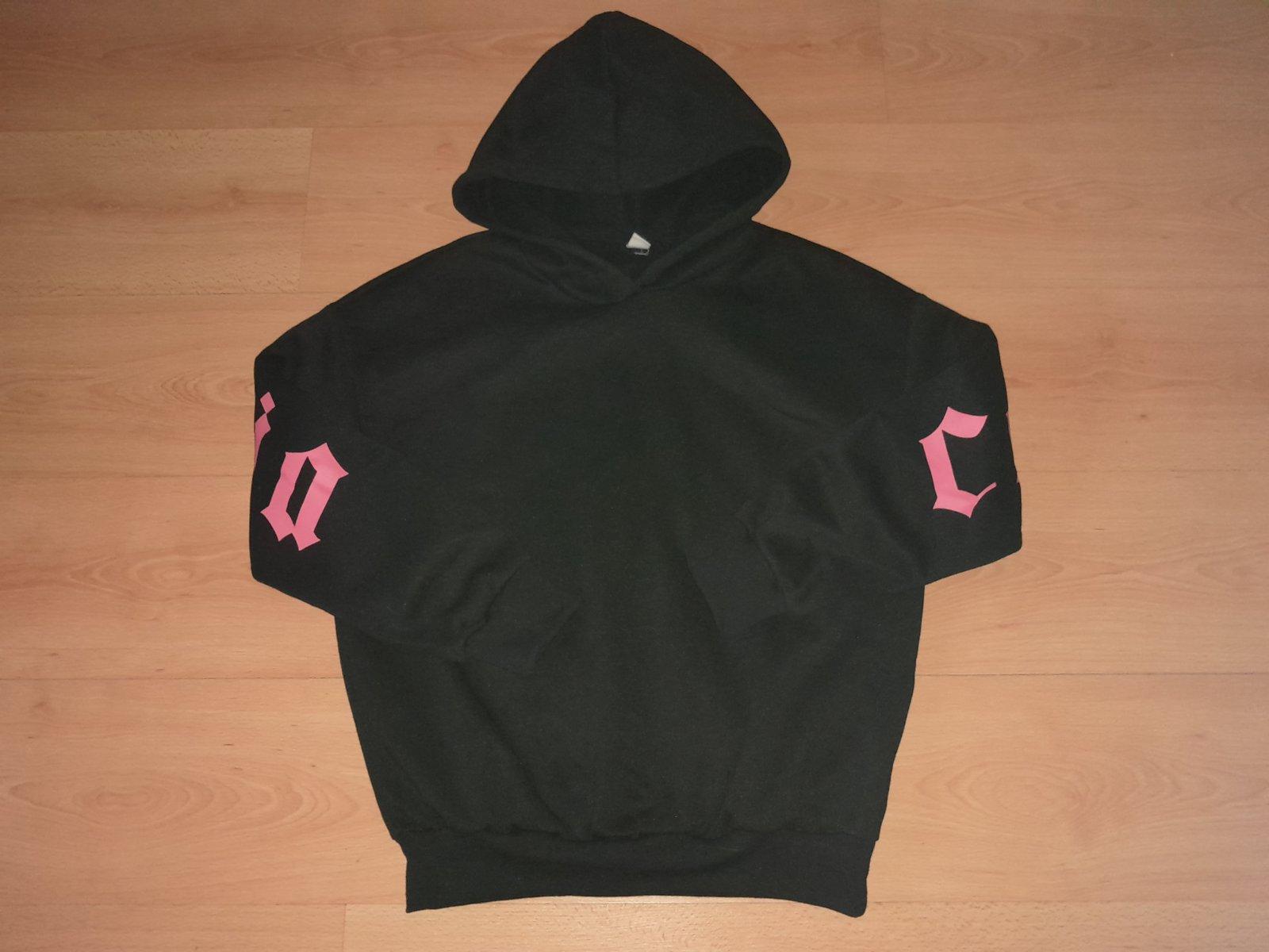 s výraznými ružovými nápismi vzadu na chrbte a rukávoch