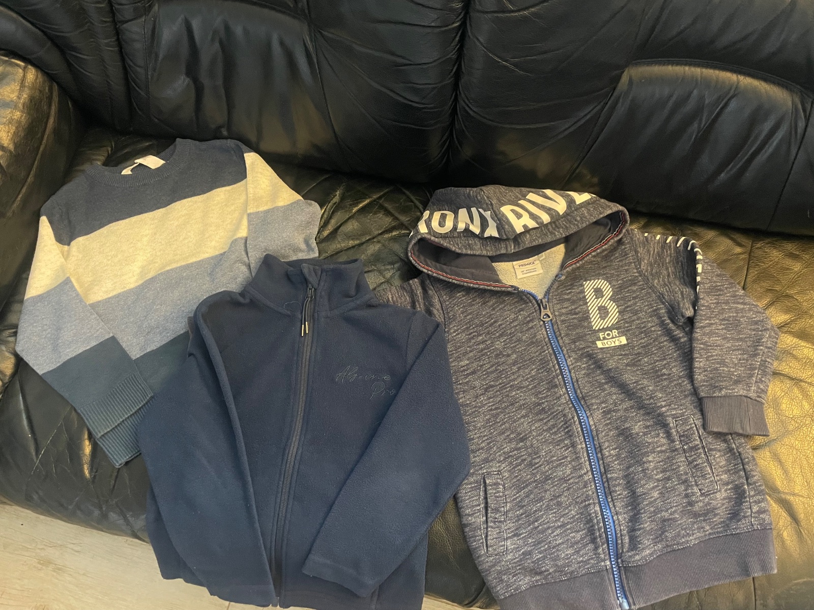 Chlapčenská mikina na zips s nápismi a kapucňou, na rukáve má malý fľak. Cena bez poštovného 5eur.