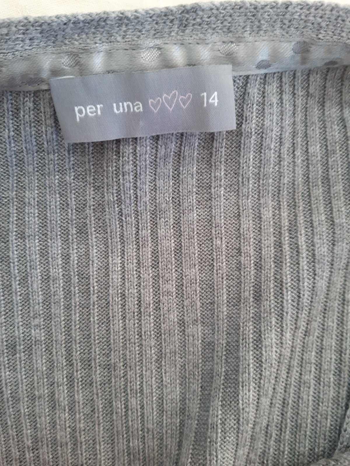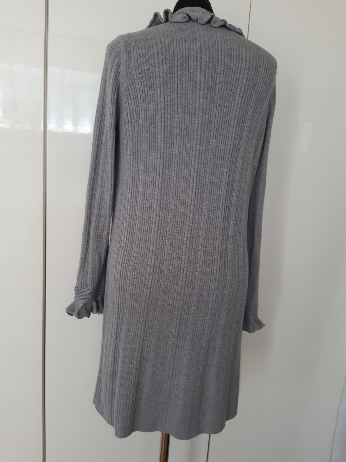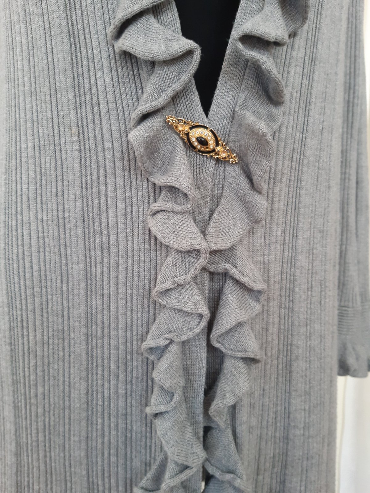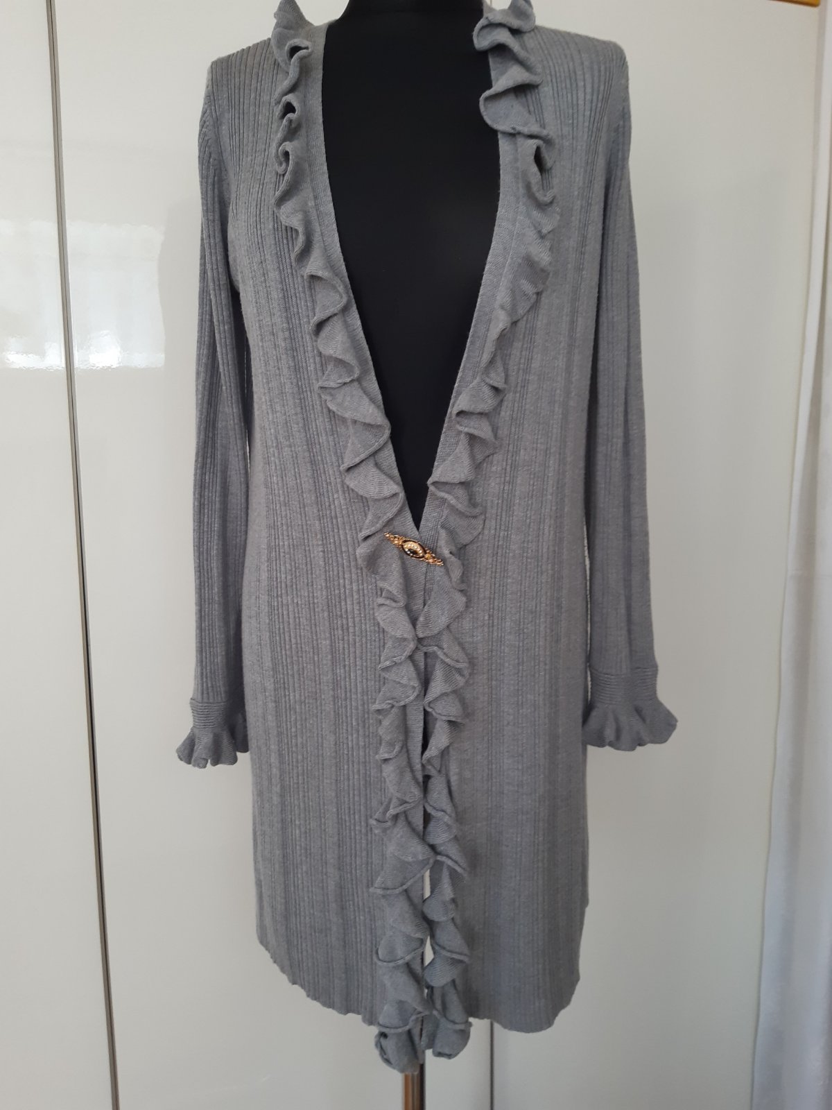 Kardigan dobrej kvality, aj značky .Dl. 86 cm, dl. rukáva 62 cm, šírka cez prsia 50x2 cm. Materiál je to úplet strednej hrúbky 52% viskóza, 48% acrylik. Kardigan je vo veľmi dobrom stave, bez poškodenia, brošničku-ak bude záujem podarujem.