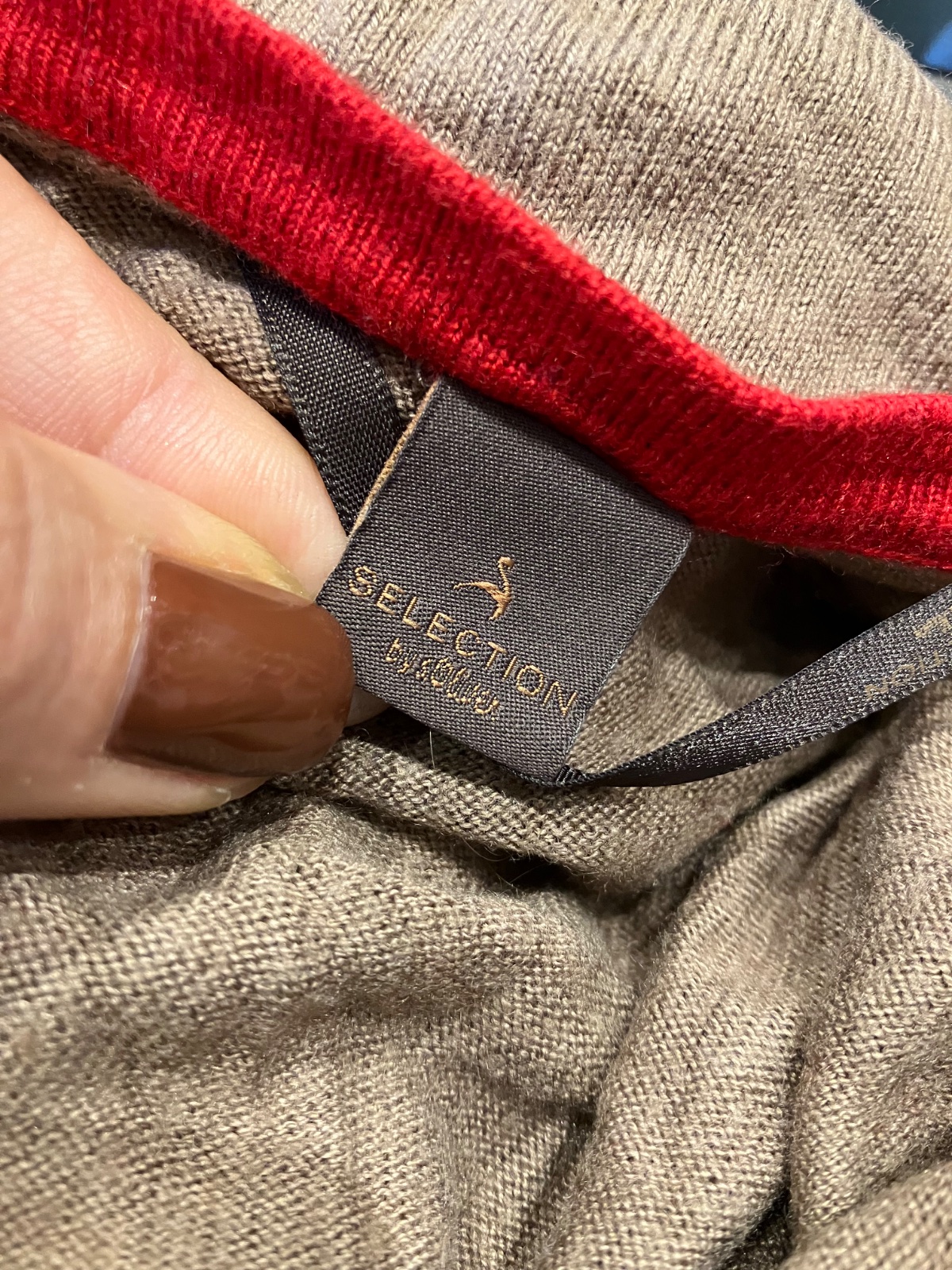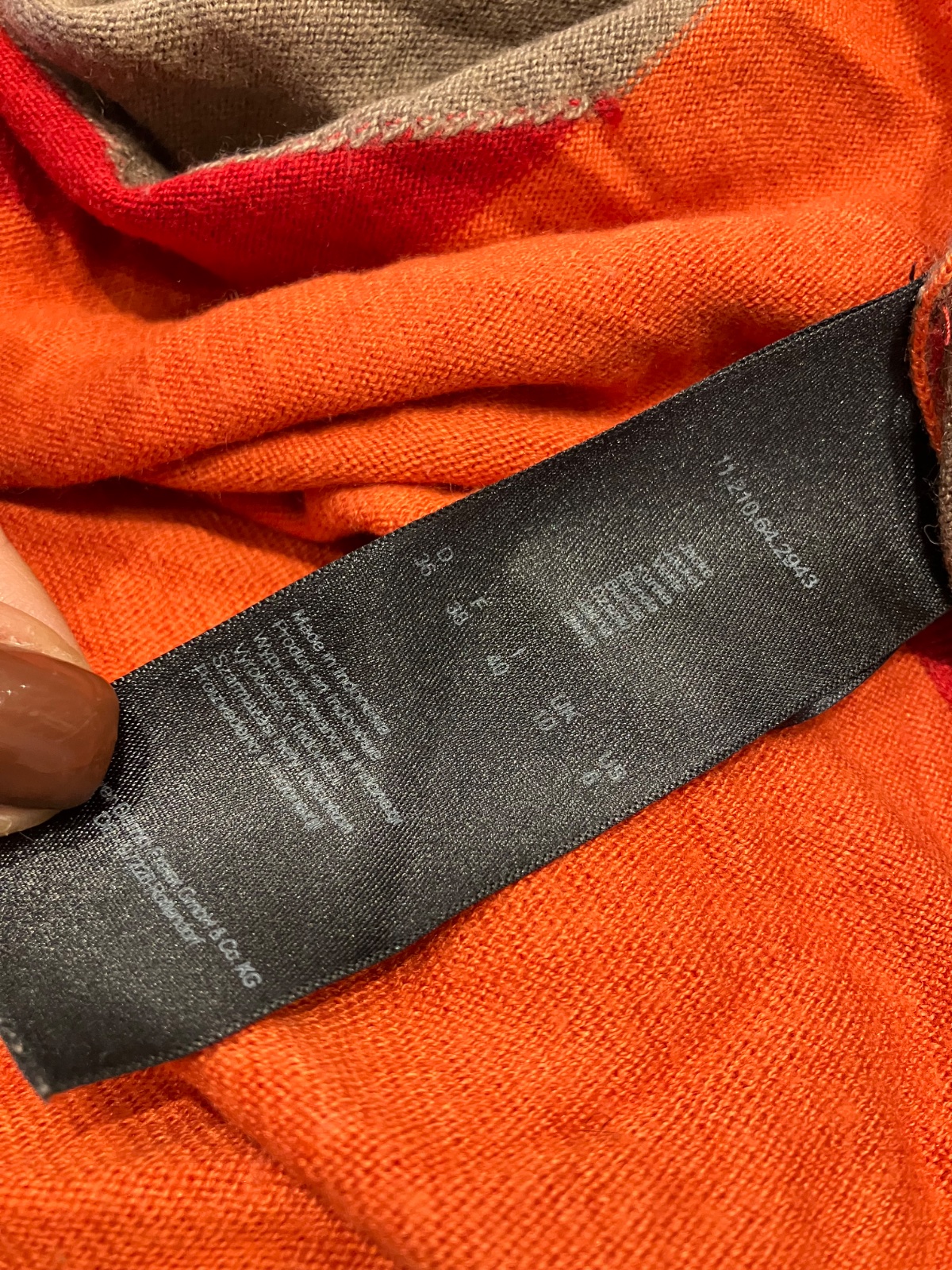 Dámsky kardigán, bez zapínania, tenký, elastický. Farba: hnedo-oranžovo-červená. Materiál 65%viskóza 32%polyamid 3%kašmír.