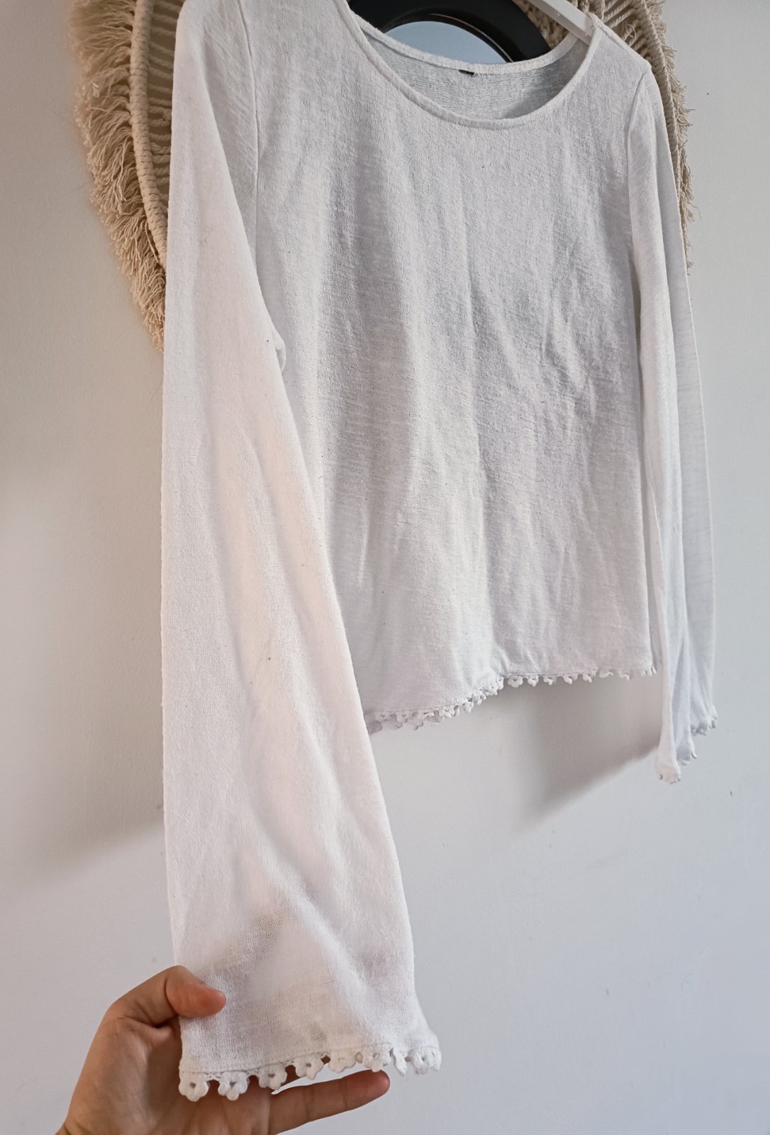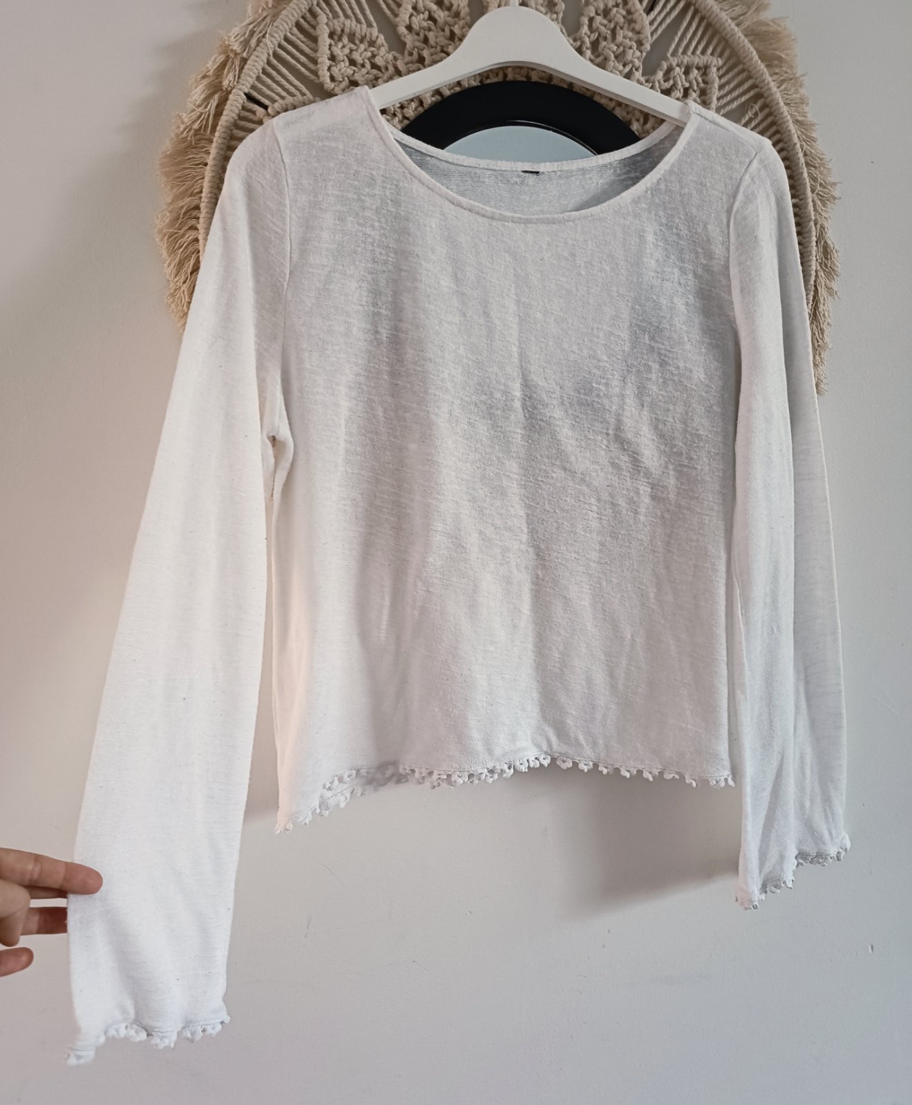 Predam noseny biely sveter. Ma zmolky a na spodnej casti svetra na jednej strane viac. Je to odfotene. Sirka pod pazuchami 41cm, dlzka 56cm, rukav od pleca 63cm