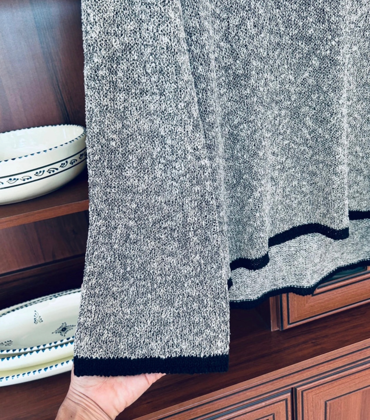 Jemne rozšírené rukávy, ukončenie na rukávoch a v spodnej časti čierny lem.