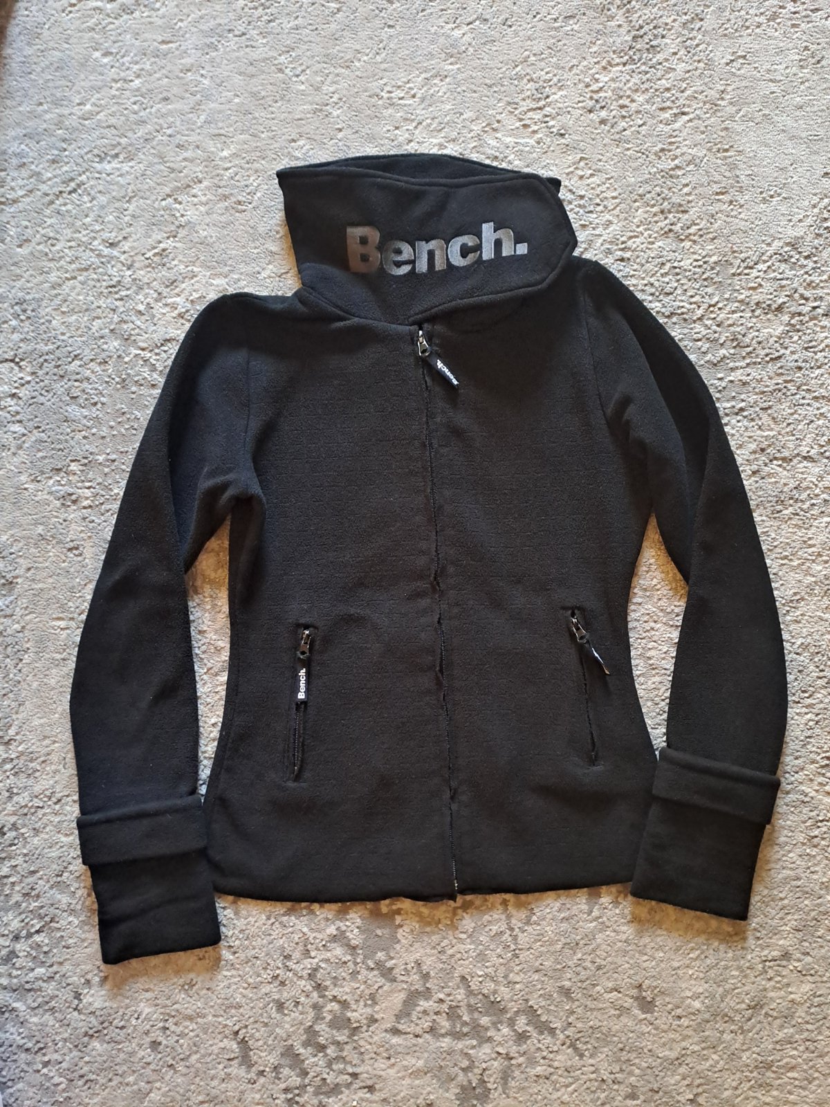 Znackova mikina Bench na zips, funkcne vrecka, predlzene rukavky s otvorom na palec, vo vybornom stave, material.zlozenie 100%polyester, zvnutra jemnunka prijemna na telo...dlzka 60,sirka 45,rukav ...