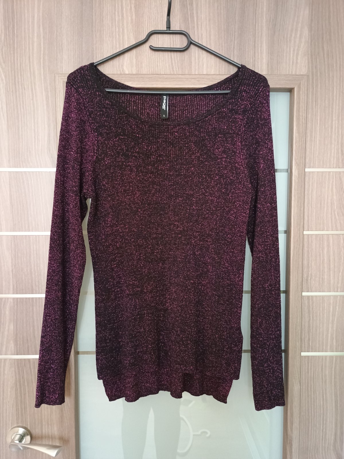 Krásny svetrík. Málinko noseny. Bez poškodenia. Širka pod pazuchami 38 cm. Dĺžka predný diel 63 cm, zadný diel 69 cm. Rukáv od pleca 65 cm, rukáv od krku 70 cm.