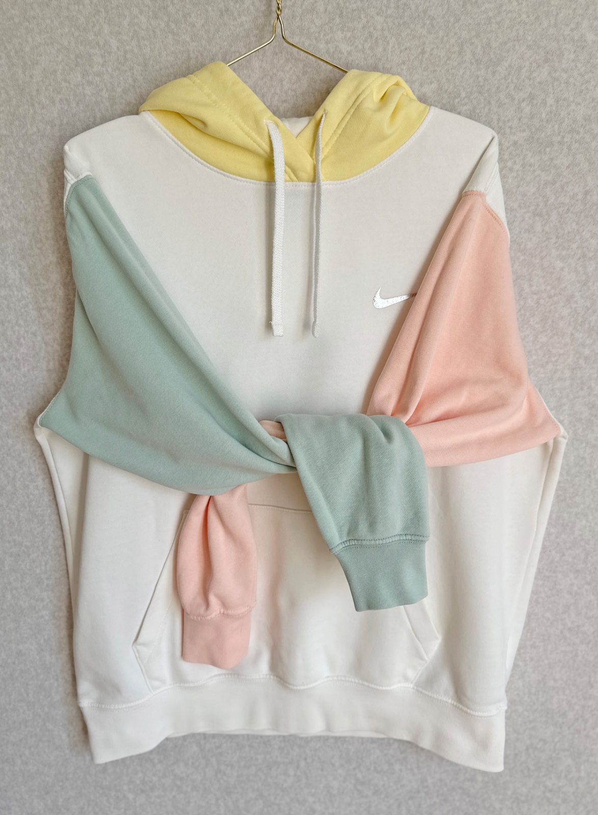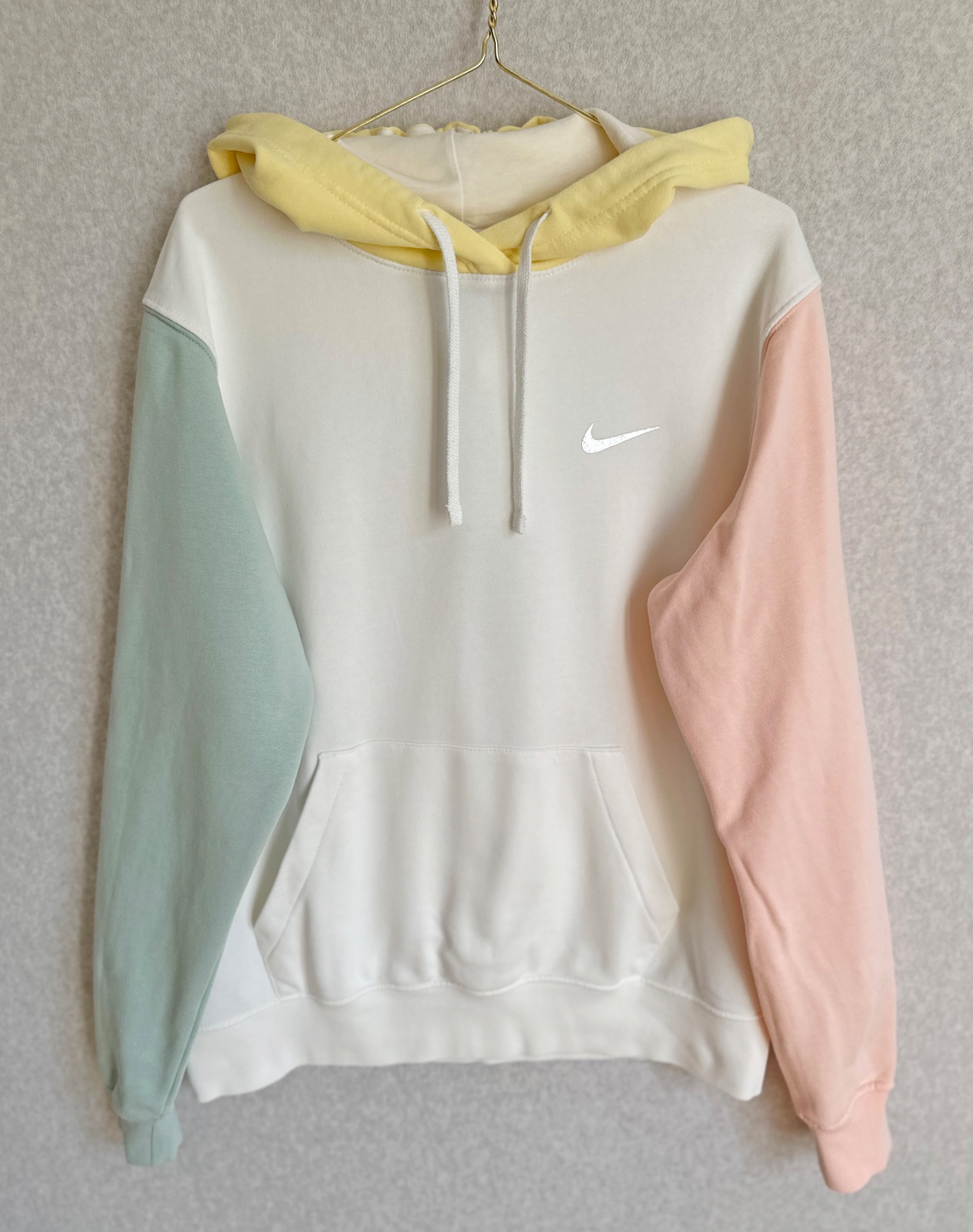 Krásna mikina s kapucňou a predným vreckom v pútavom farebnom prevedení centrovanej bielej lemovanej pastelovými farbami na rukávoch a kapucni. 80% bavlna, 20% polyester. Pranie v pračke 30°C. Minimálne použitie, v super stave, bez poškodení.