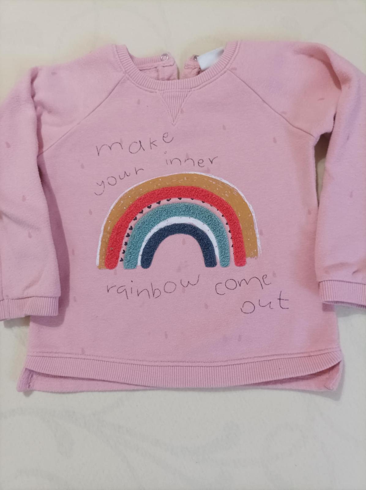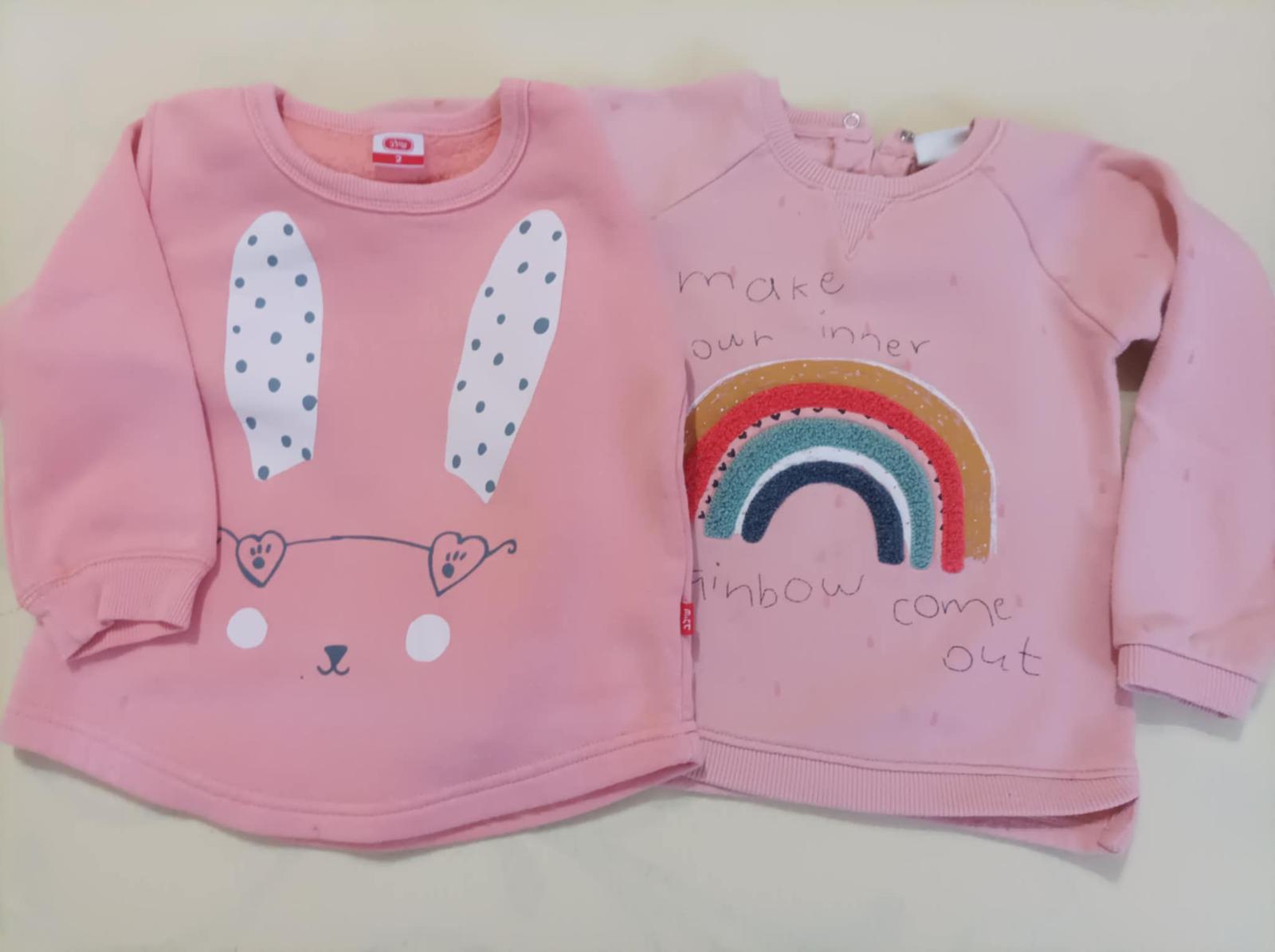 Predám dve teplakové mikiny zn. Zara velkosť 98 s krásnymi aplikácia viacfarebnou duhou a bondovanou myškou na prednej časti.
