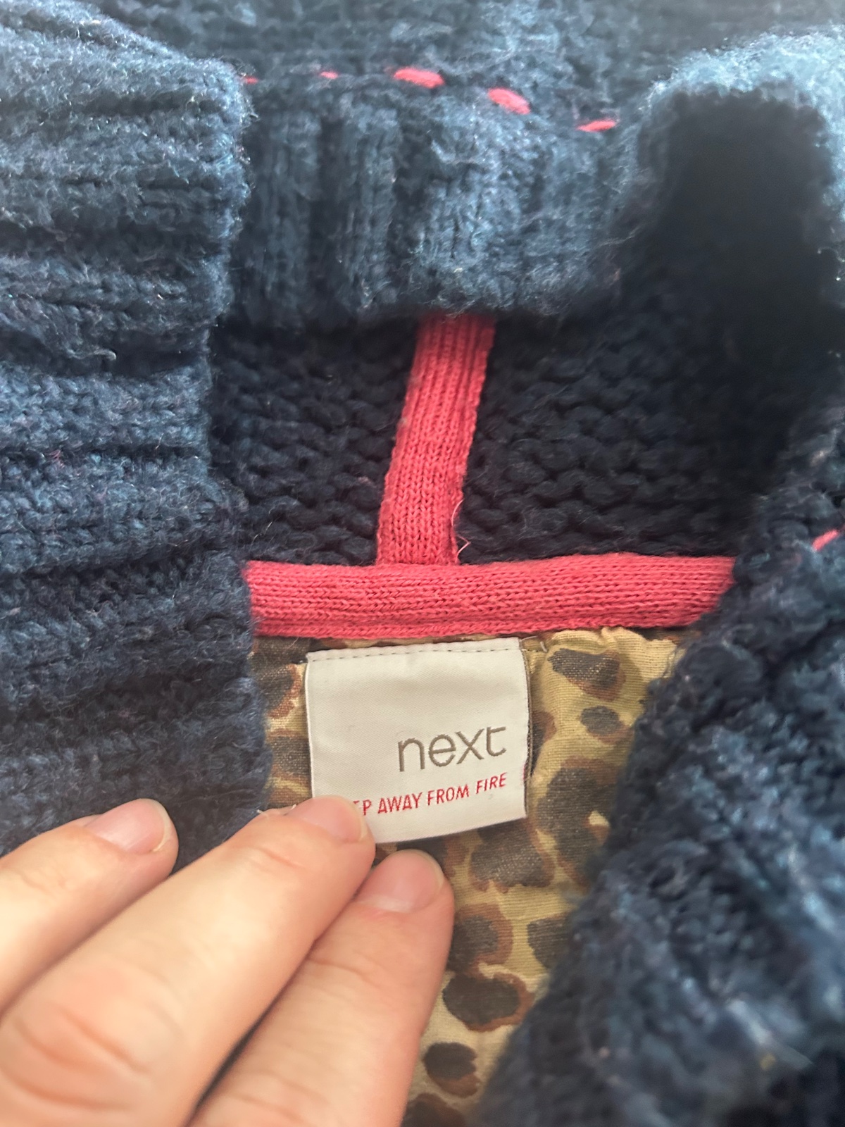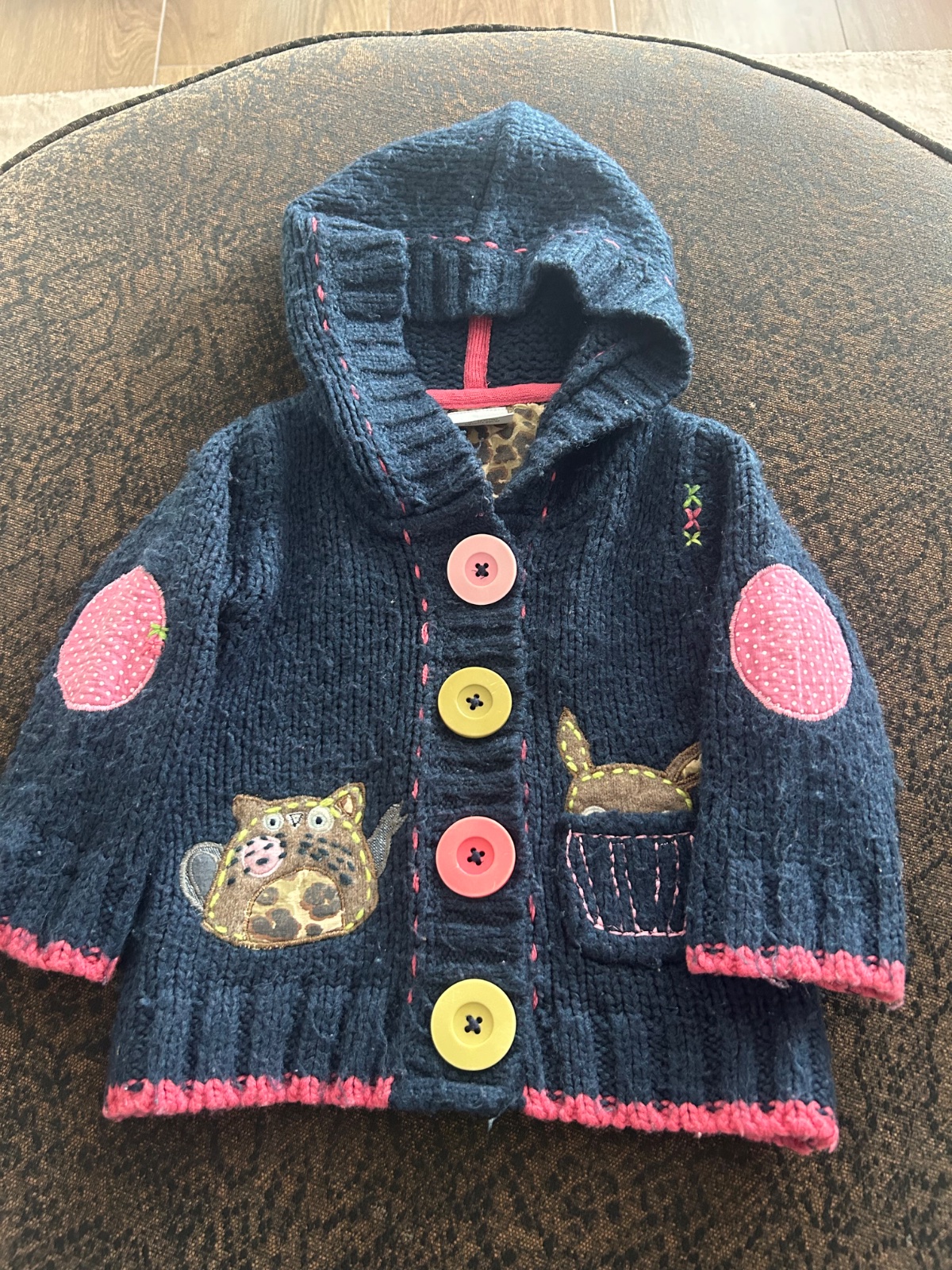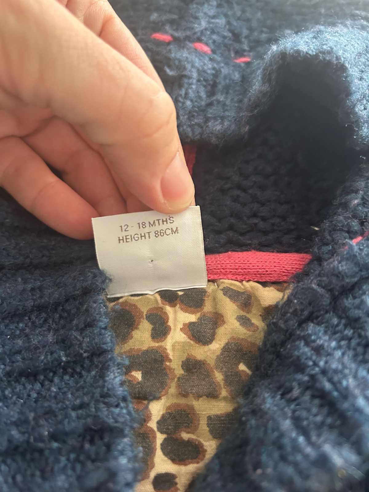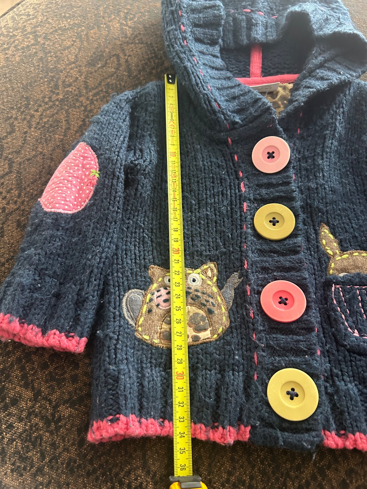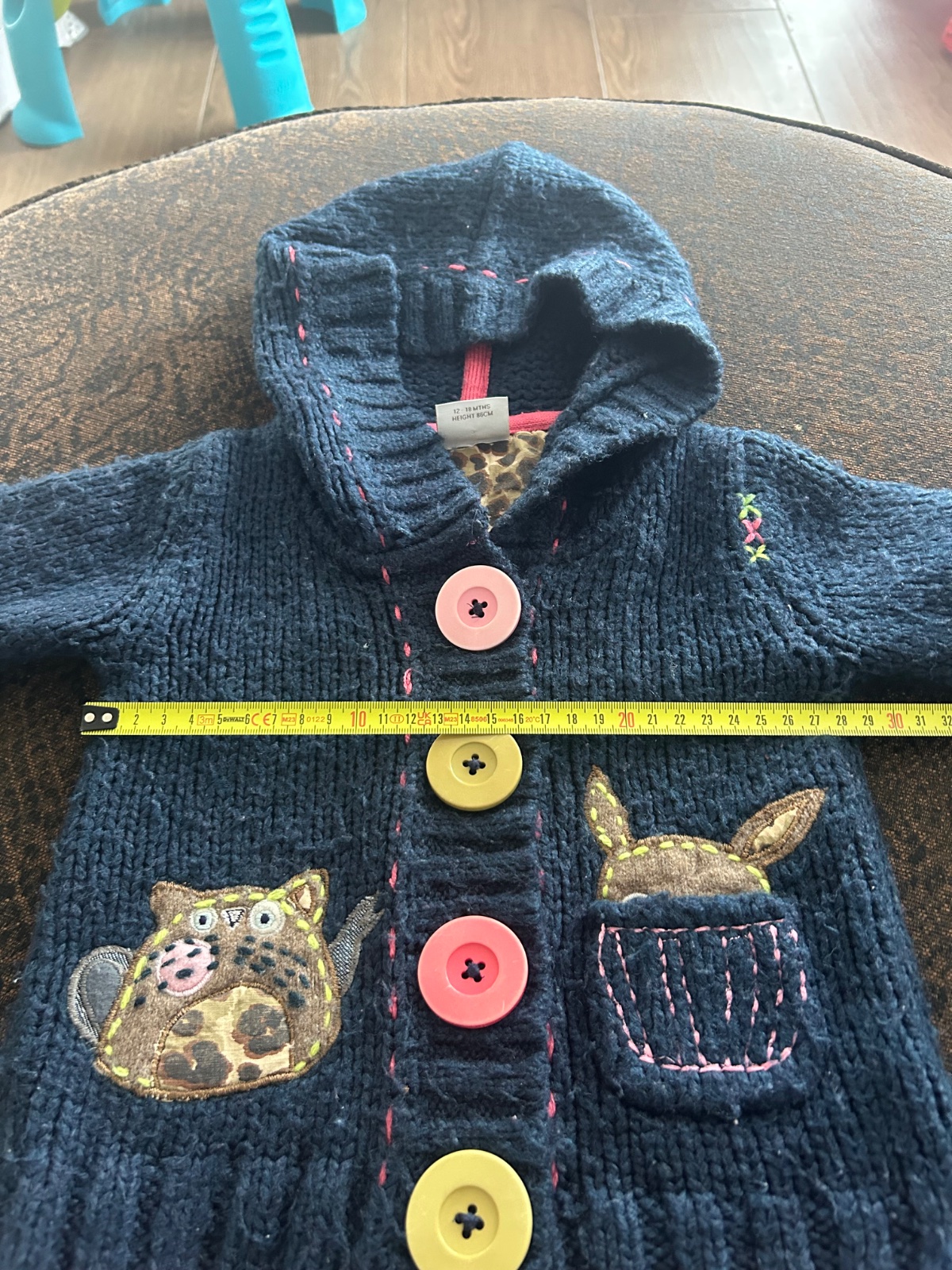 Nadherny pleteny svetrik. Gombiky sa lahko zapinaju. Nie je prilis hruby, je pleteny, ale nema podsivku. Velkost 86, ale my sme nosili aj ako 92. Ma trochu zmolky, ale odzmolkovac pomoze ak to niekomu vadi.