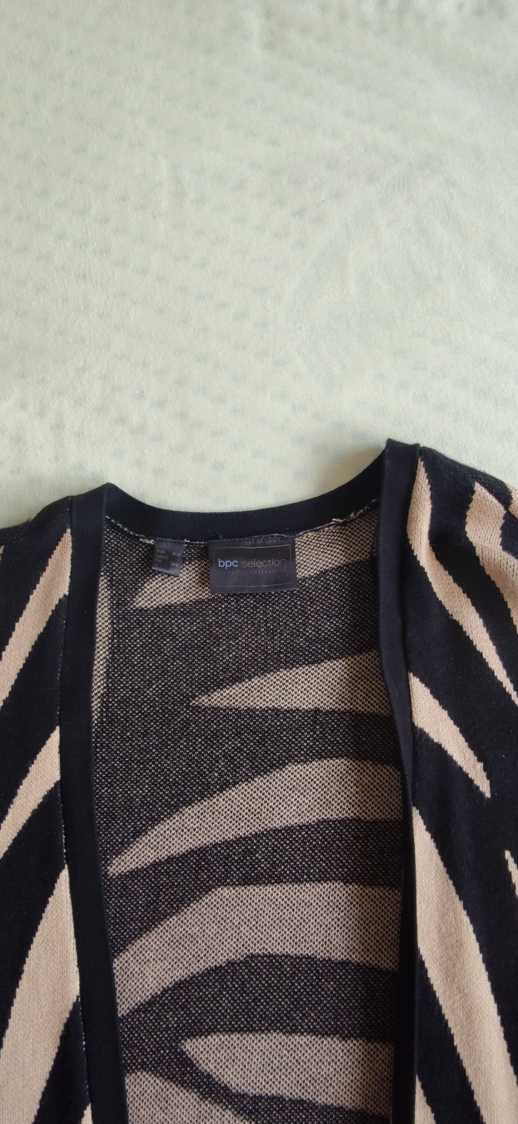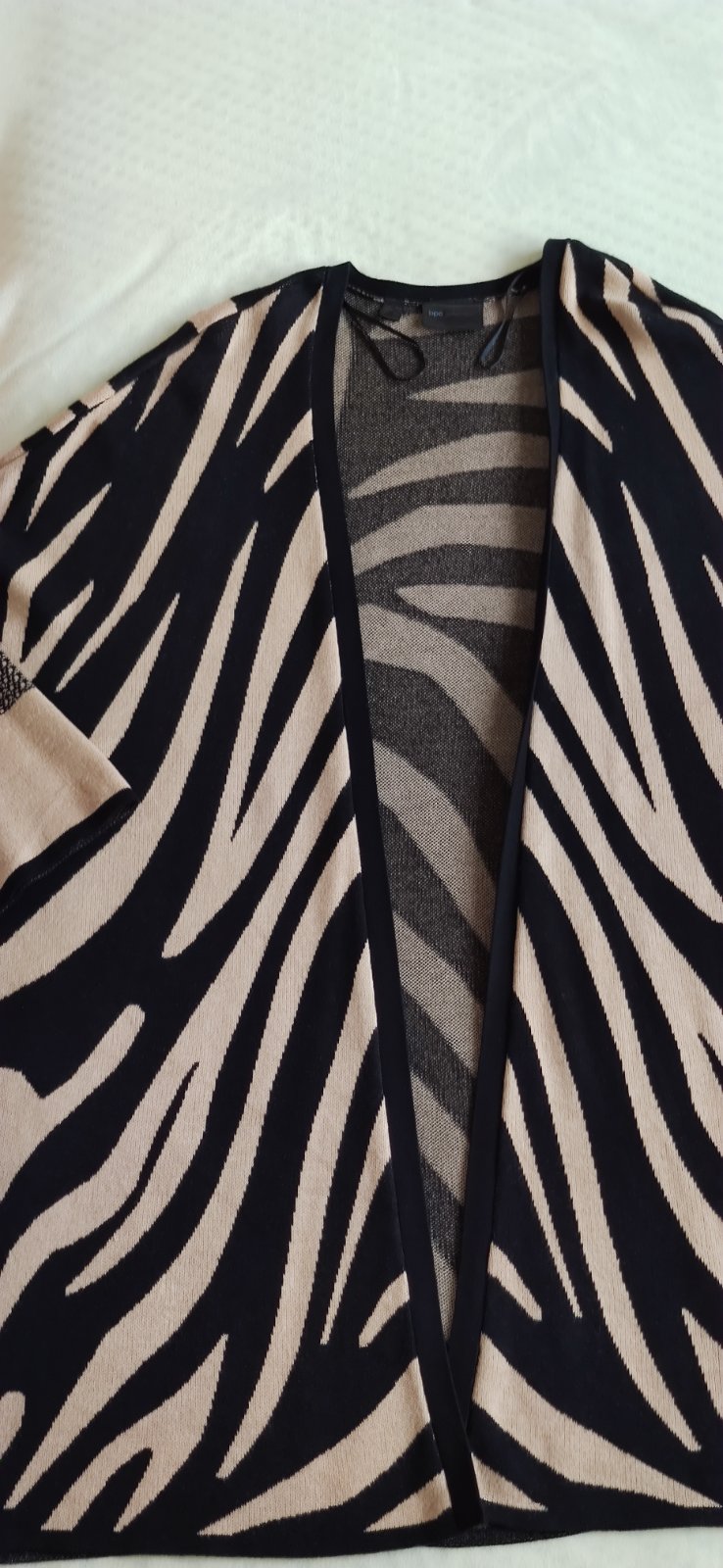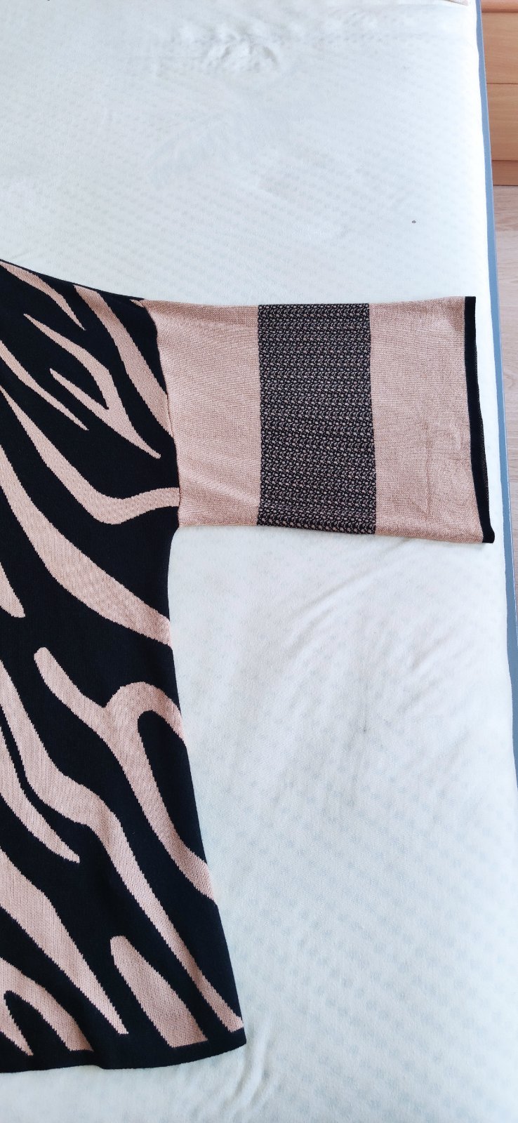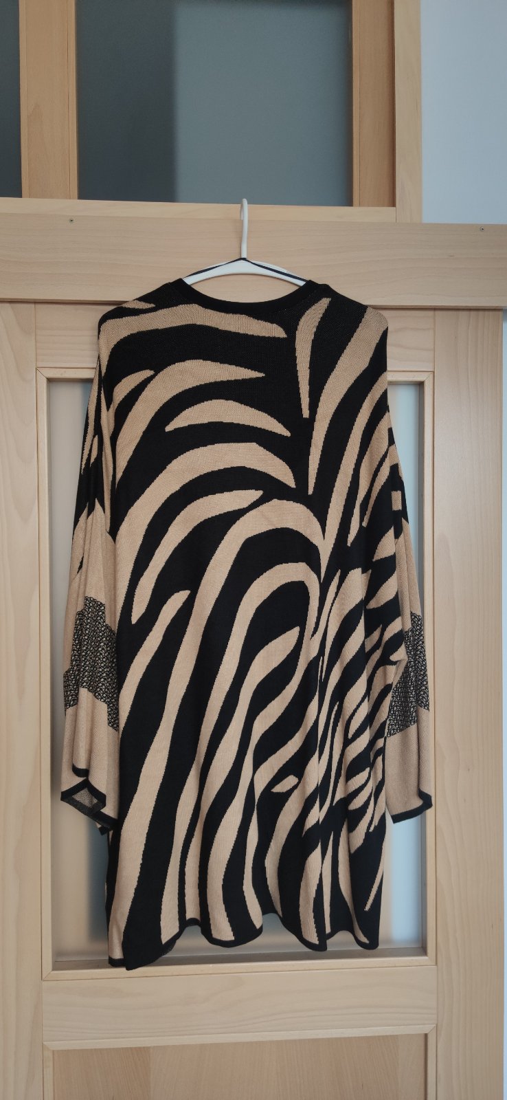 Predám oversize sveter. Má široké netopierie rukávy. Je možné nosiť ho voľne alebo napr. s opaskom. Vhodný na prechodné obdobie. Veľkosť je univerzálna. Na visačke píšu 36/38, ale pasuje aj na veľkosť 44/46. Farba čierna/ béžová.