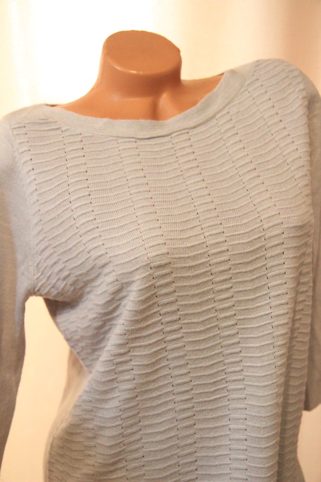 Bledo šedý pletený sveter, 7/8 rukávy. Nosený, bez poškodení, pár mini žmolkov.