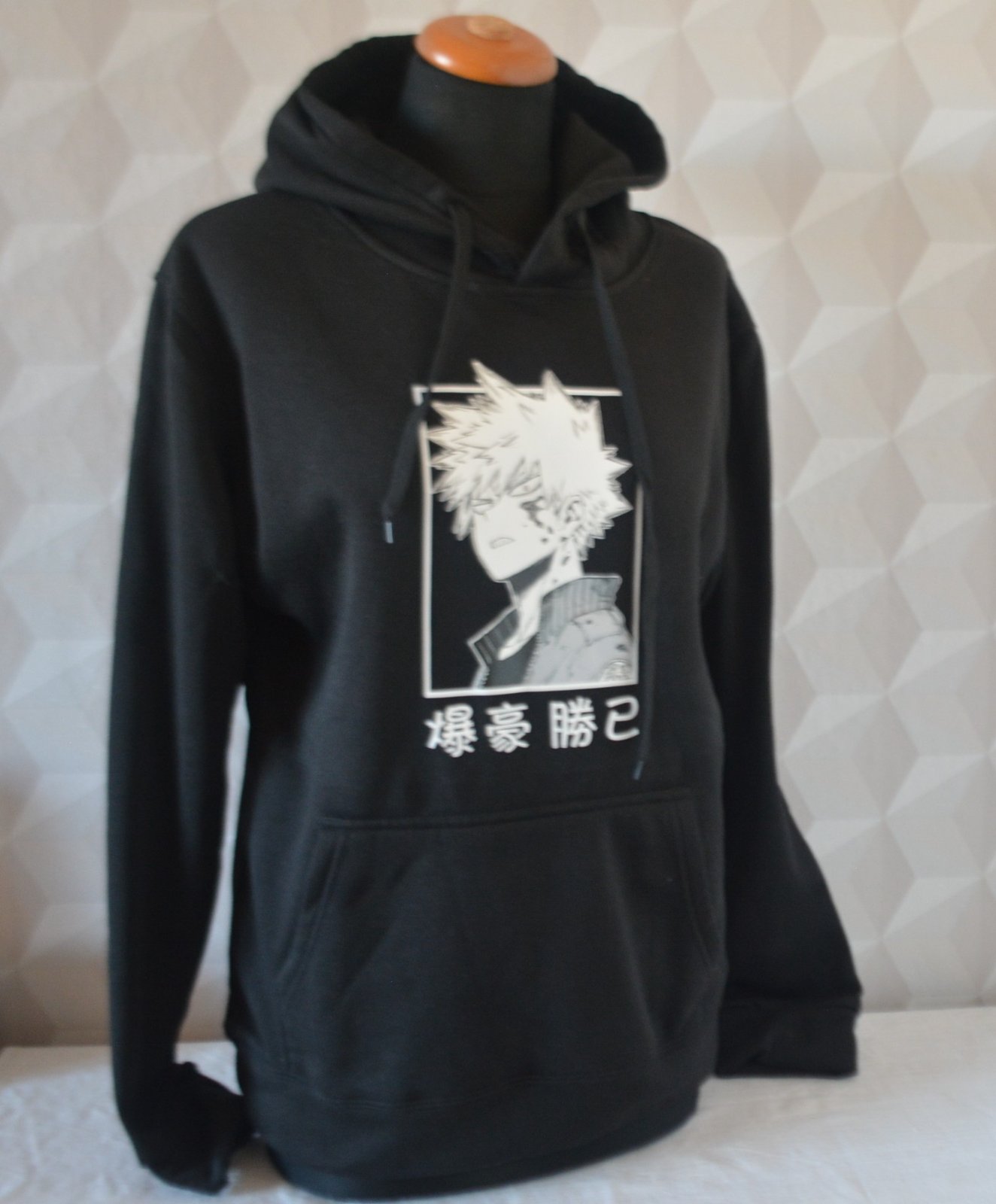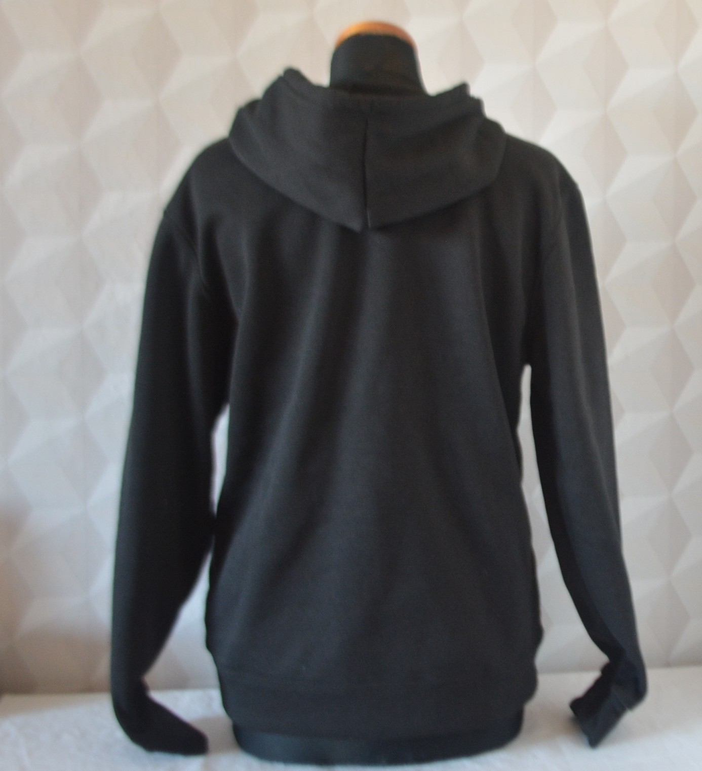 Čierna mikina s kapucňou a bielou aplikáciou, veľ. M, rozmery: dĺžka 64cm, pod pazuchami 2x52cm, rukáv od krku 74, od pleca 62 a od pazuchy 46cm.