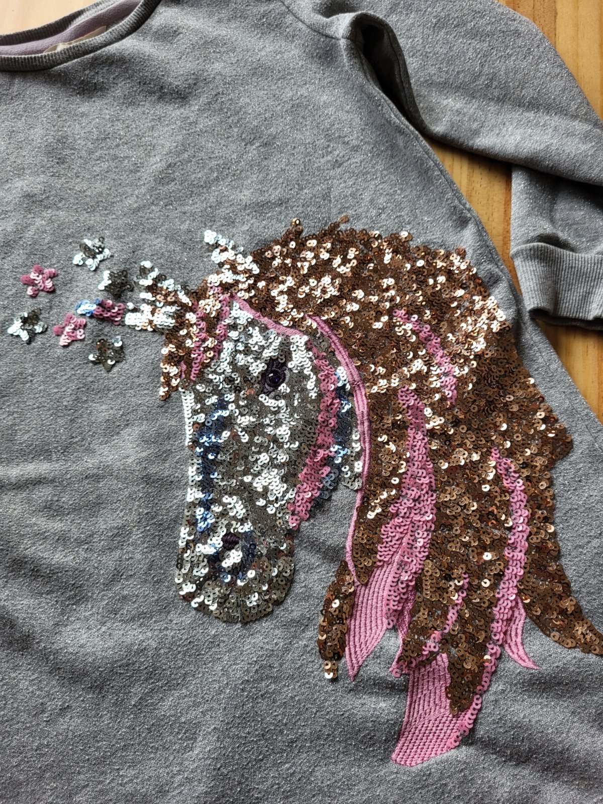dobrý stav, žmolky no strácajú sa v melírovanom vzore, veľmi originálna vďaka flitrovanému jednorožcovi, krásna, v látke zakonponovaná metalická niť, tenká, predĺžená, pošlem buď poštou alebo packetou