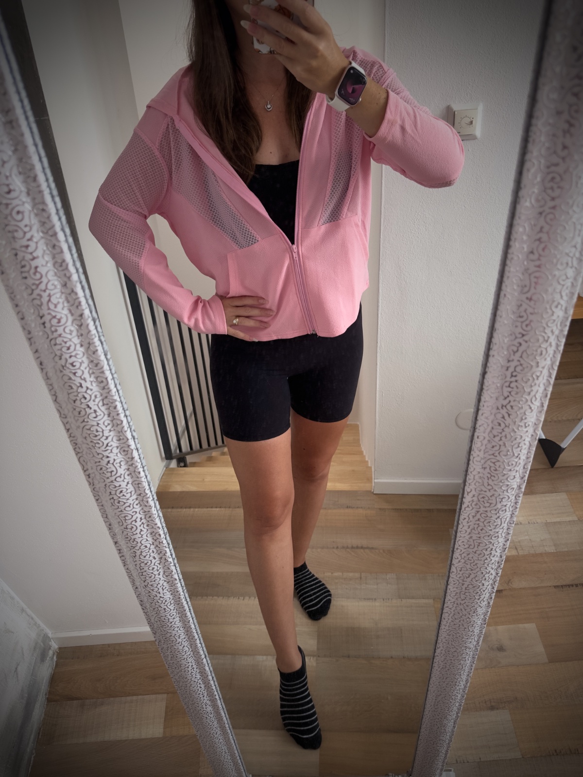 Svetloružová športová mikina vhodná na šport, beh, fitness. Na bokoch priedušná časť. Mikina je v oblasti hrudníka voľnejšia, veľmi pohodlná. Bola asi 3x použitá, bezchybný stav.