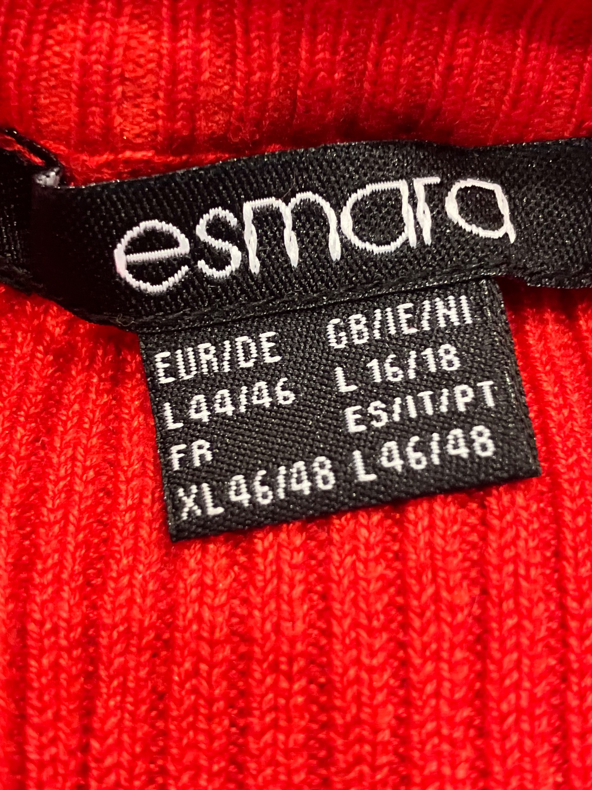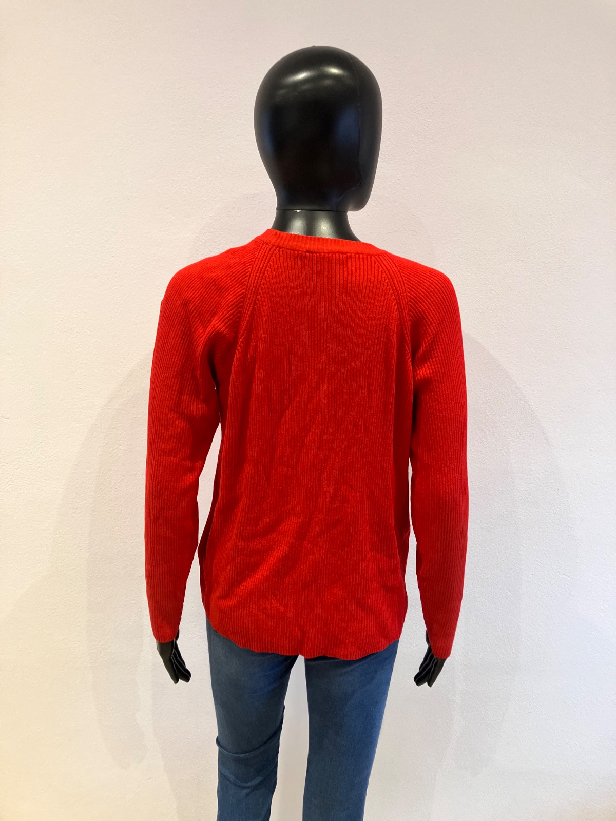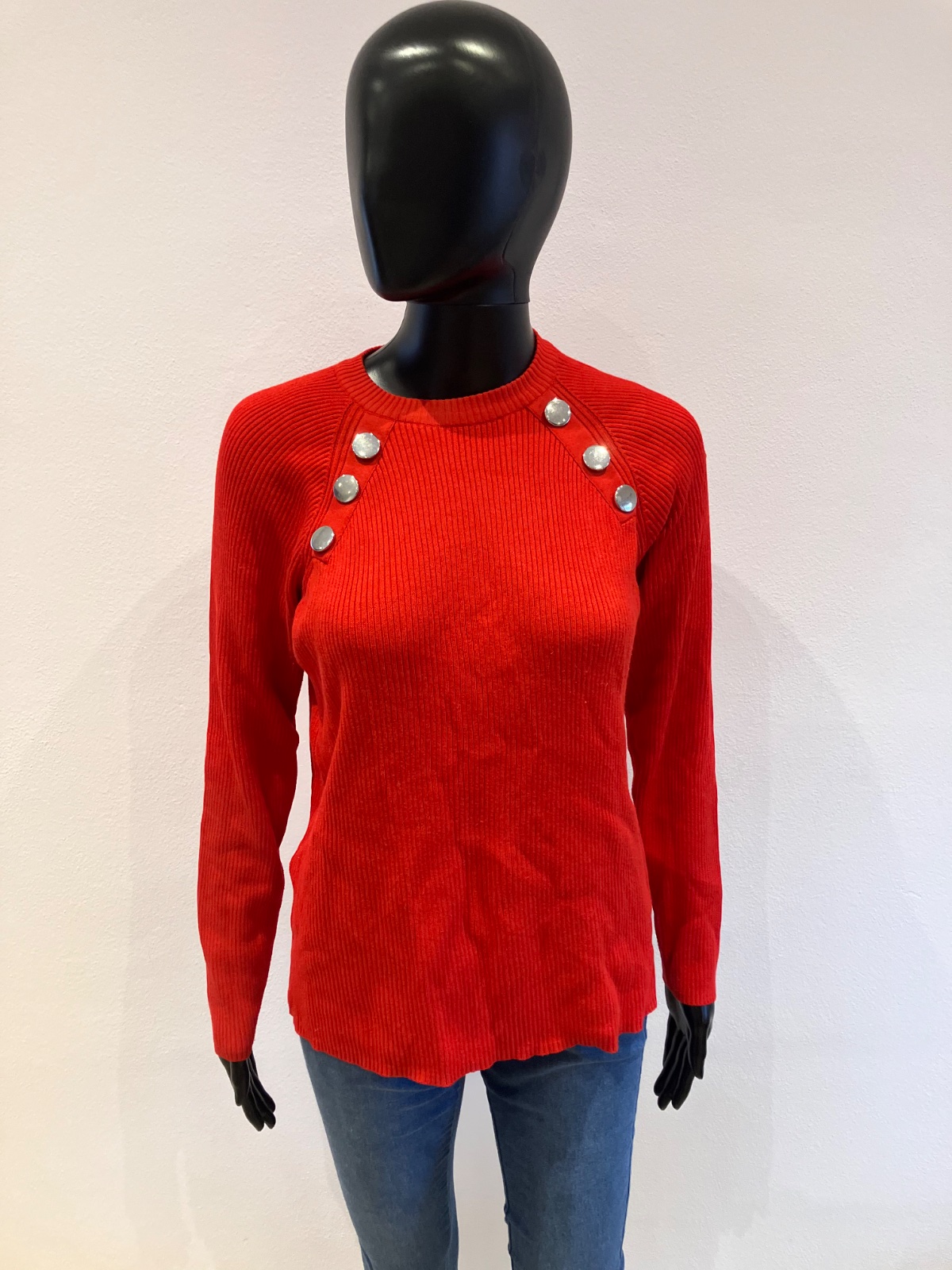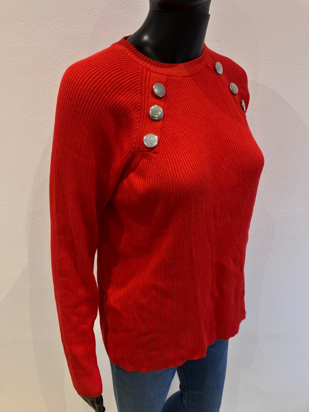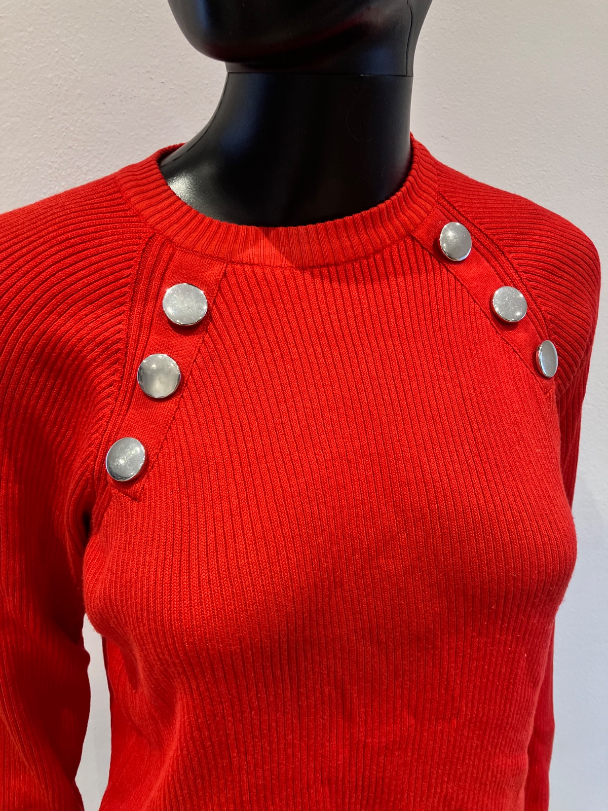 Dámsky červený sveter so striebornými gombíkmi, rebrovaný, elastický, materiál 70%viskóza 30%polyamid.