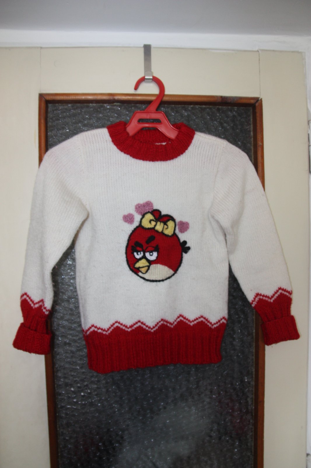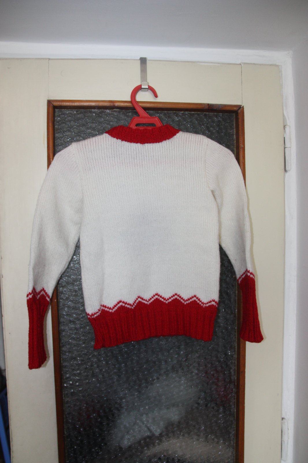Rucne strikovany pulovrik. Parkart obleceny, vyborny stav. Dcera na foto mala 4,5 roka. Bol robeny tak, aby sa najprv nosil s vyhrnutym lemom na rukave a dalsi rok s vystretym.