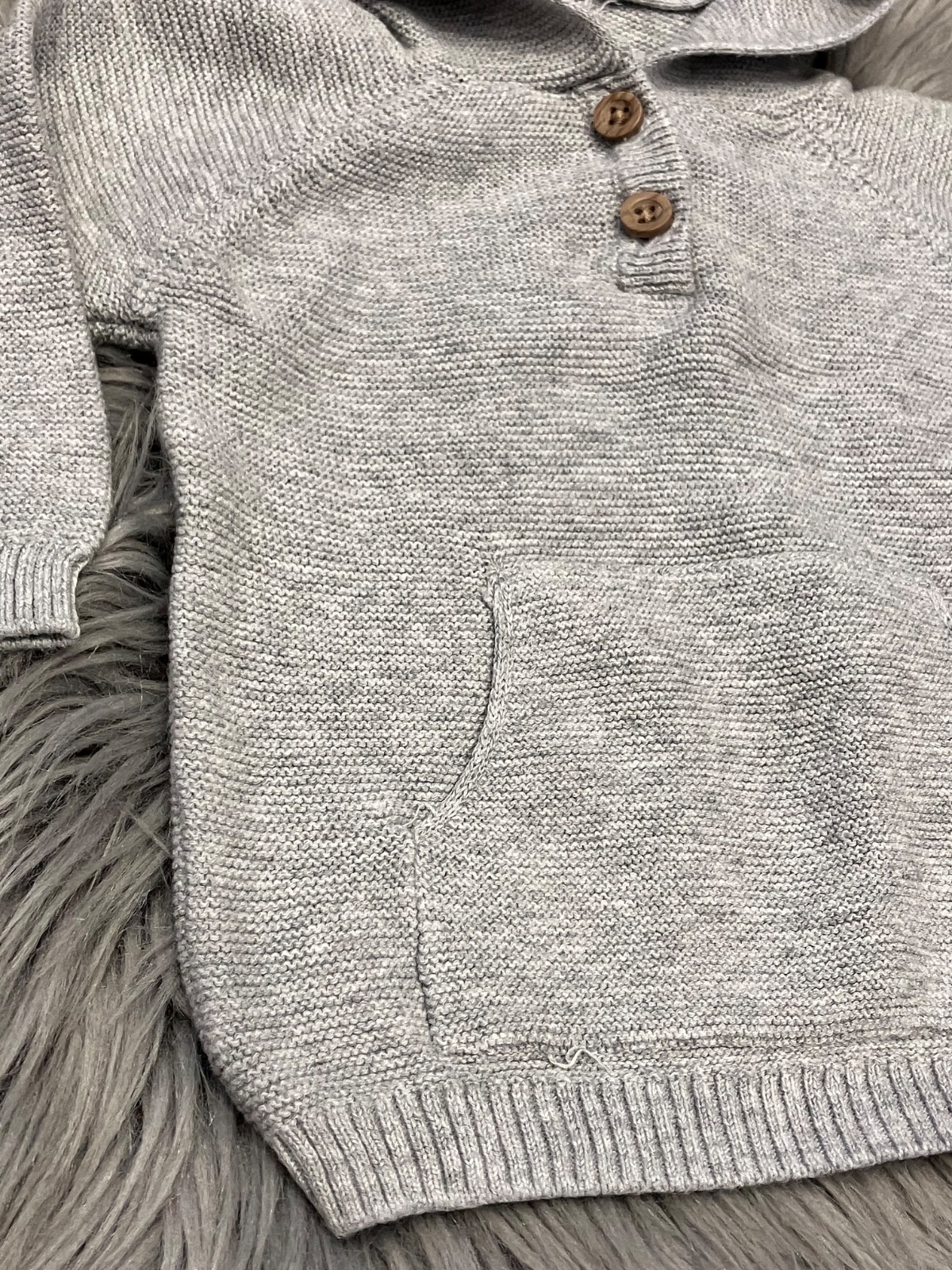 Chlapčenský sveter s kapucňou, sivý, tenký, elastický, zapínanie na dve gombíky, klokanie vrecko, materiál 100%bavlna.