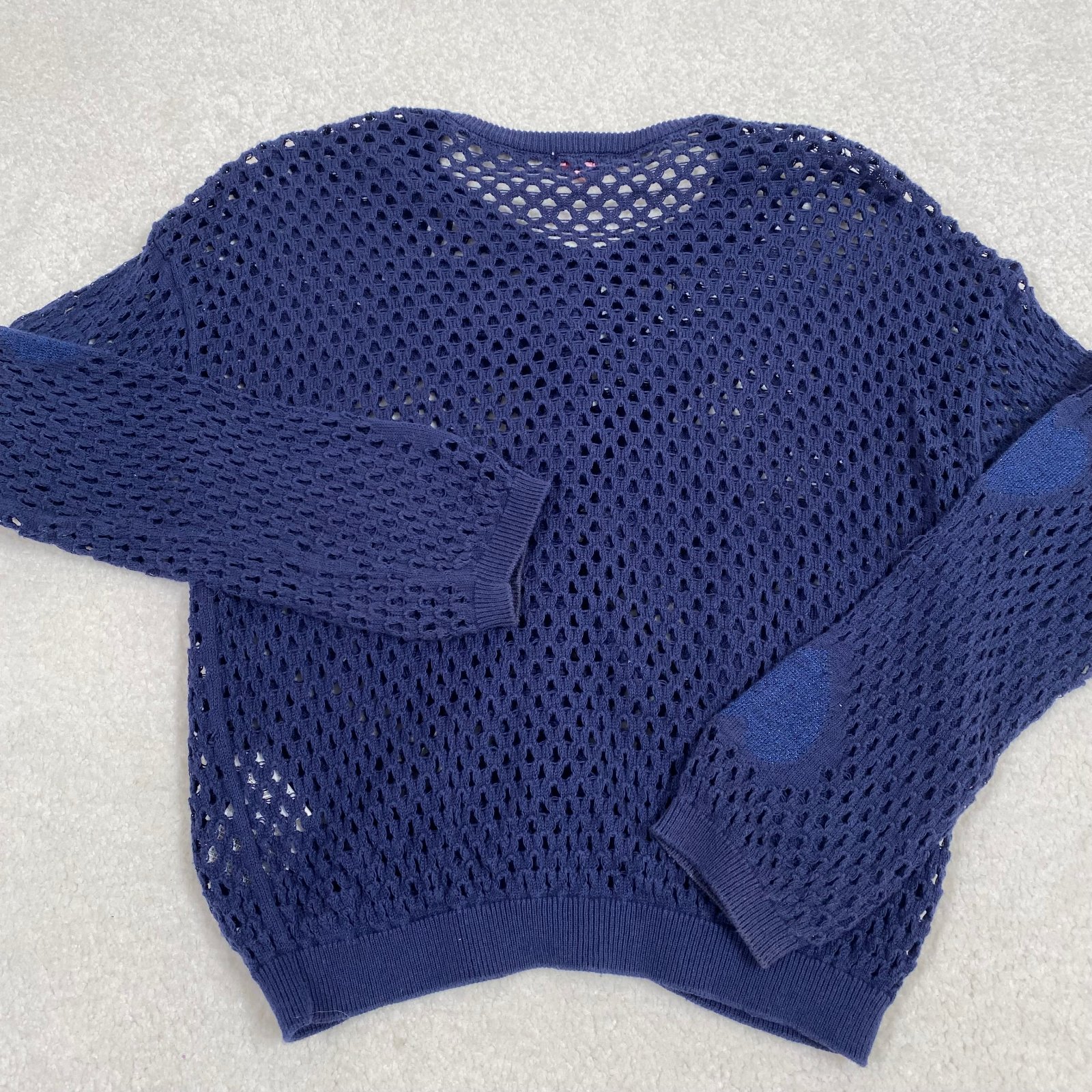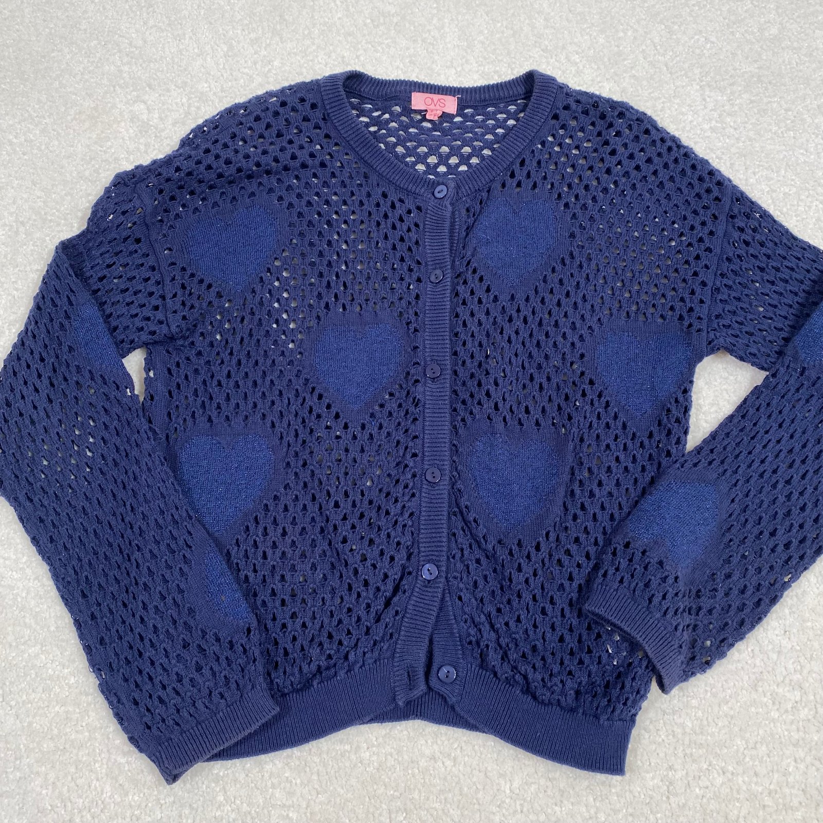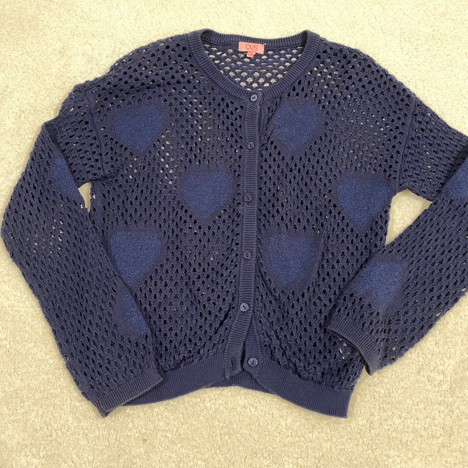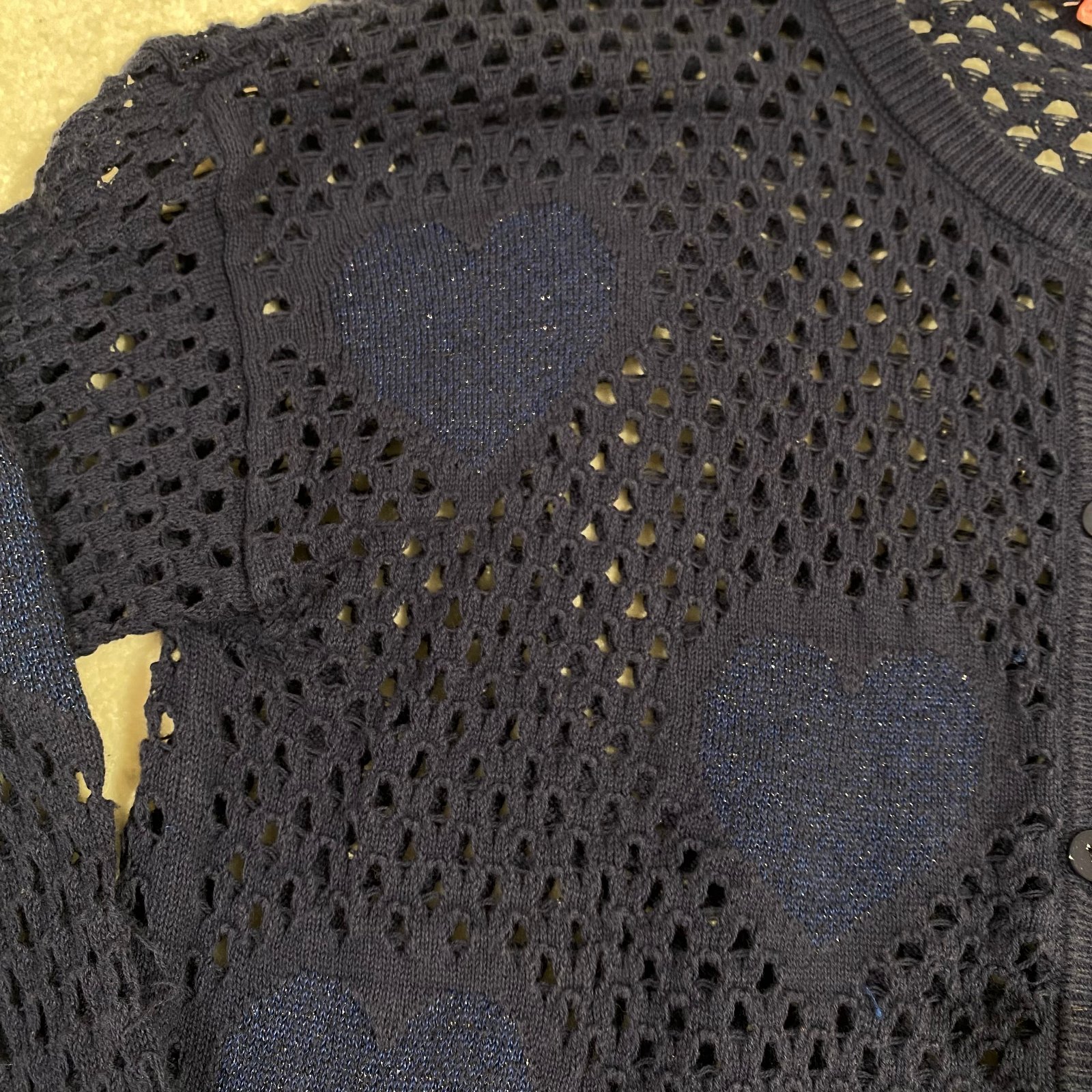 Pekný dierkovaný tmavomodrý svetrík so srdiečkami vhodný na spoločenské šatky. V dobrom stave. Dĺžka je 46cm, šírka je 40cm, dĺžka rukáva od krku 59cm.