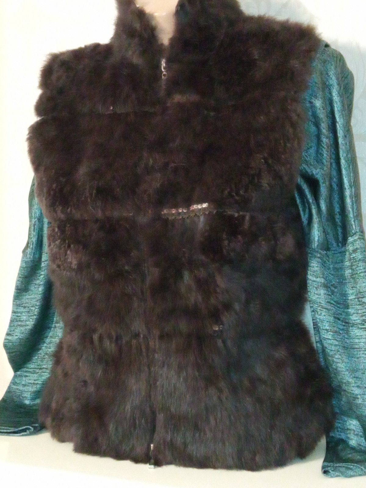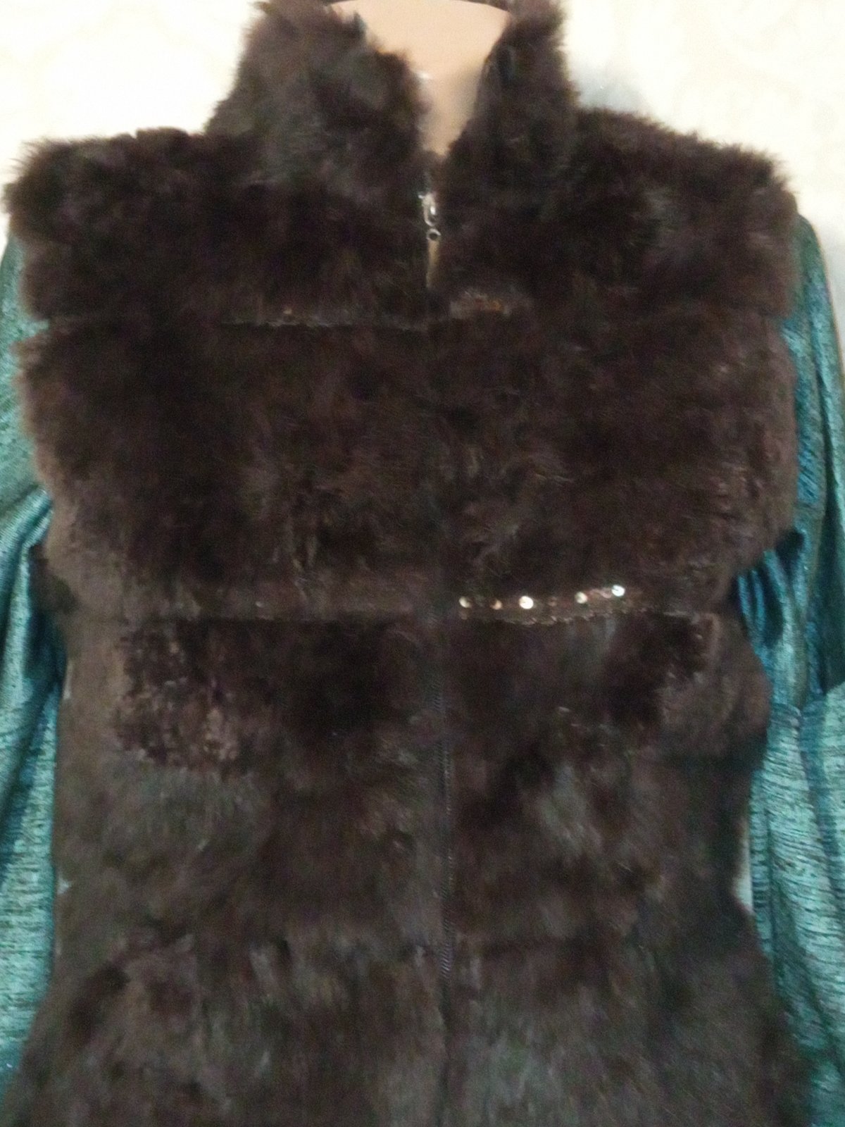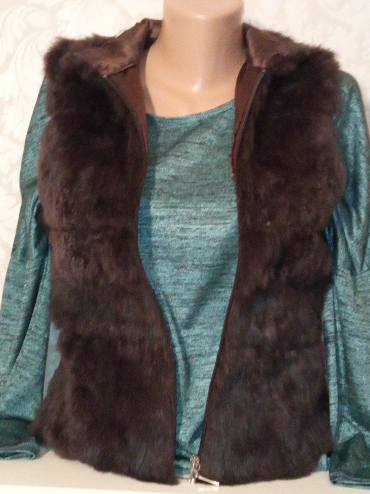 Tenšia vesta. Vpredu chĺpatý materiál (plus flitre),vzadu pletená. Zapínanie na zips. Materiál 100%vlna. Veľkosť:cca 158-164.