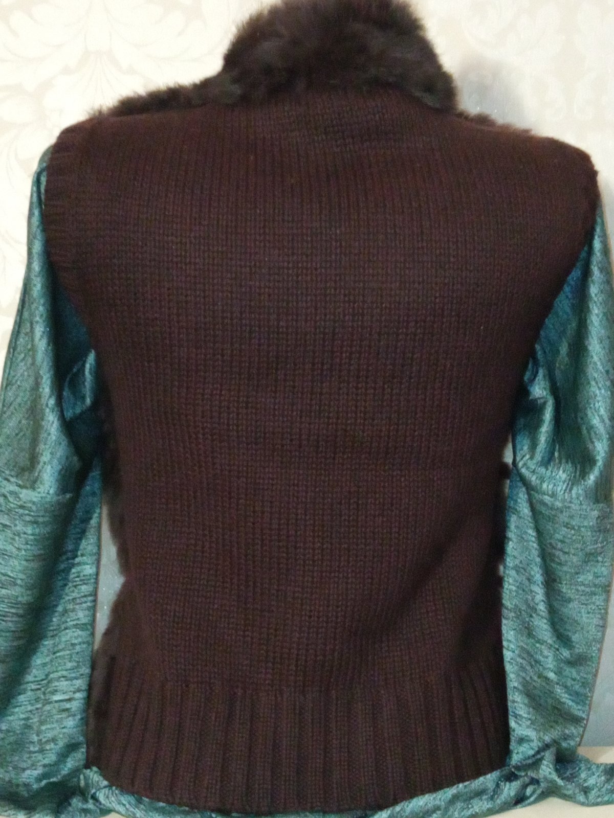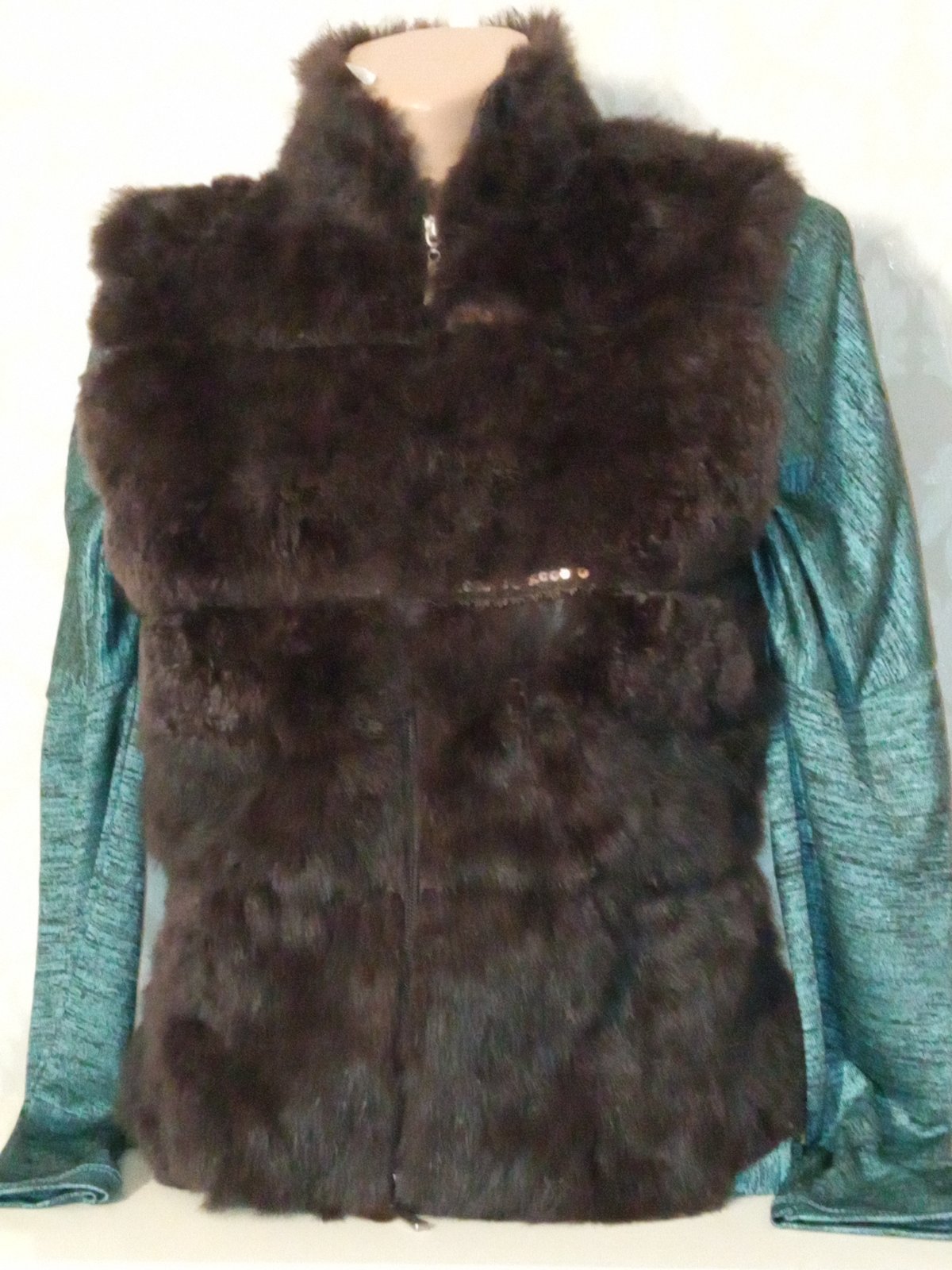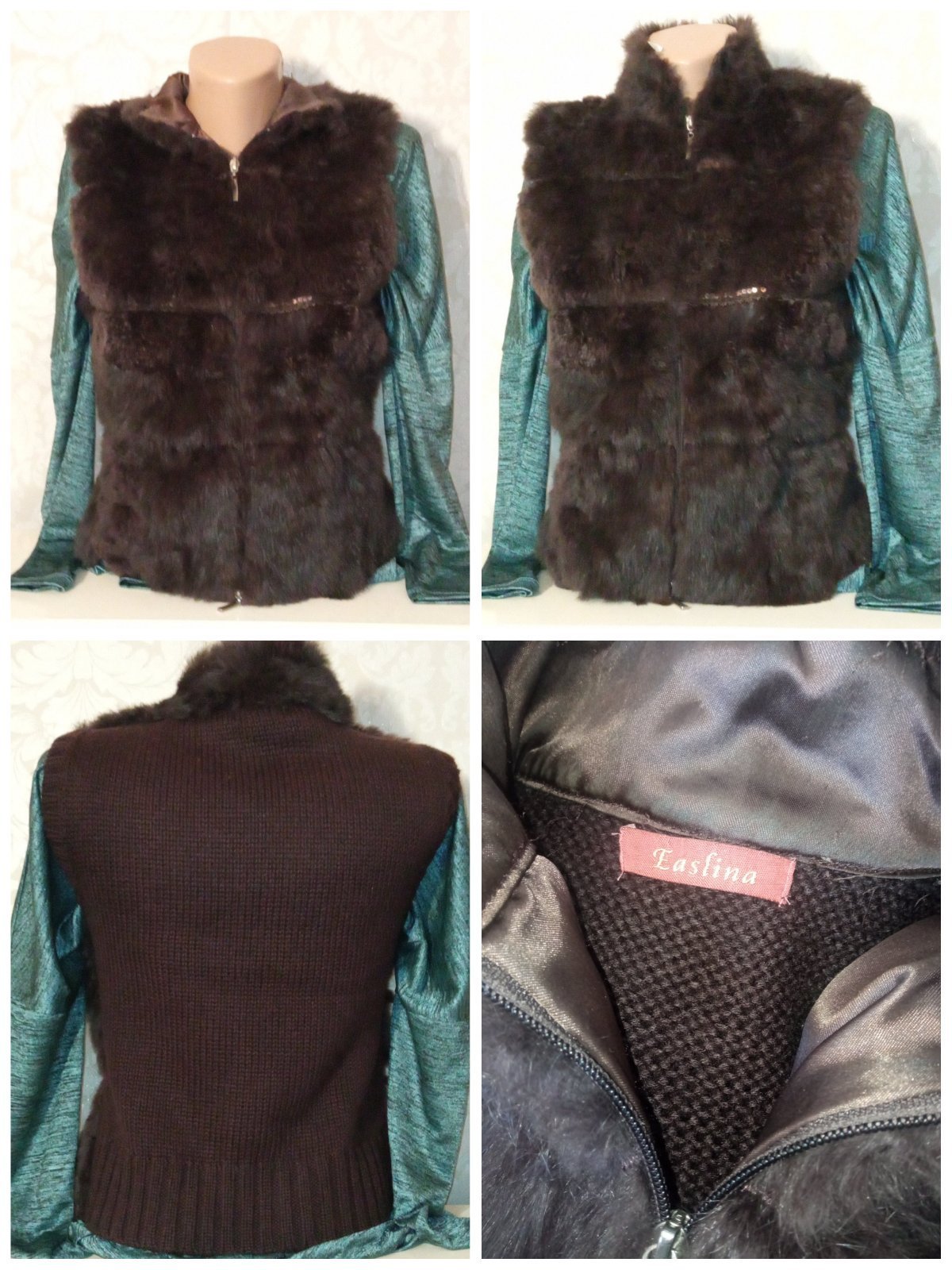 Tenšia vesta. Vpredu chĺpatý materiál (plus flitre),vzadu pletená. Zapínanie na zips. Materiál 100%vlna. Veľkosť:cca 158-164.