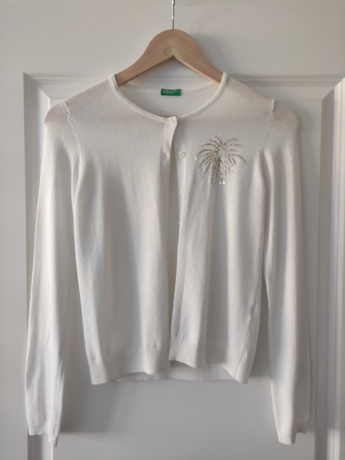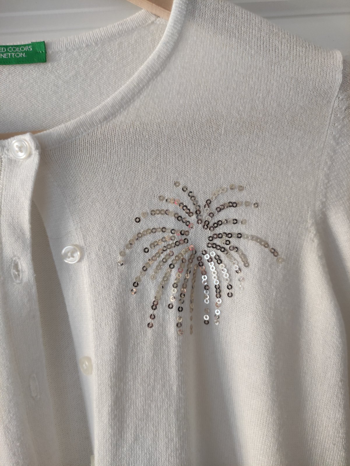 Krasny jemny svetrik vo vybornom stave, s trblietavou aplikaciou. Jemna maslova farba. Rozmery: hrudnik 39x2cm, celkova dlzka 54cm, dlzka rukava od krku 70cm.