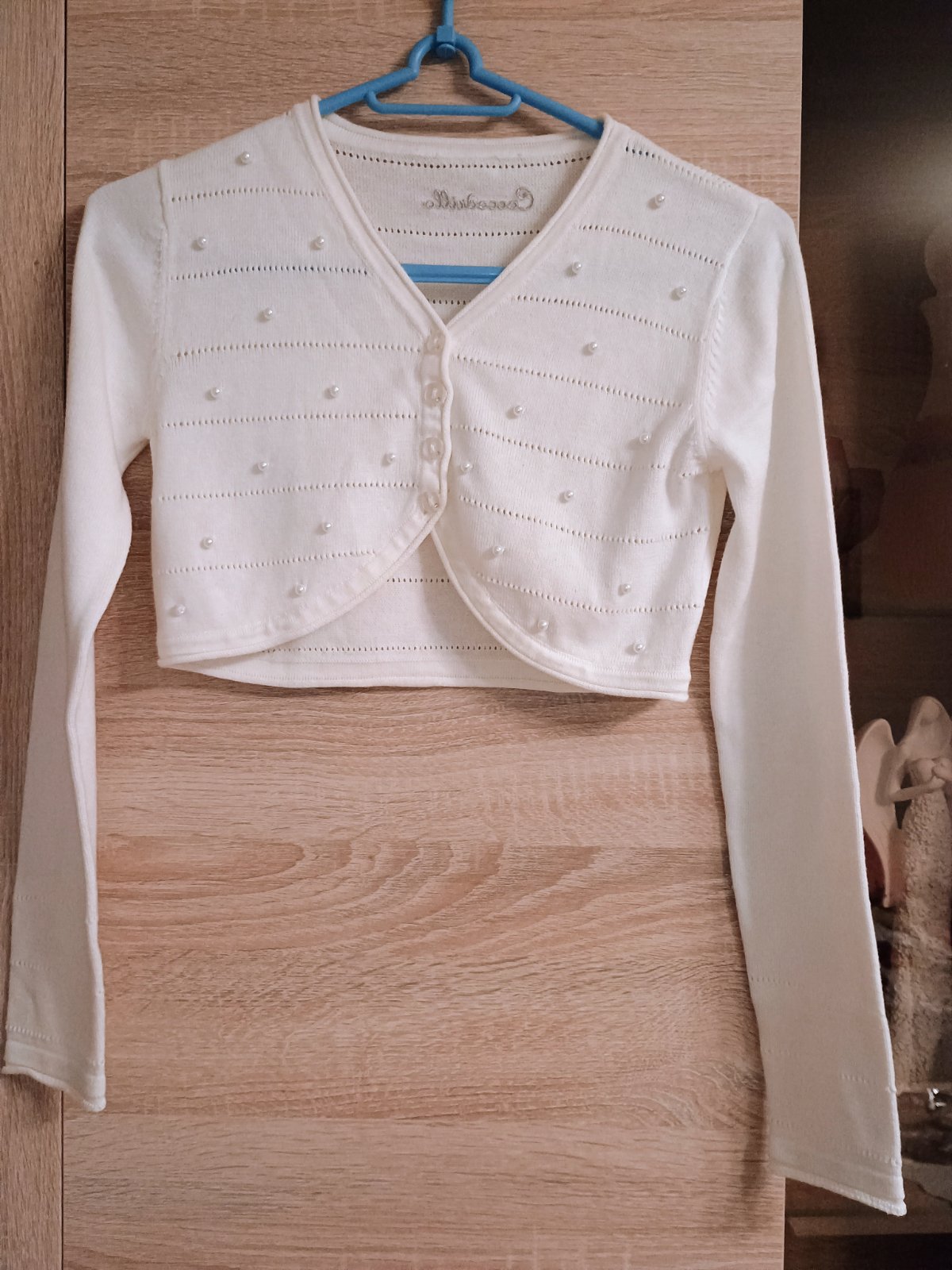 Krásne pletené bolerko ozdobené korálikmi, dĺžka rukáva od krku 61 cm, šírka 2x35 cm, pružná bavlna.