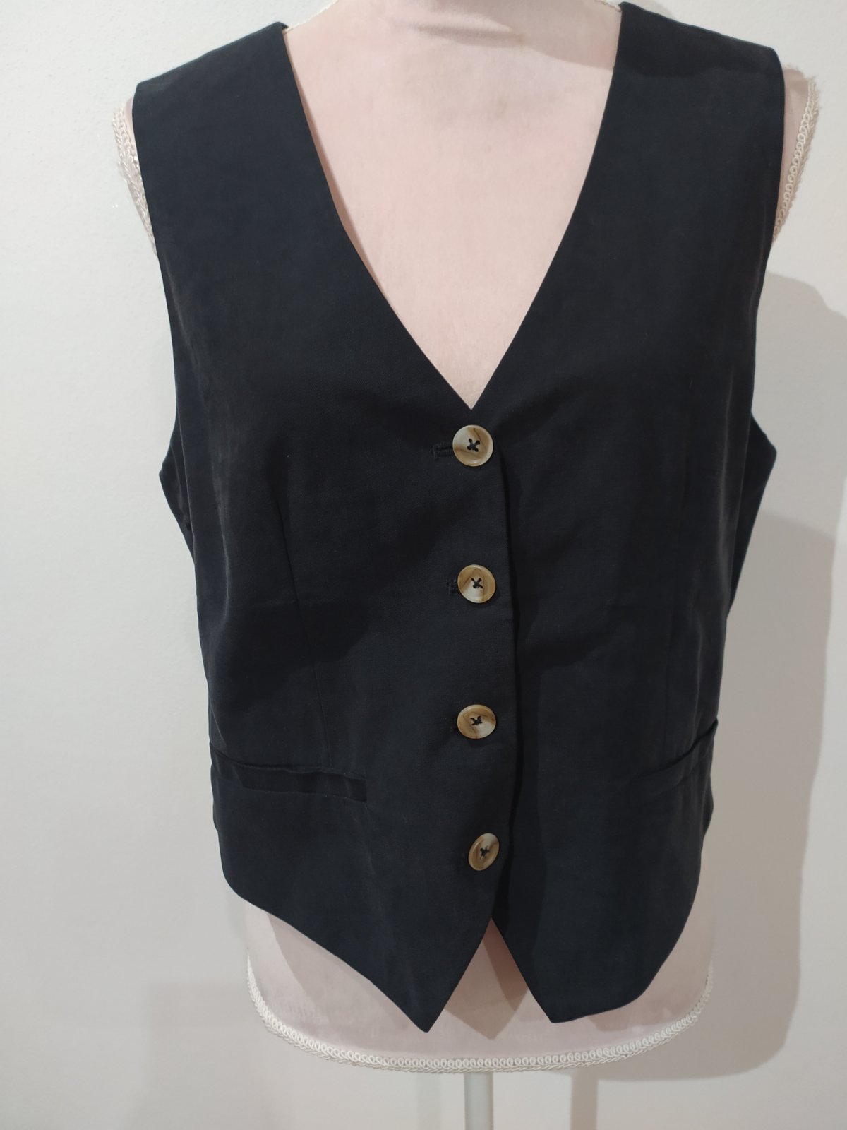 Vesta rovného strihu z viskozovej tkaniny,véčkovy výstrih,tvárujúce záševky,,zapínanie na gombíky ,ozdobené vrecká, nenosená