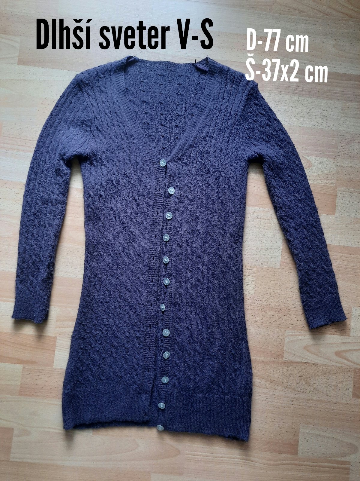 Predám krásny svetrík so zapínaním na gombíky s pekným pleteným vzorom. Má príjemný mäkký materiál. Sveter je predĺžený, pod zadok- rozmery sú na poslednej fotke.