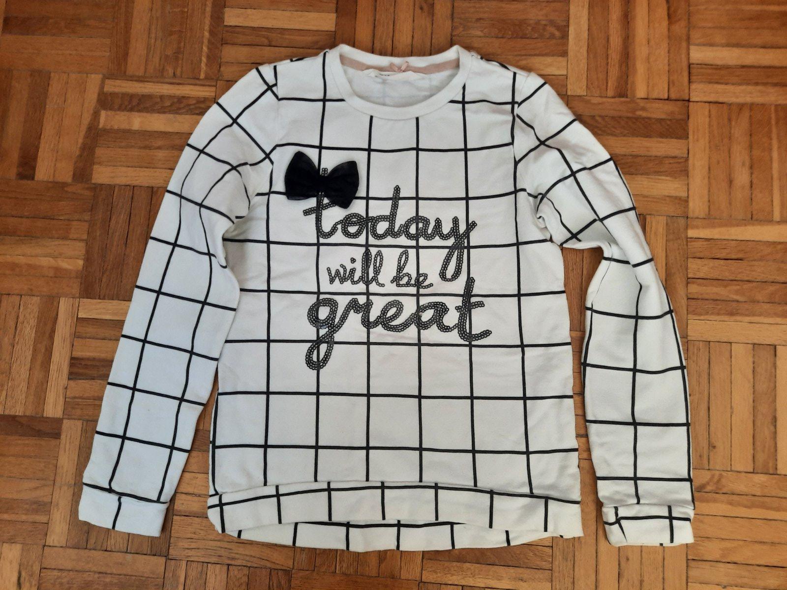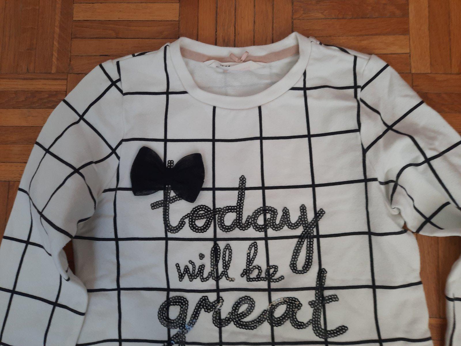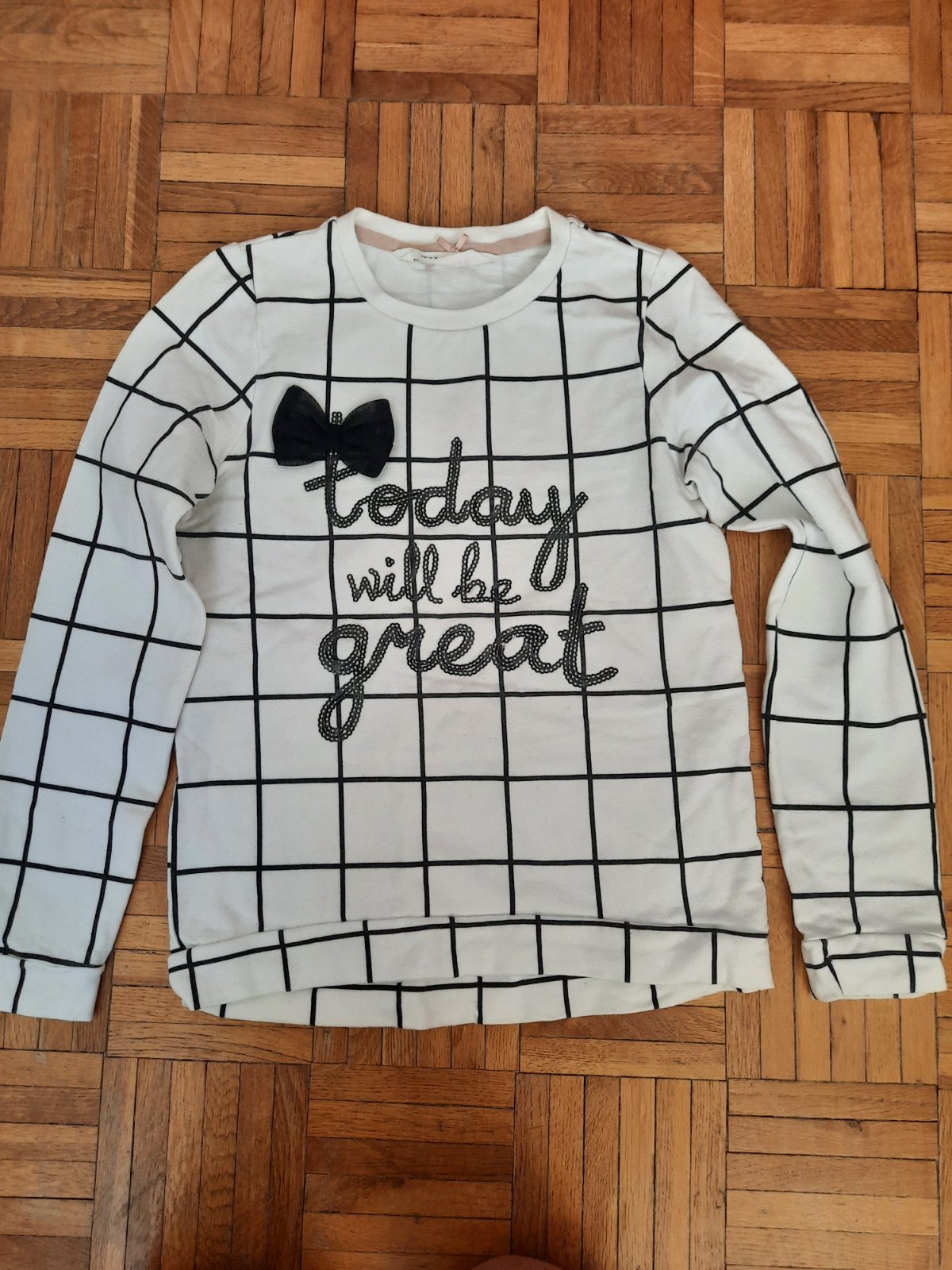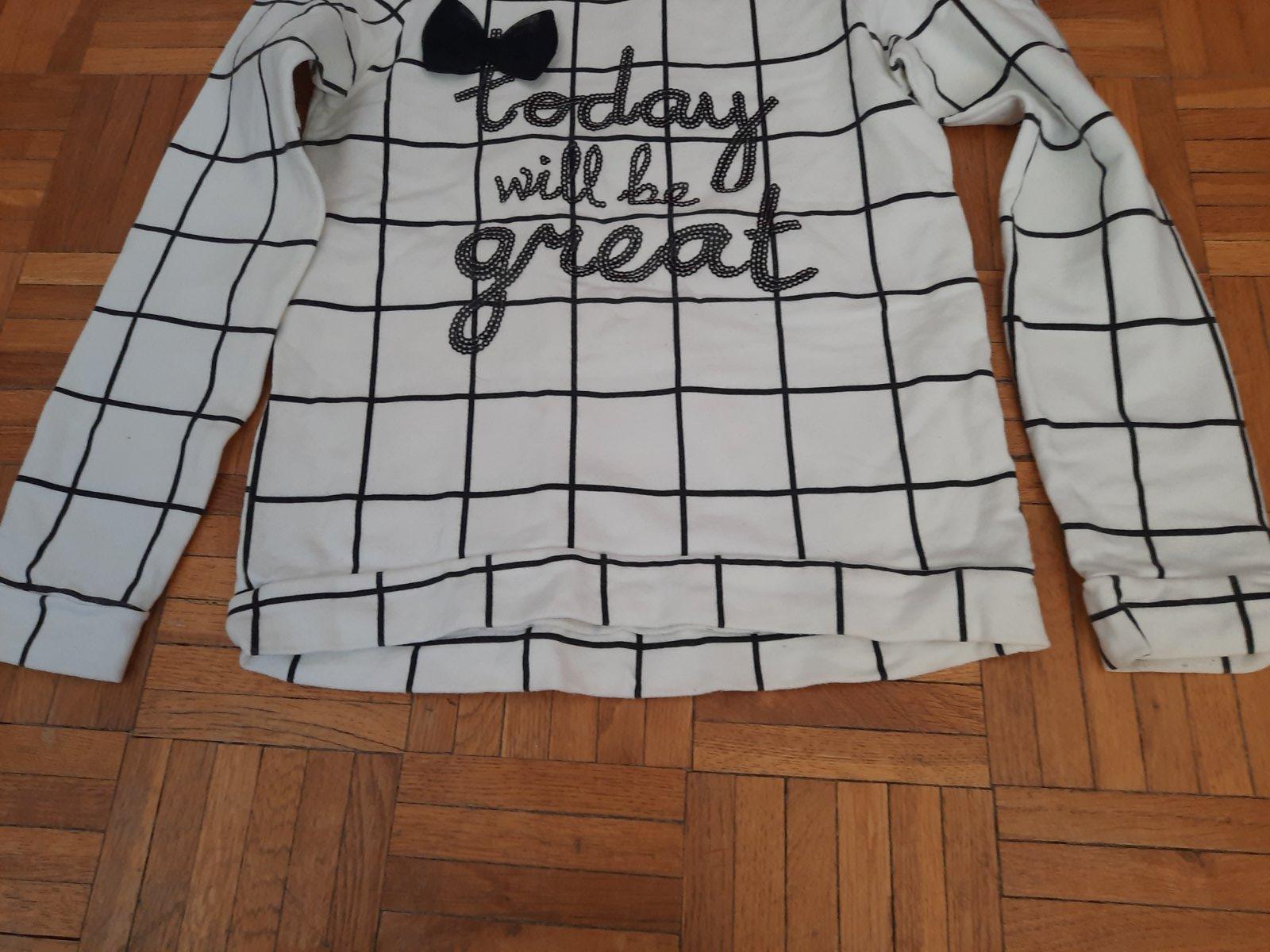 Veľmi pekný pulóvrik/ mikina vo výbornom stave. Vpredu sú našité flitre- nápis. Zadná strana je o niečo dlhšia. Na rukávoch aj spodku je manžeta.