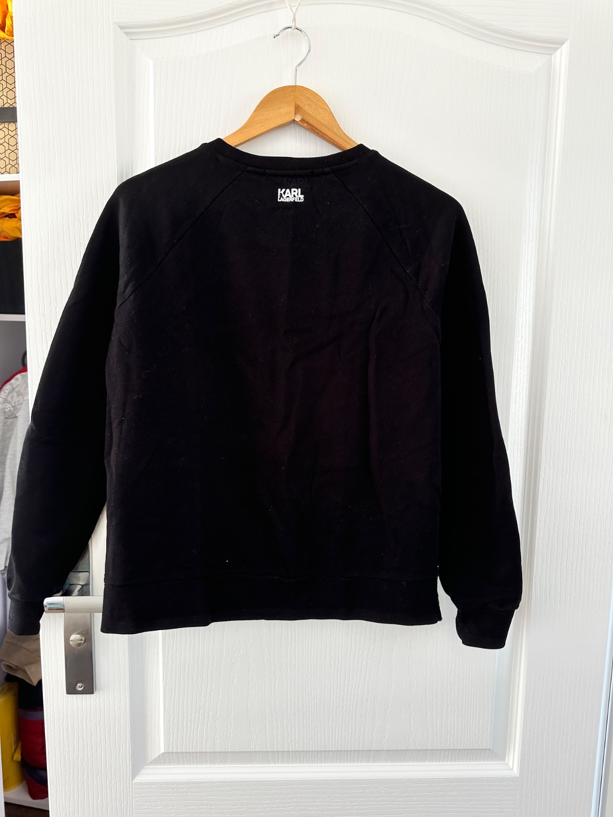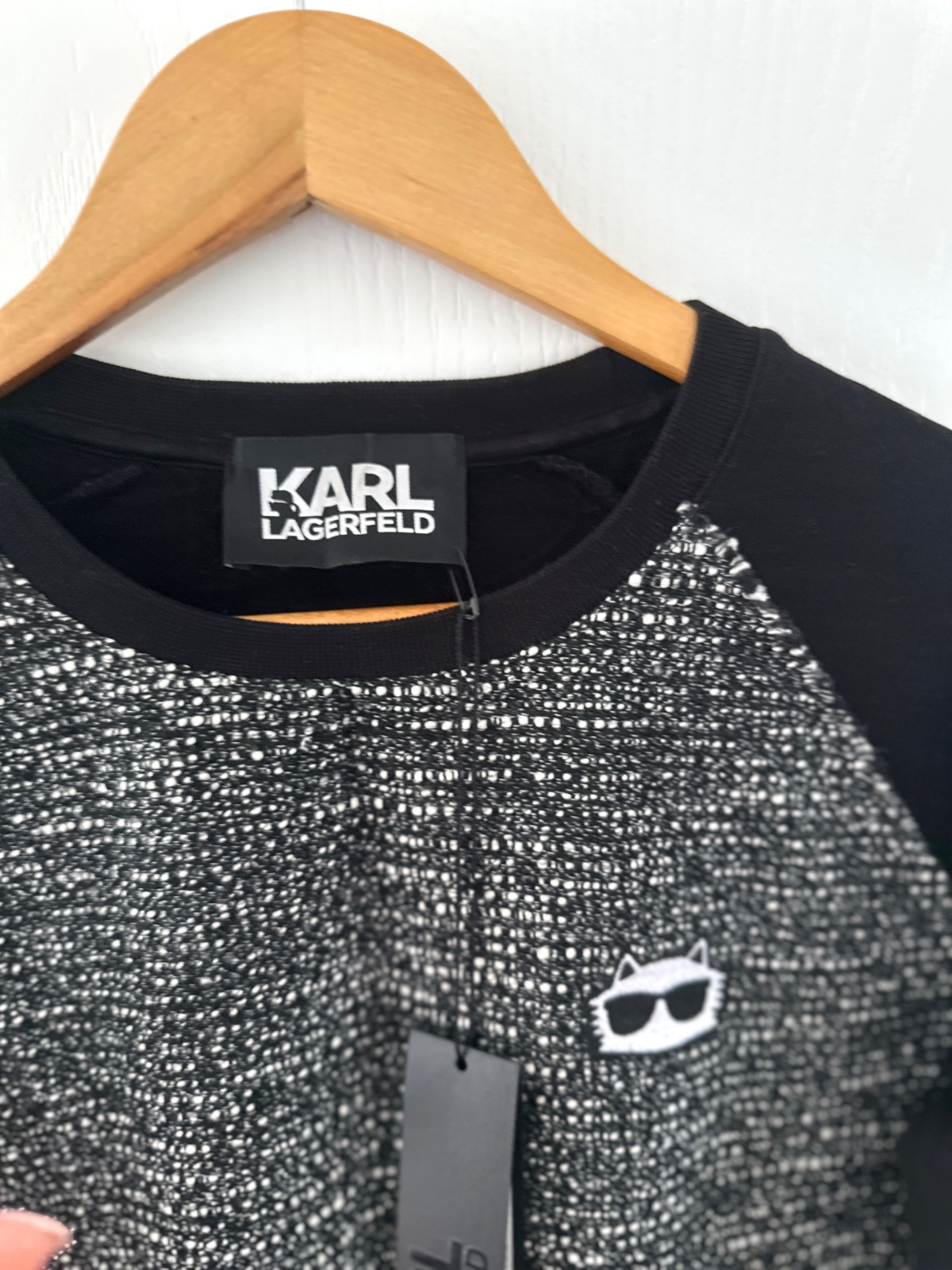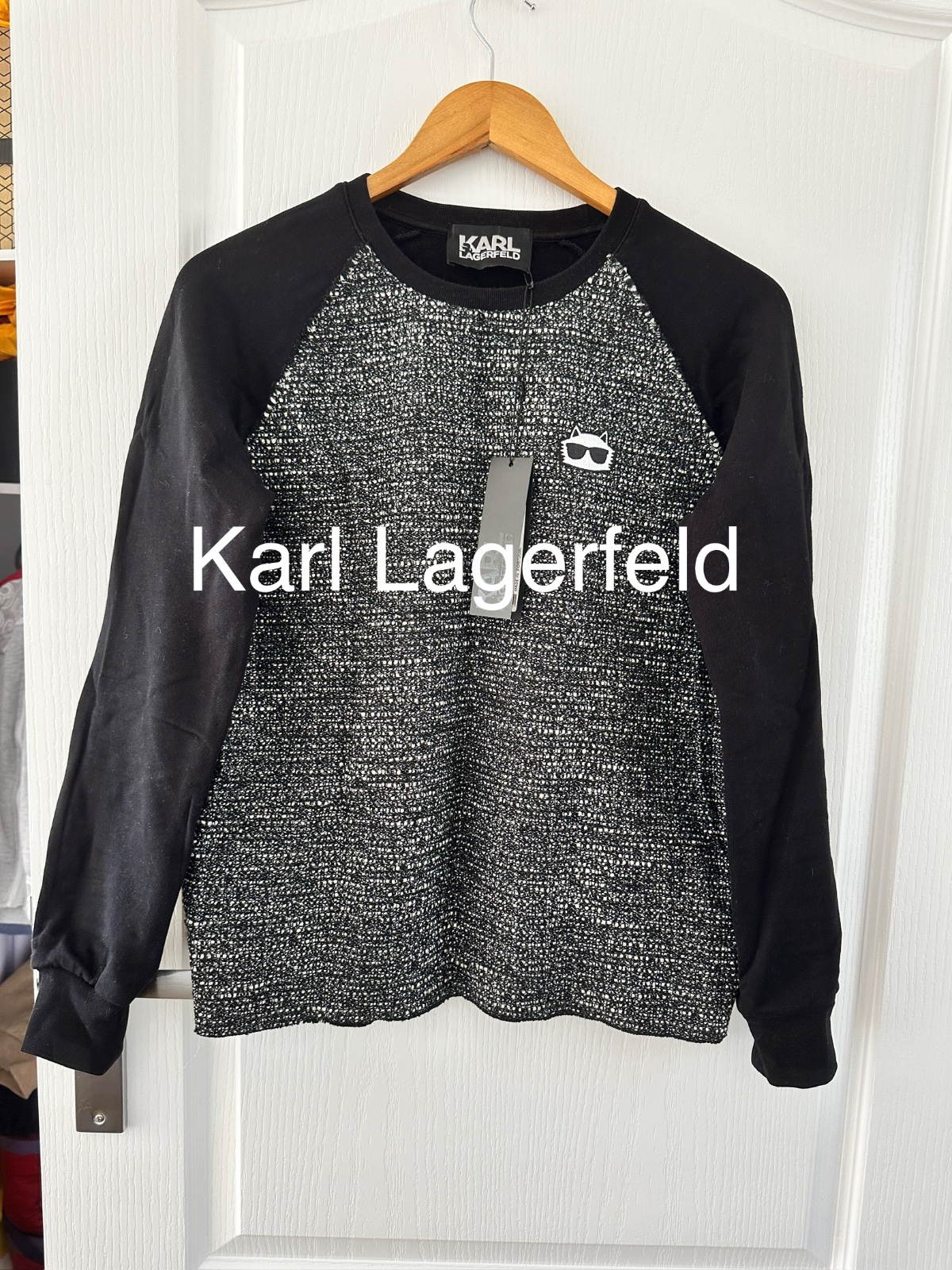 Nová mikina Karl Lagerfeld. Predná strana svetra je v štýle Chanel, to znamená, že je vyrobená z tkaného materiálu v čiernej a bielej farbe. Navyše na pravej strane je charakteristická náplasť v podobe hlavy bielej mačky. Rukávy a chrbát sú z čiernej bavlny. Navyše na zadnej strane pri krku je logo značky v bielej farbe. Mikina má rovný strih. Je veľmi univerzálna, čo znamená, že môže byť stylizovana elegantne alebo športovo. Veľkosť na visačke je S, ale sedí aj na M. Mikina je nová s visačkami. Bola kúpená v predajni Pandorf za 89€.